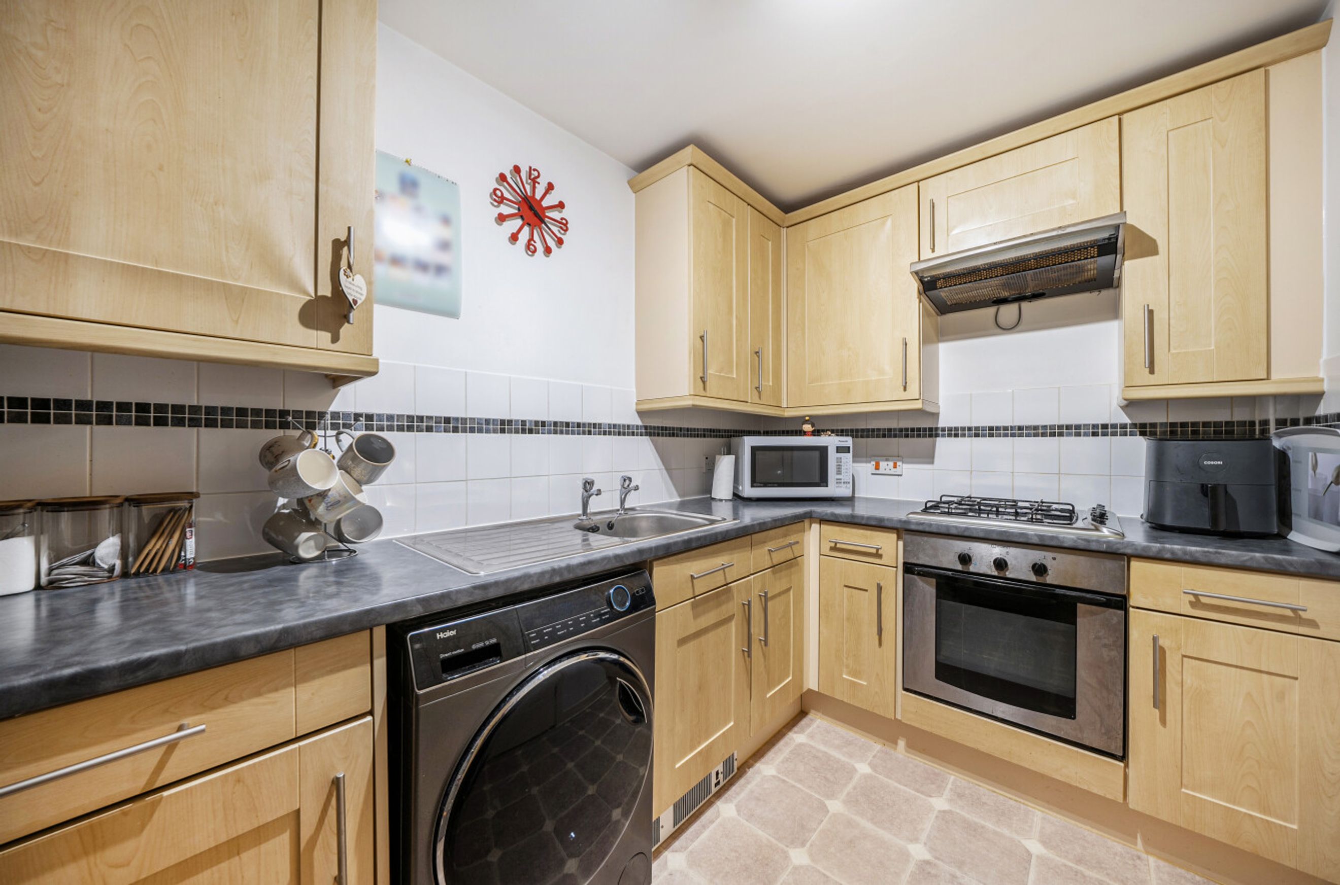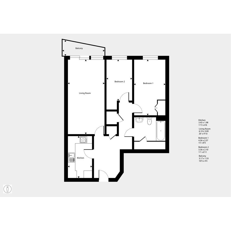 Featuring an open-plan living / dining room with a door to your balcony. The kitchen is fitted with an oven and gas hob. There are two comfortable bedrooms with a wardrobe to the master. The bathroom has a white suite.