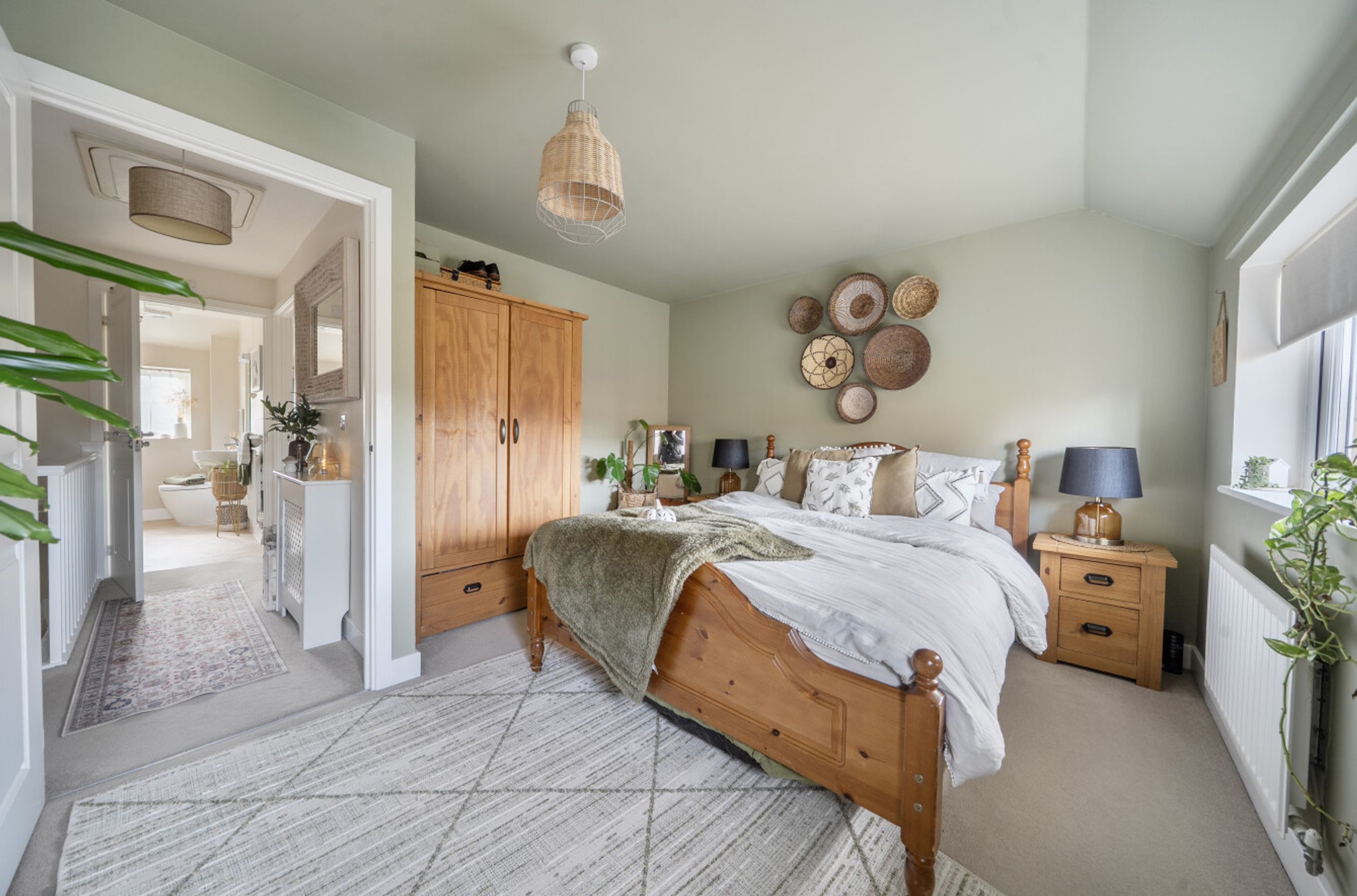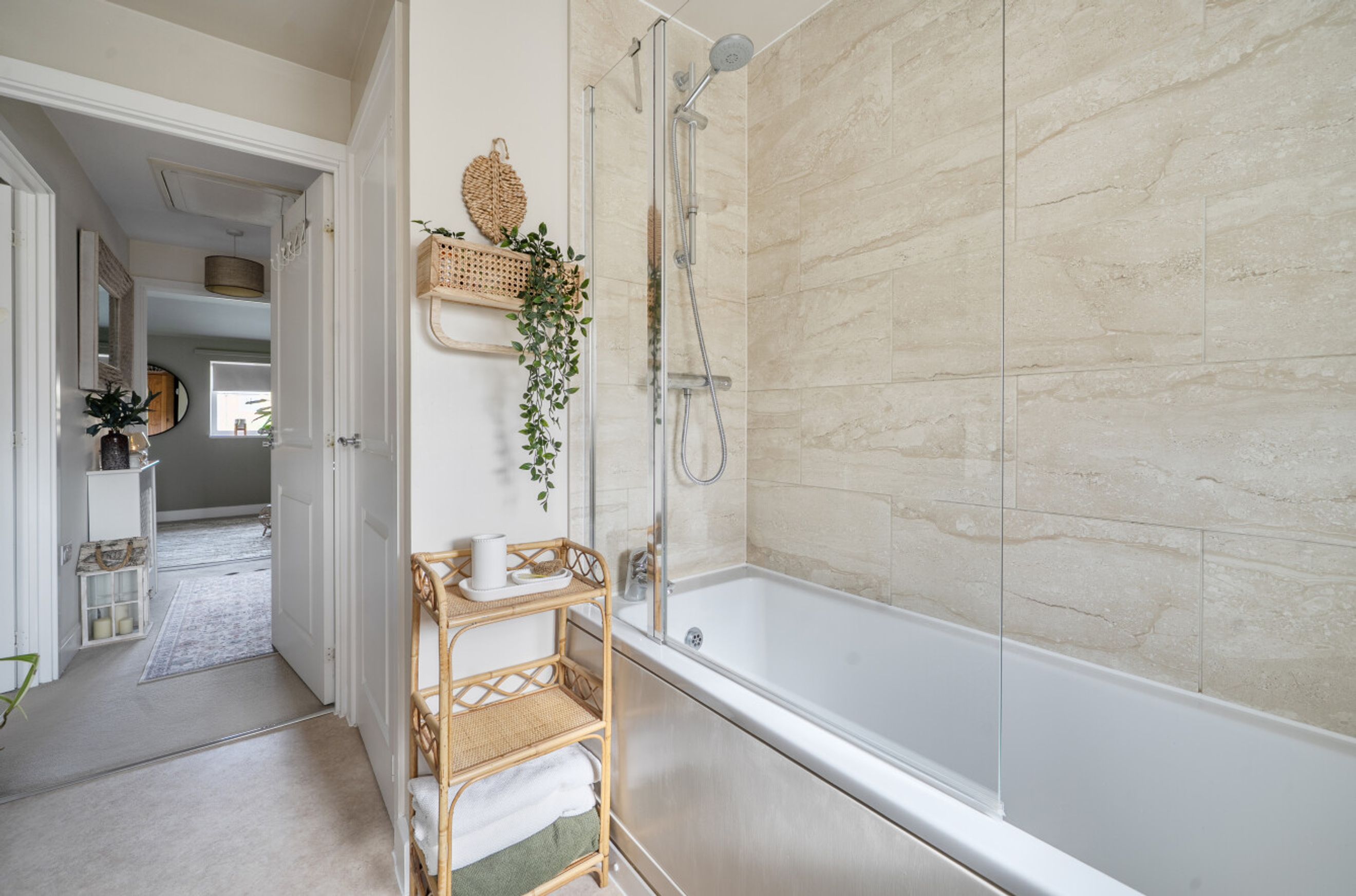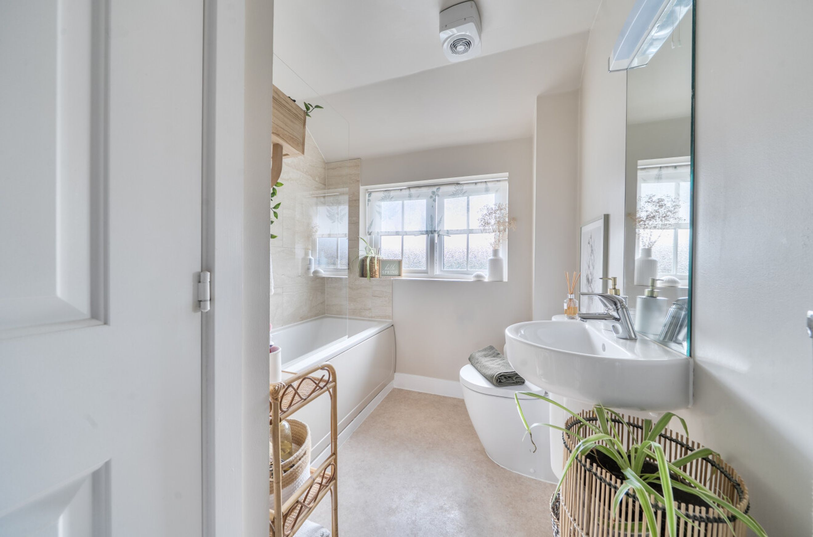 Upstairs, there are two double bedrooms. The bathroom has a modern, white suite.