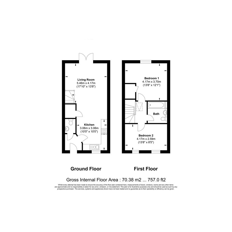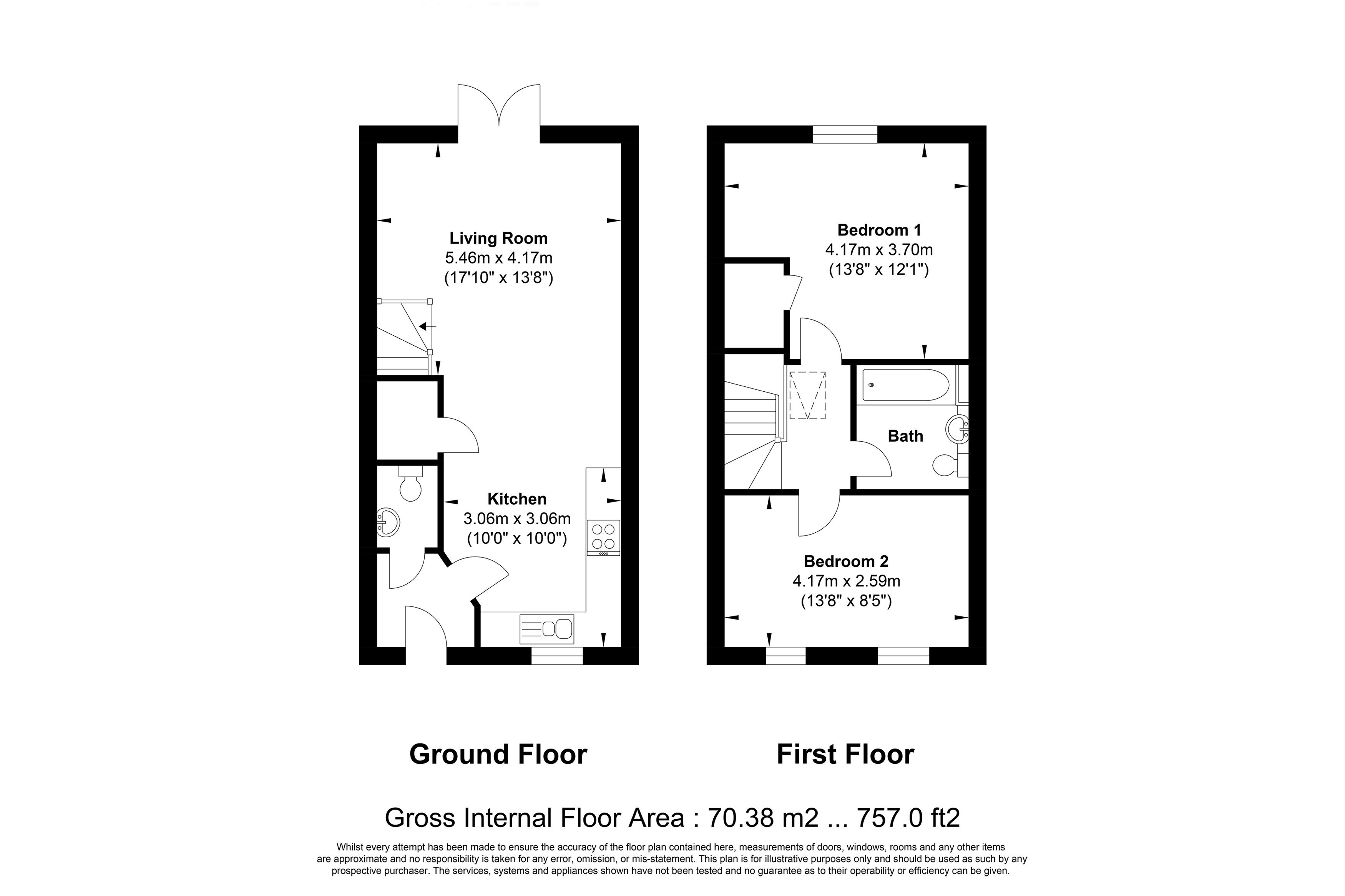 A well-designed two-bedroom home blending modern practicality and comfort. The entrance opens into a generous kitchen positioned at the front of the property offering ample space for cooking and dining. Beyond this you will discover a spacious living room stretching the full width of the home, featuring French doors that open directly onto the rear garden, extending the living space outdoors. A convenient ground-floor WC and a useful understairs cupboard complete the ground floor.