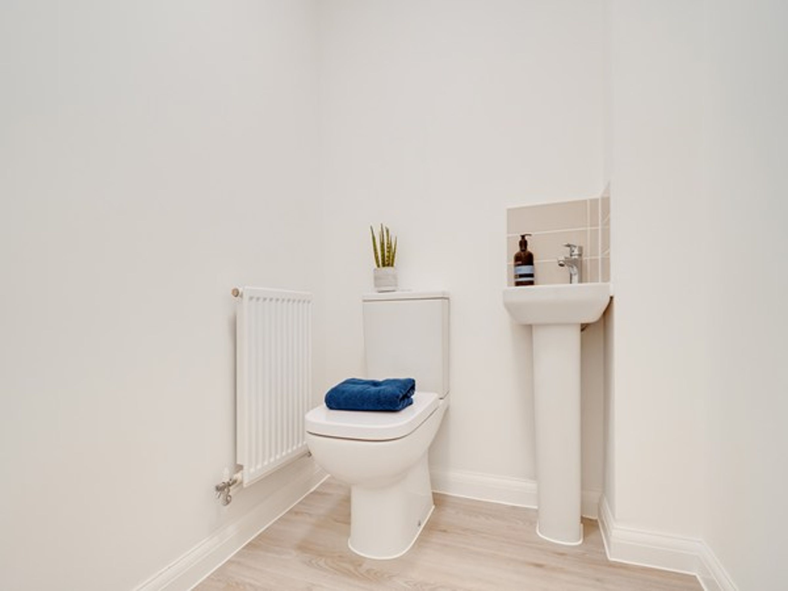 This beautifully presented, two storey one bedroom home has been thoughtfully designed for easy everyday living. On the ground floor, a bright and spacious open plan living and kitchen area provides a welcoming heart to the home. The modern kitchen is fitted with contemporary wall and base units, a built in oven and hob, an overhead extractor fan, and is finished with a complementary worktop. A downstairs WC completes the ground floor accommodation.