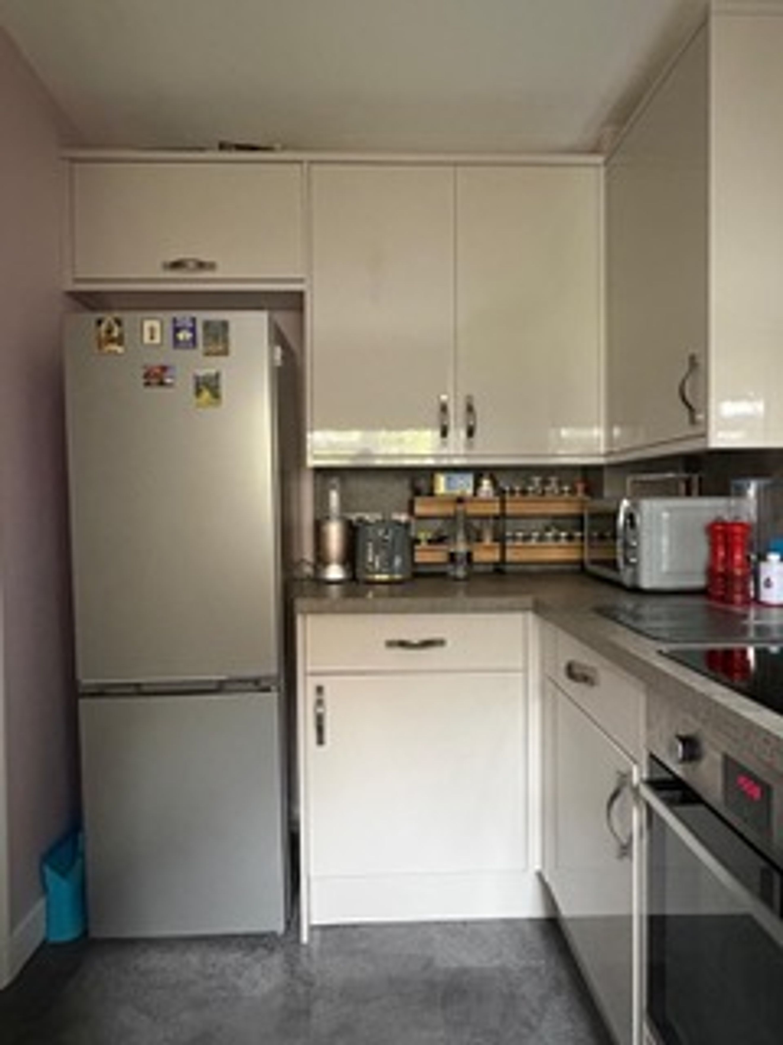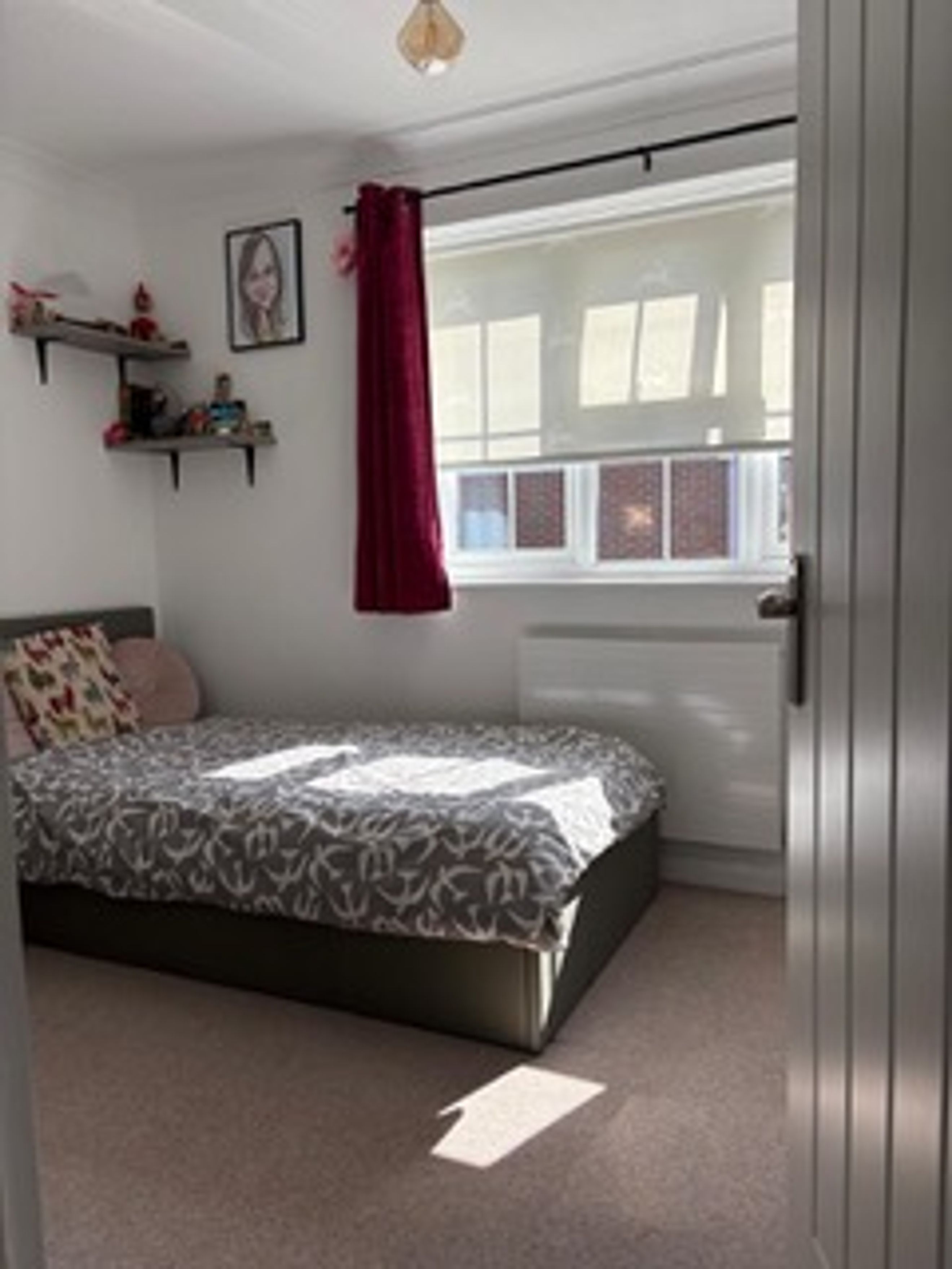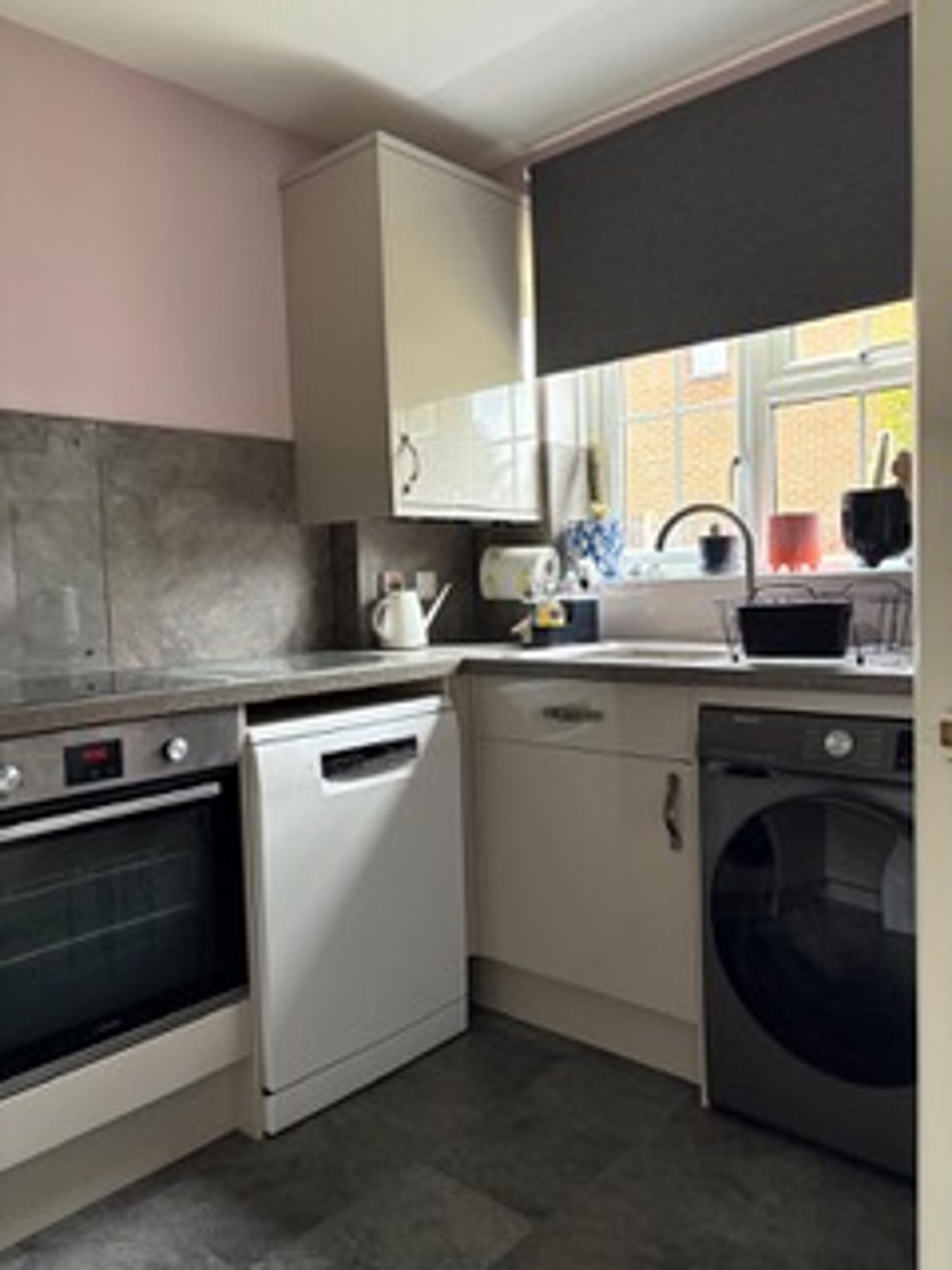 On the ground floor, the entrance hallway includes a useful under‑stairs storage cupboard. The kitchen provides ample cupboard space and is fitted with an oven, hob and extractor, along with designated space for your own washing machine and fridge‑freezer. The separate living room is bright and spacious, featuring an additional storage cupboard and double doors opening out to the private rear garden.