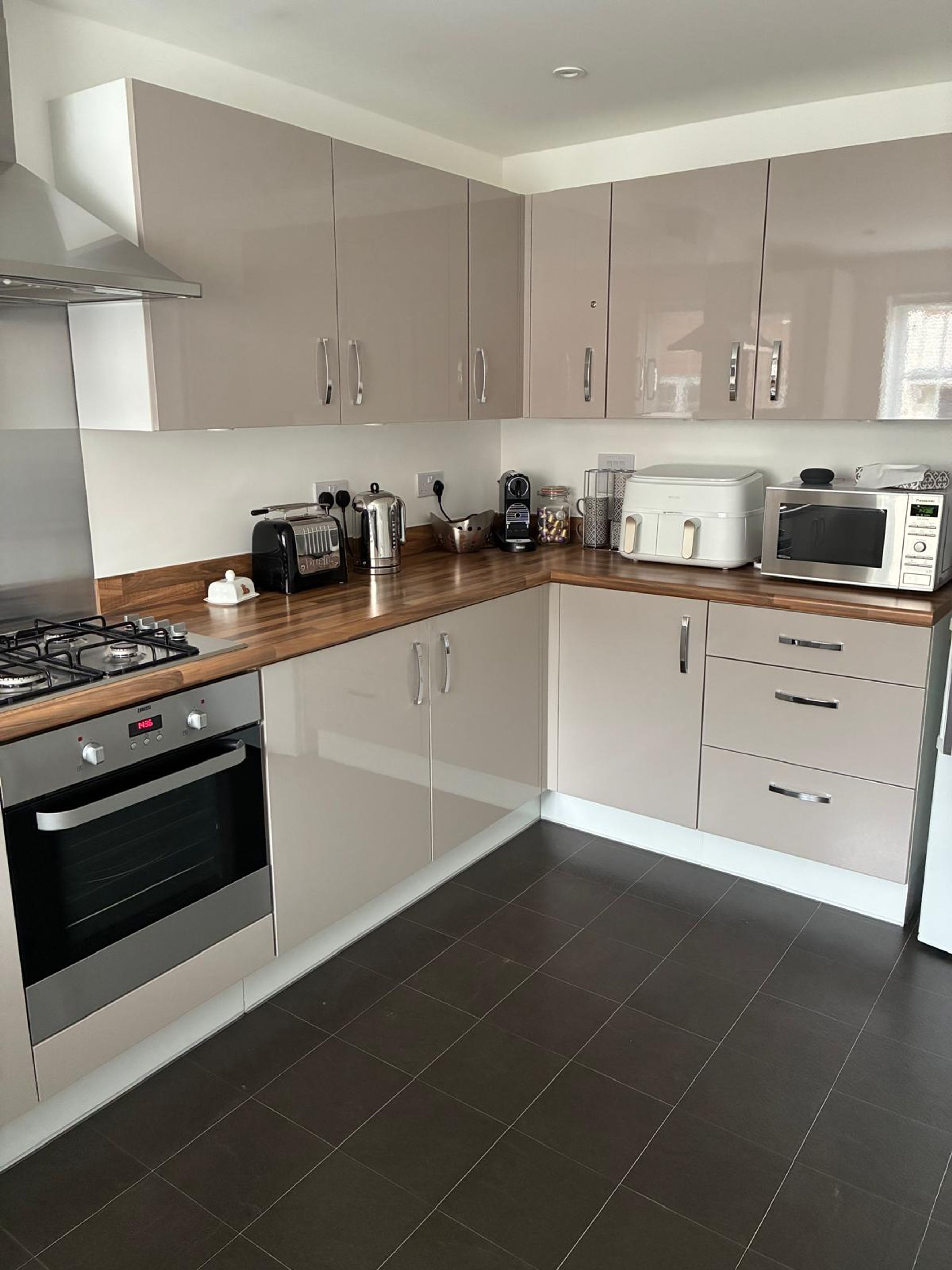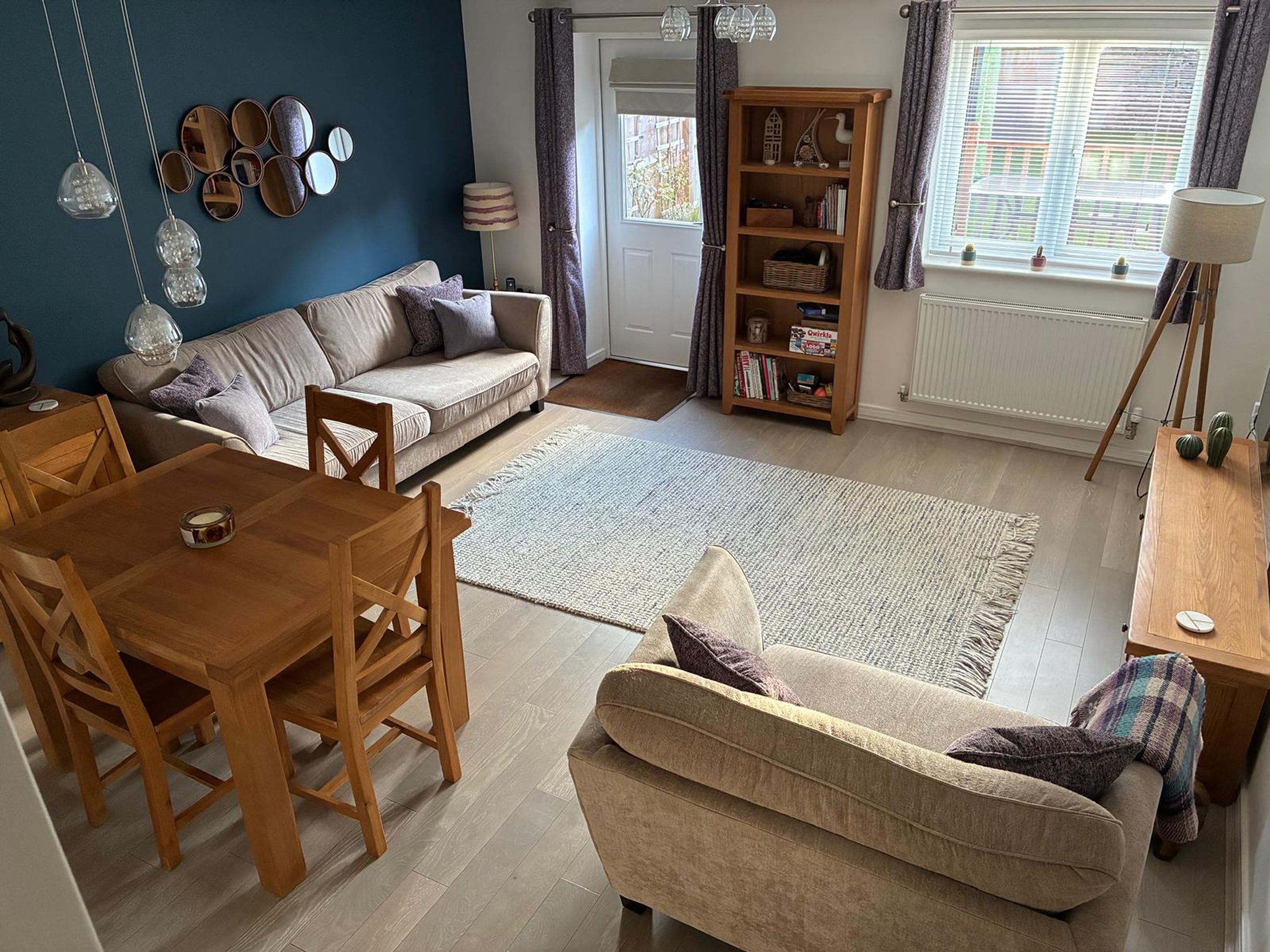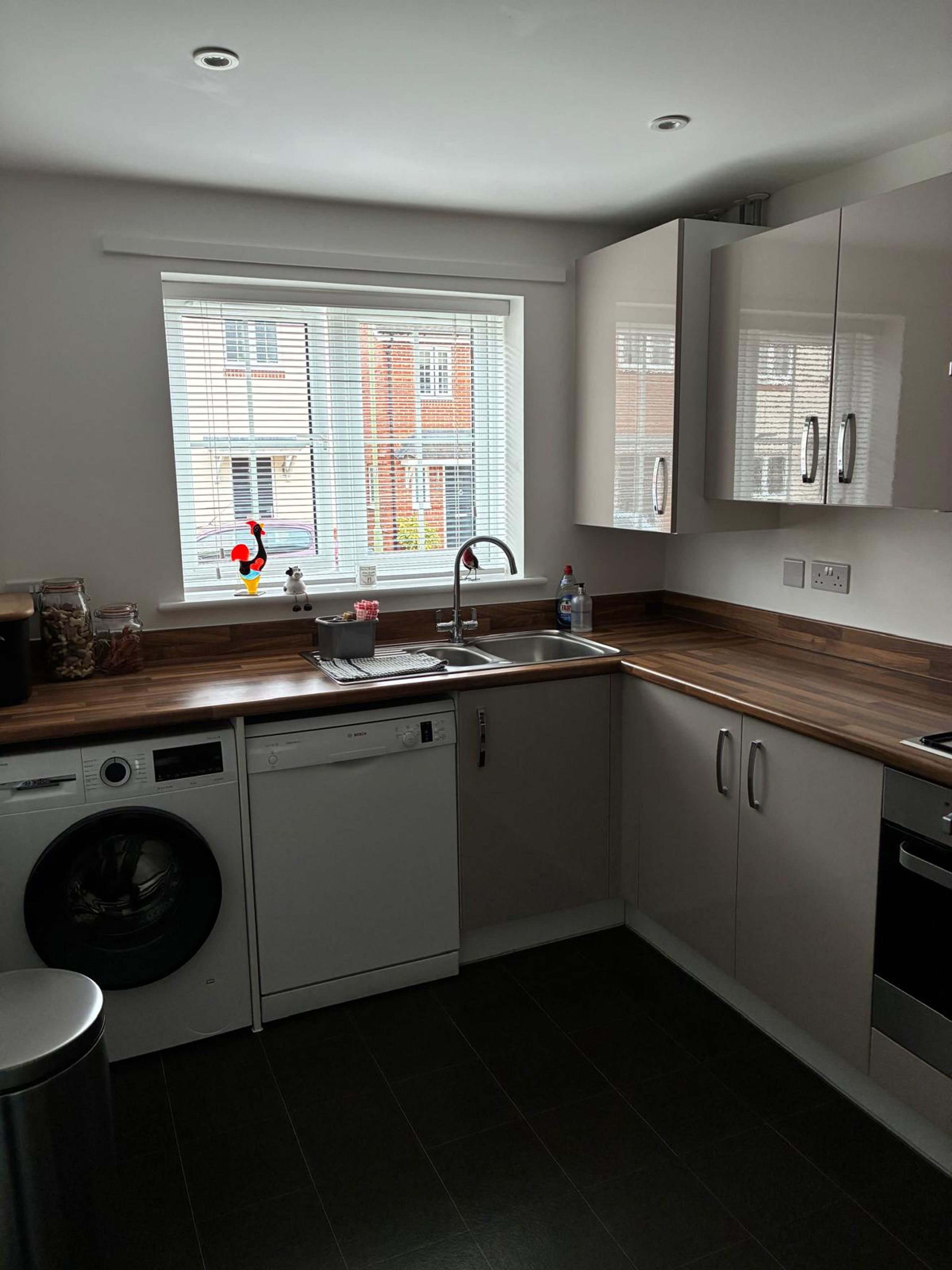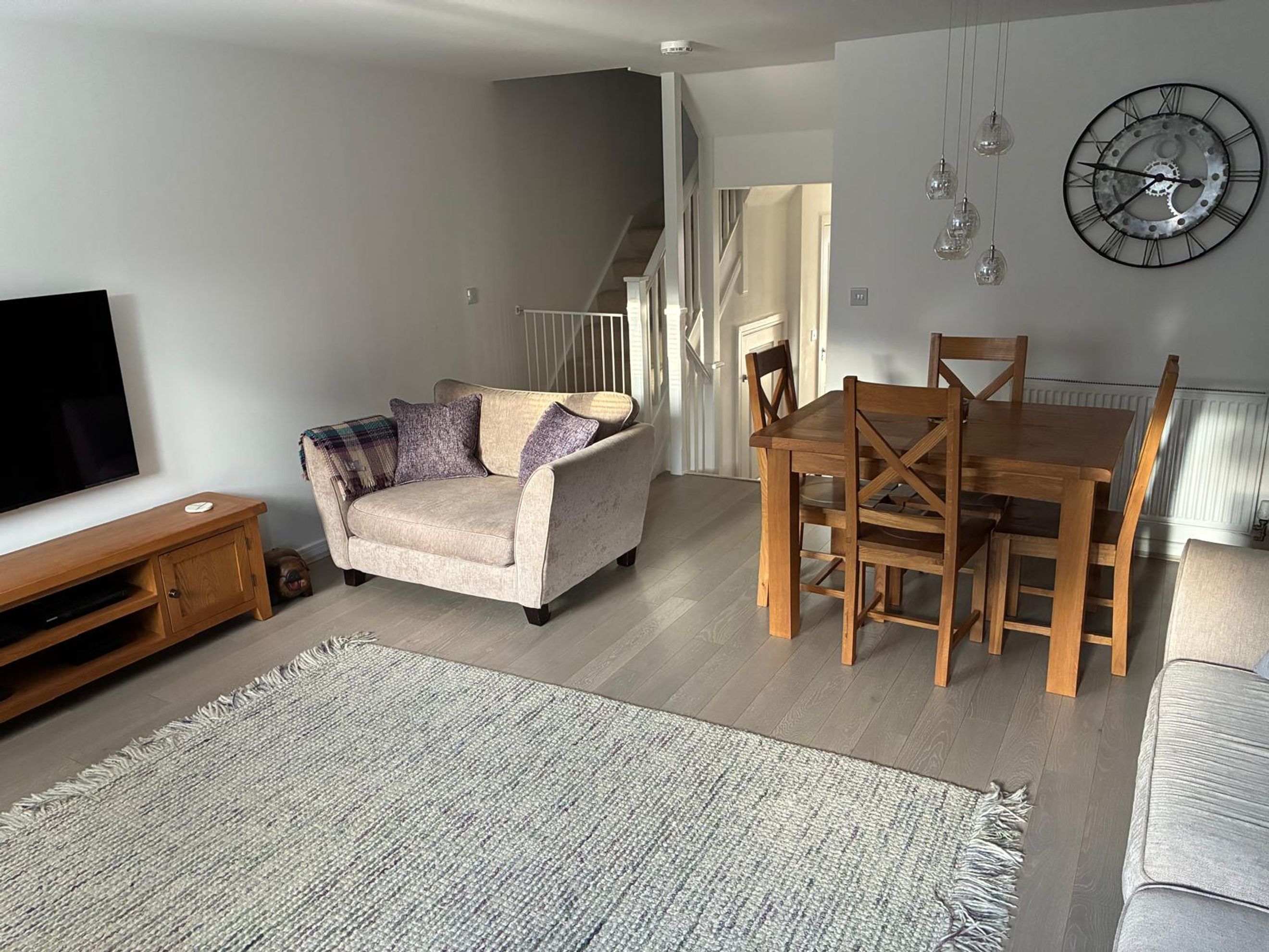 The ground floor features a welcoming entrance hallway with a cloakroom and useful storage cupboard, leading to a well‑equipped kitchen with ample cabinet space, an oven, hob and extractor, along with room for a washing machine and fridge‑freezer. A spacious separate living room sits at the rear of the property and opens directly onto the private garden.