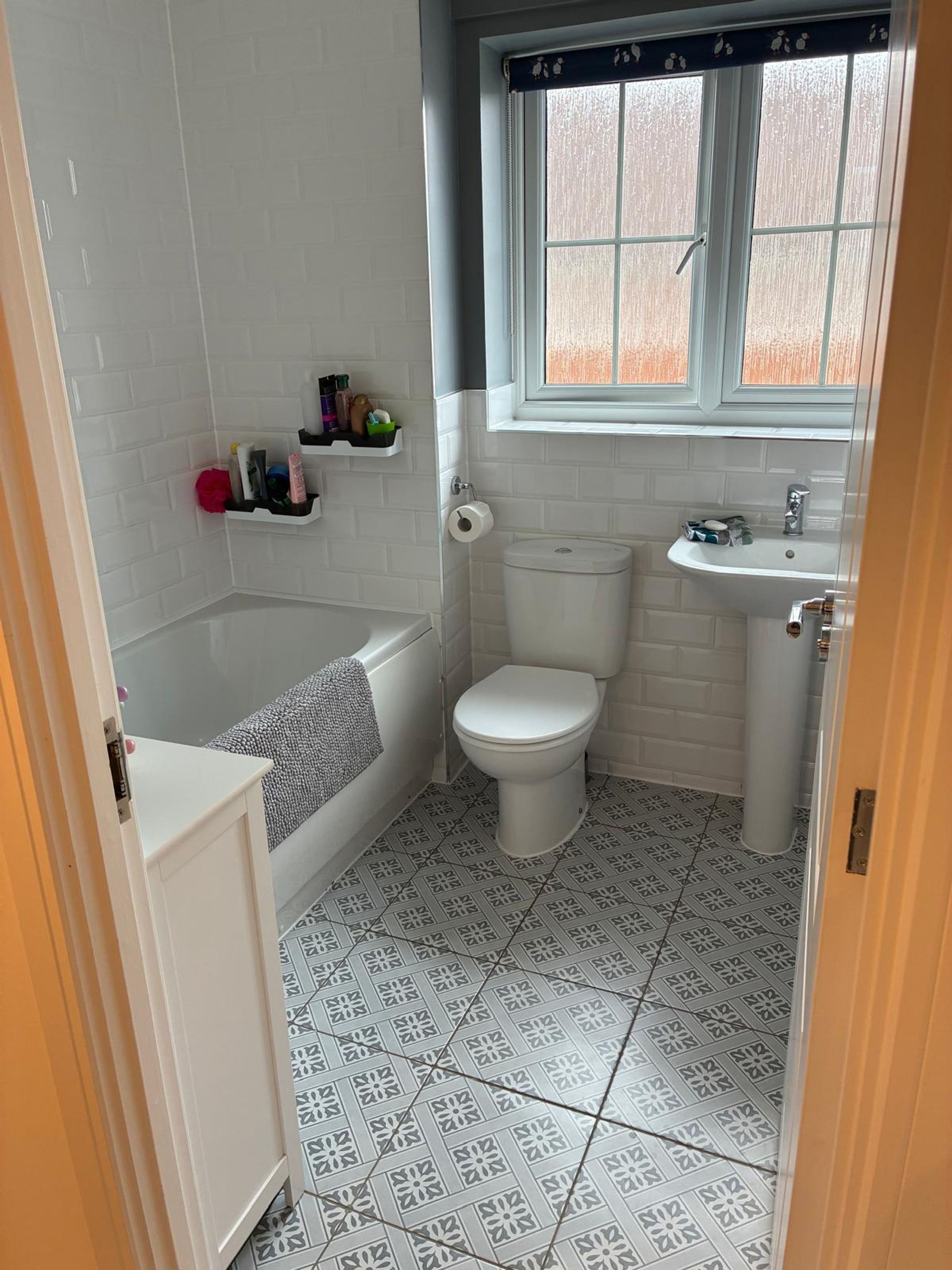 Upstairs, the home offers one double bedroom and two singles, along with a landing storage cupboard and a family bathroom fitted with a three‑piece suite and shower over the bath.