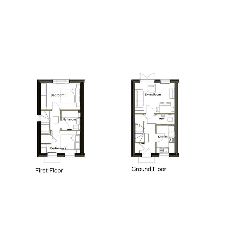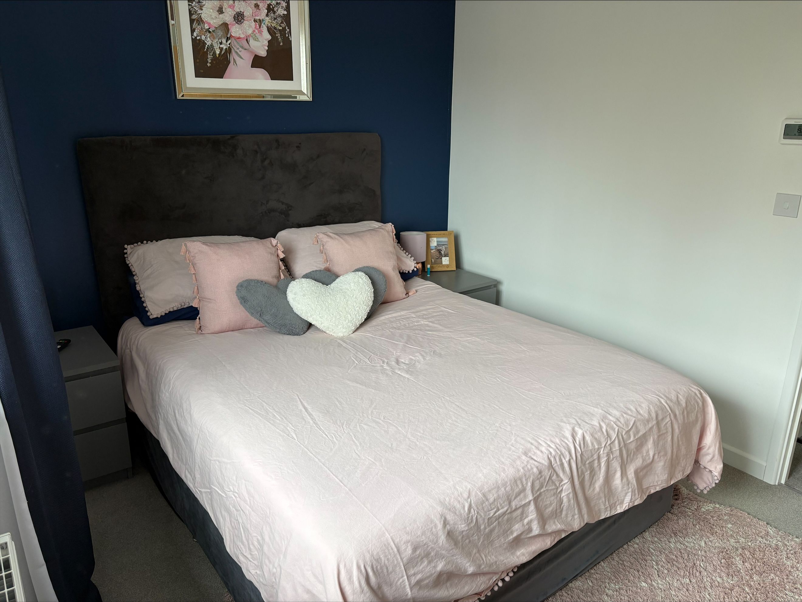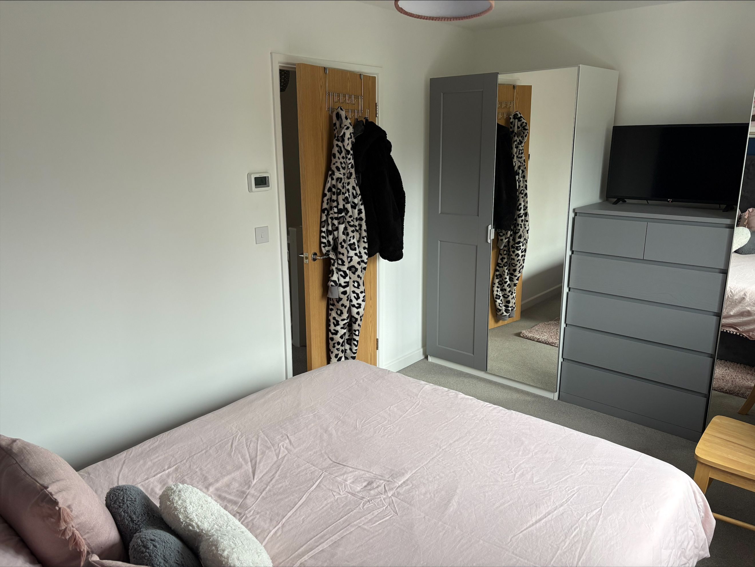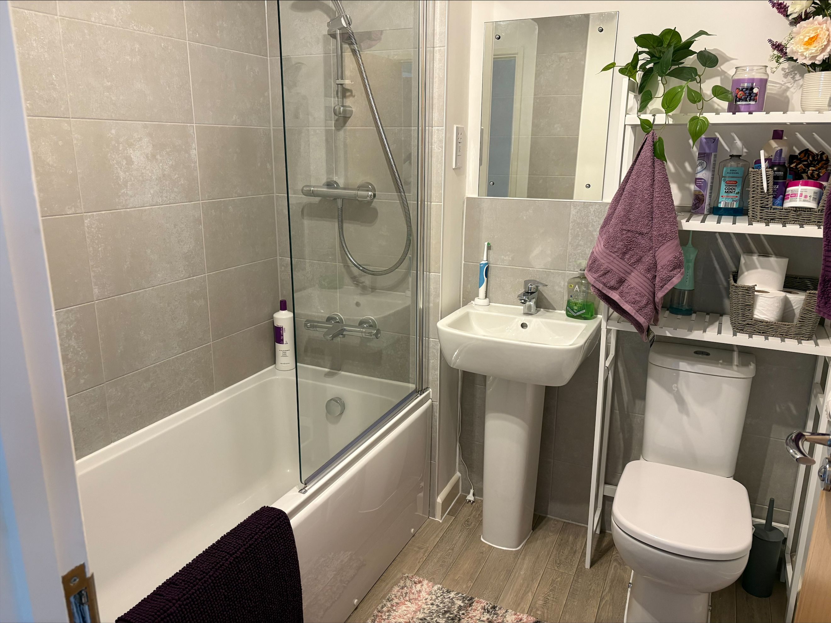 Upstairs, the property offers two double bedrooms, one positioned at the front of the house and one to the rear. Both rooms can accommodate double beds. There is additional storage on the landing, along with a family bathroom. The bathroom is fitted with a white suite and includes a shower over the bath with a glass shower screen. The room is finished with cashmere-coloured wall tiles and oak-effect vinyl flooring.