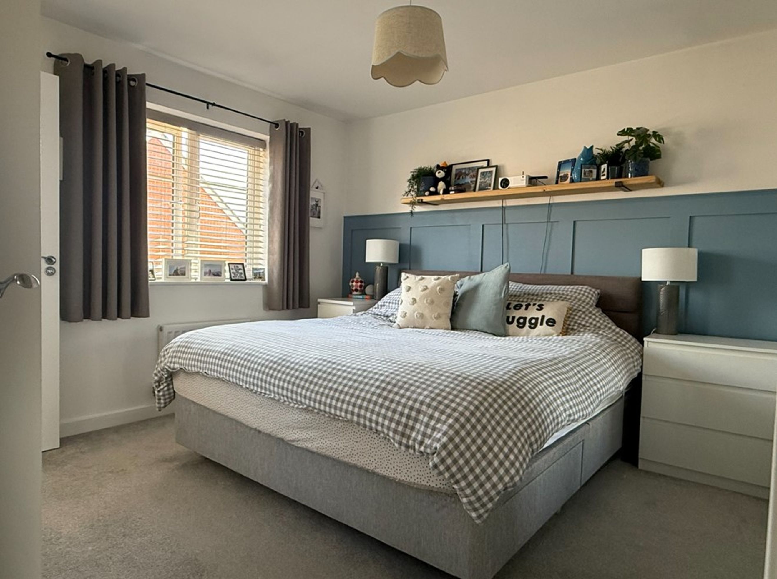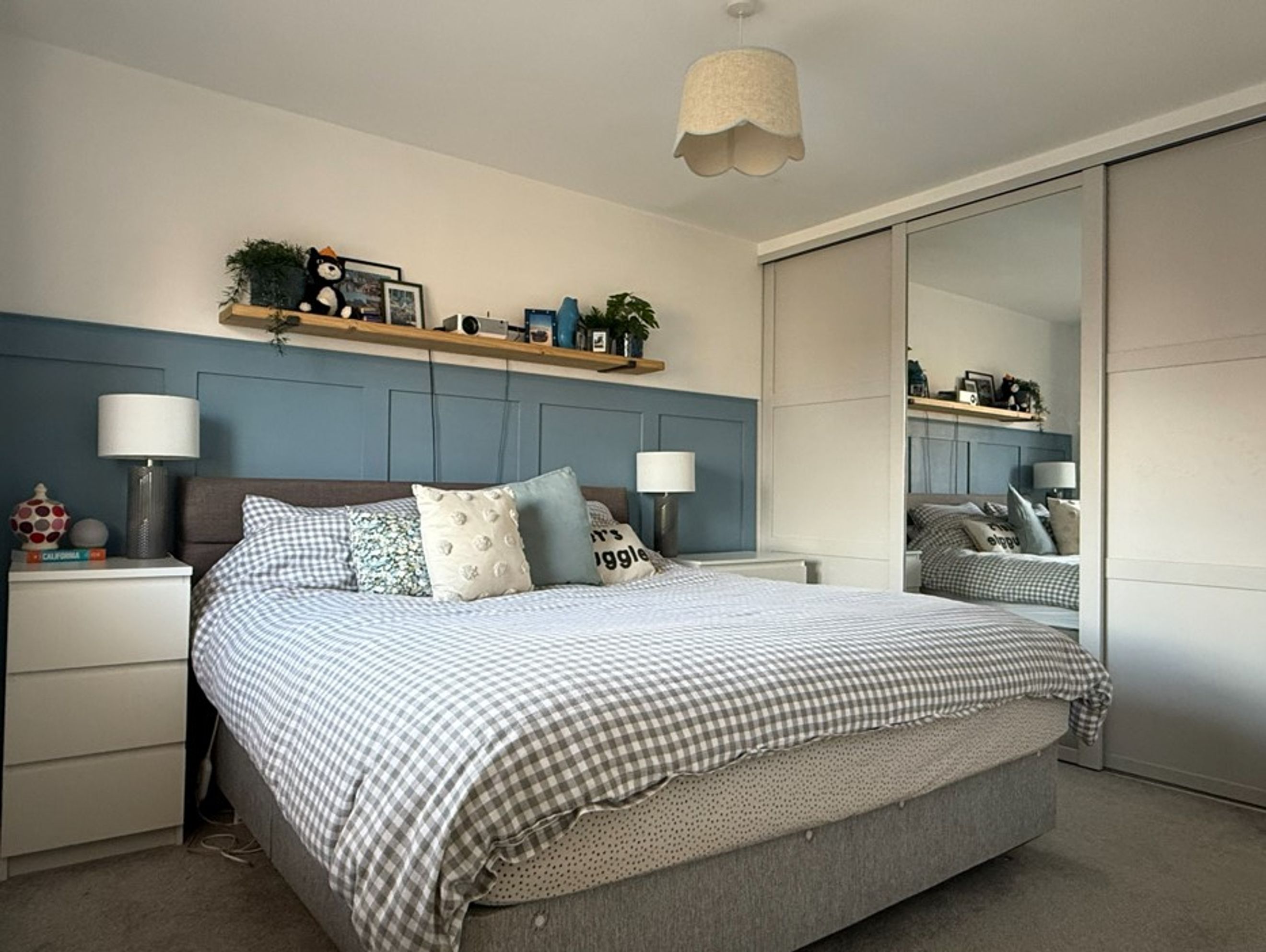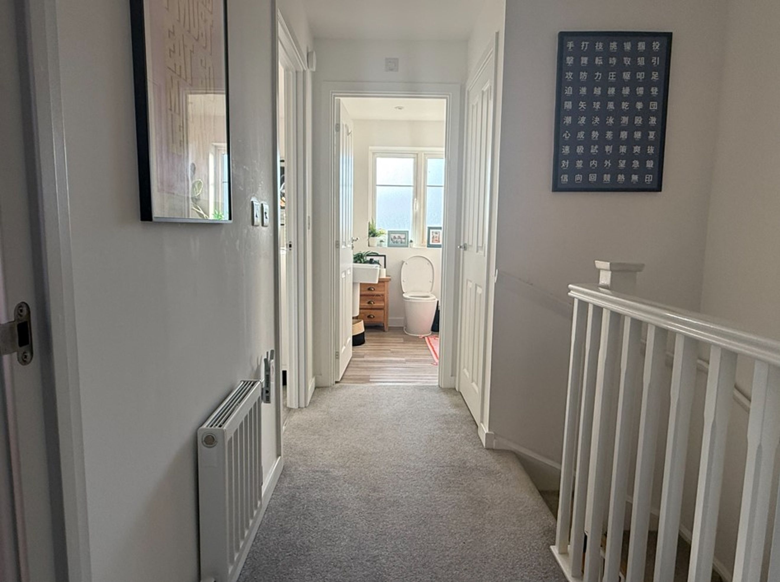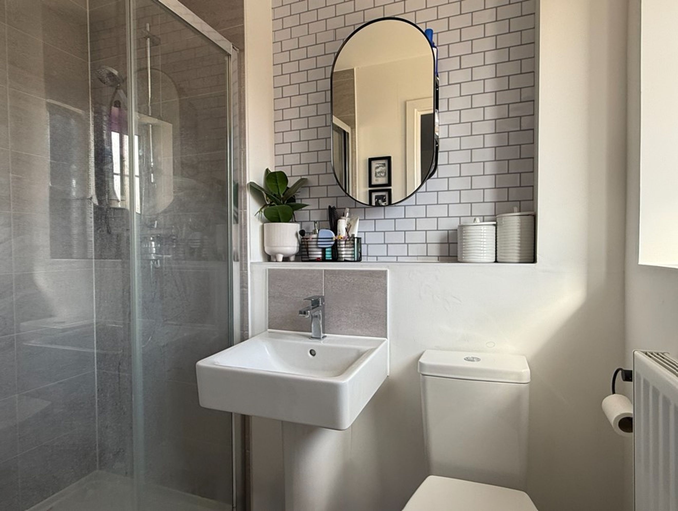 Upstairs are two generous double bedrooms, including a master with a built‑in storage cupboard and an ensuite featuring a walk‑in shower, alongside a family bathroom with a three‑piece suite and shower over the bath, plus additional landing storage.