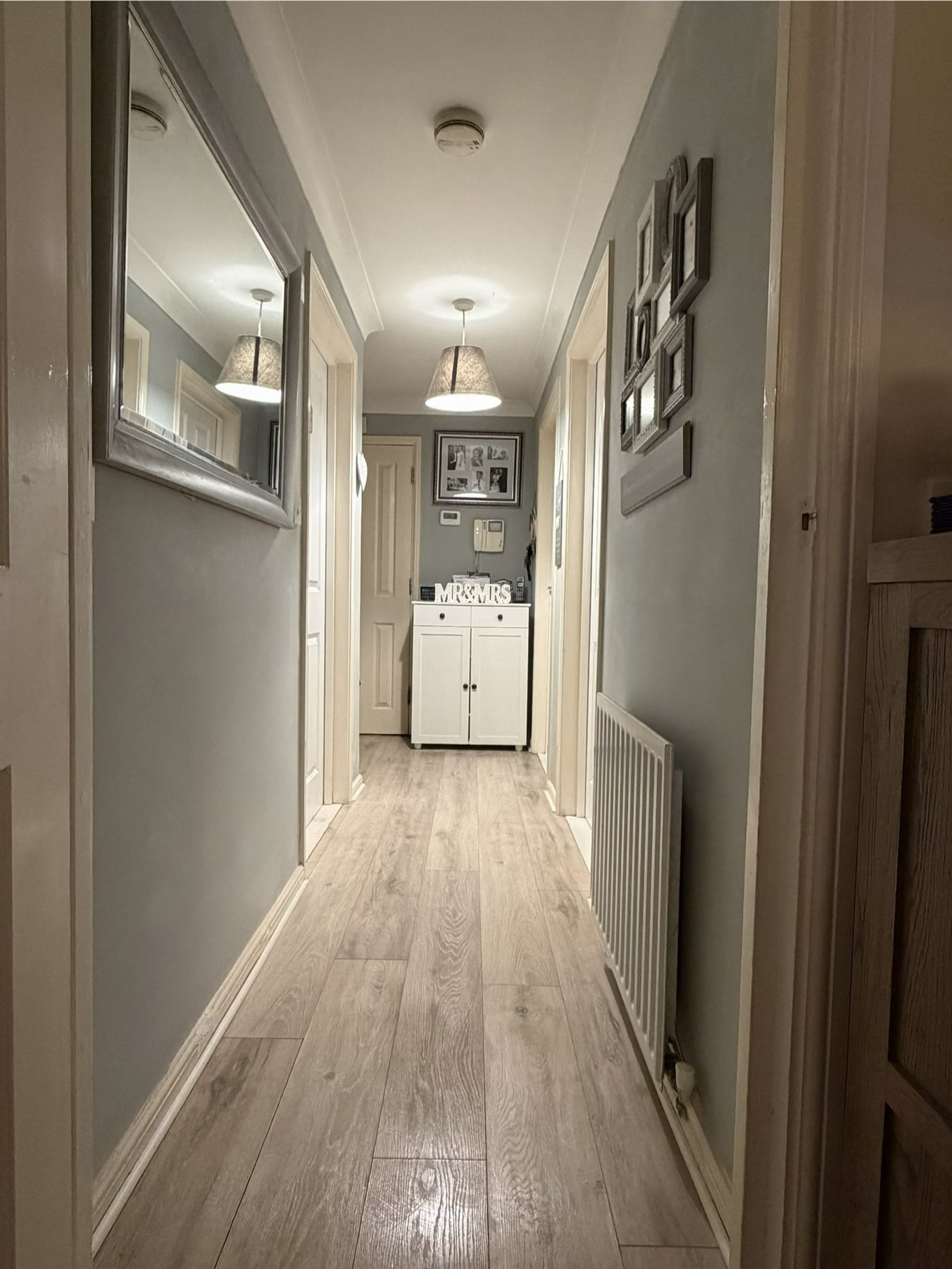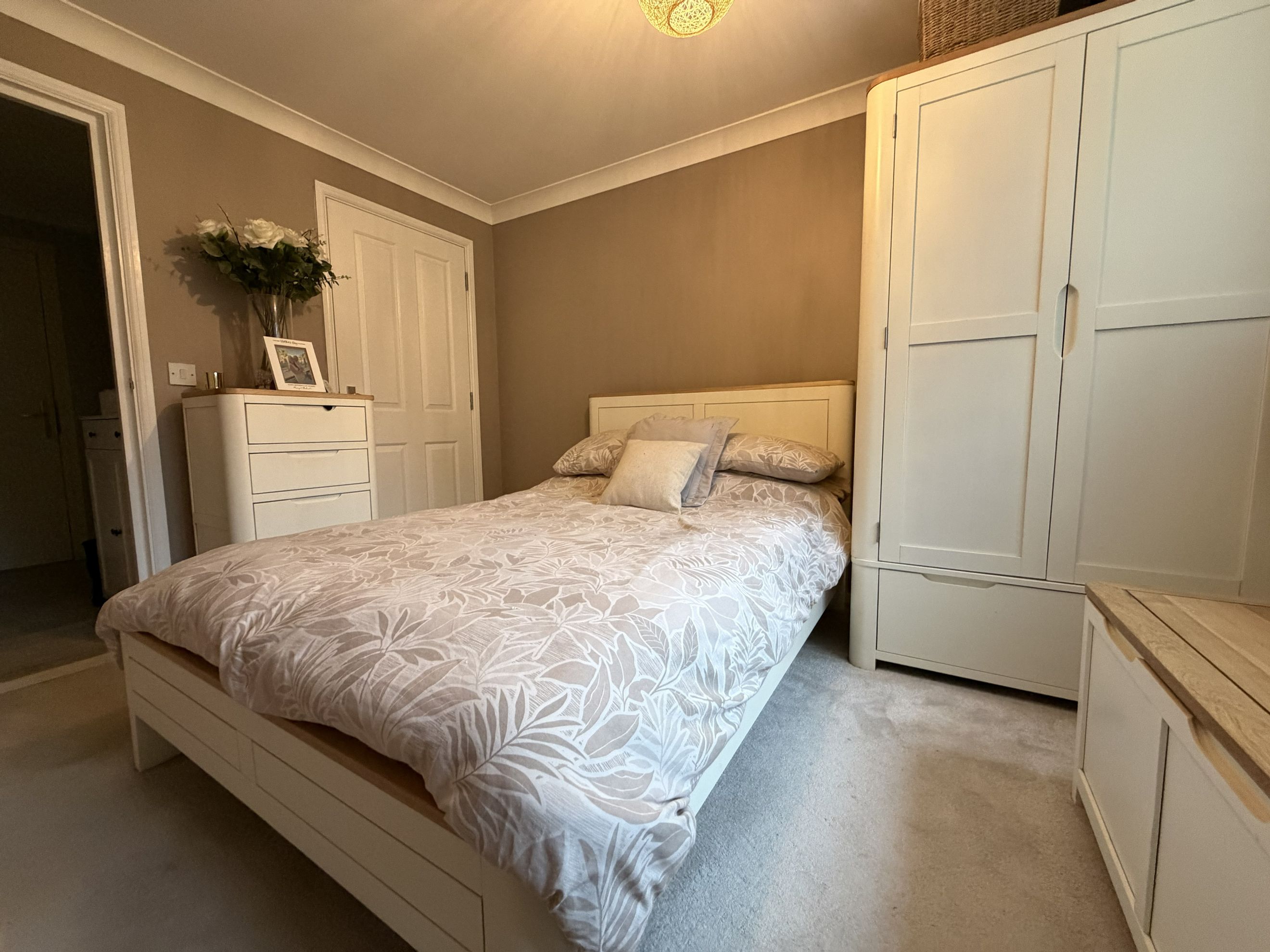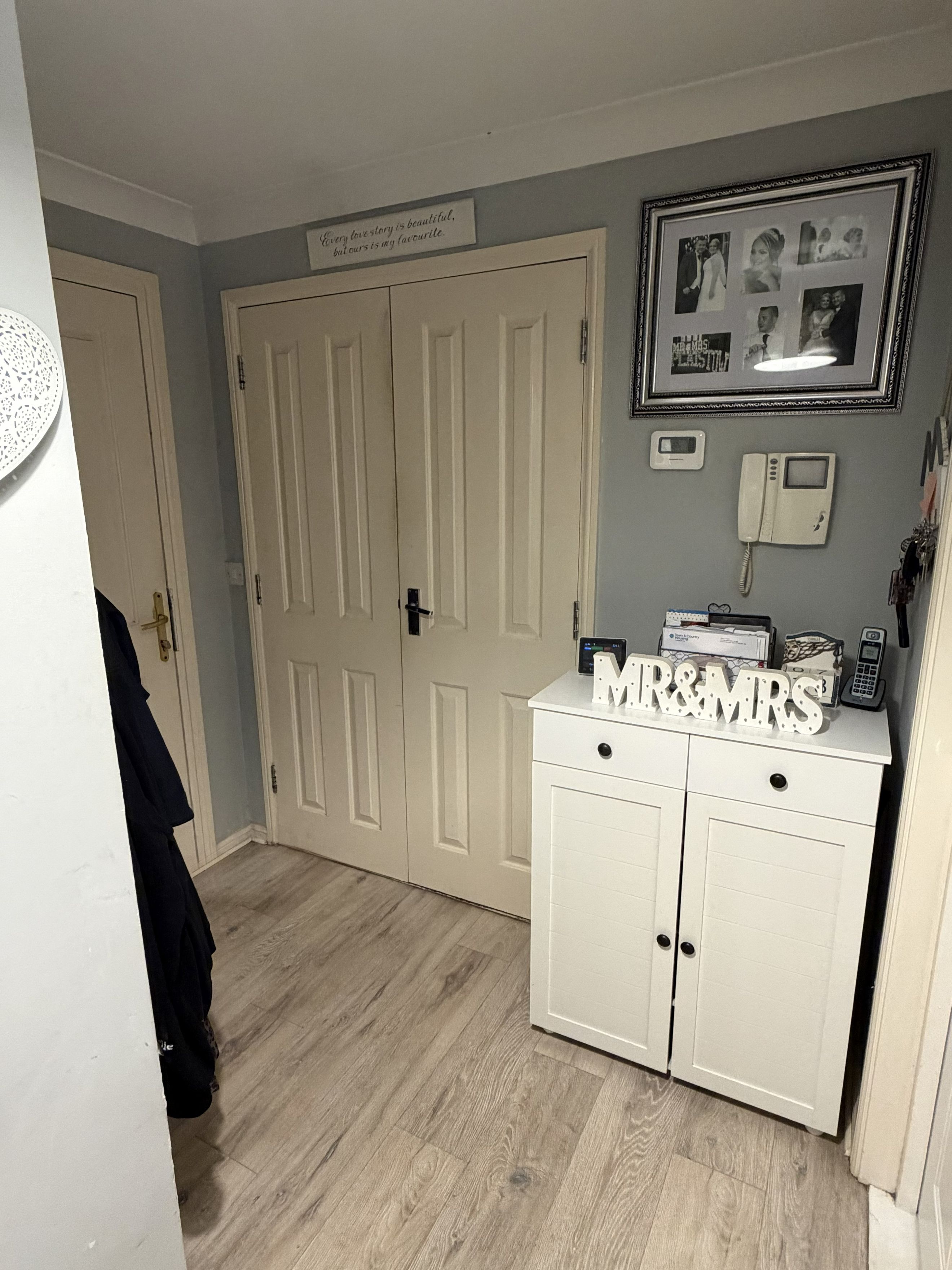 The apartment is accessed via a secure communal entrance with an intercom system, providing peace of mind for residents. Inside, the hallway benefits from a built-in storage cupboard, perfect for coats, shoes, and household essentials, helping to keep the living space neat and organised.