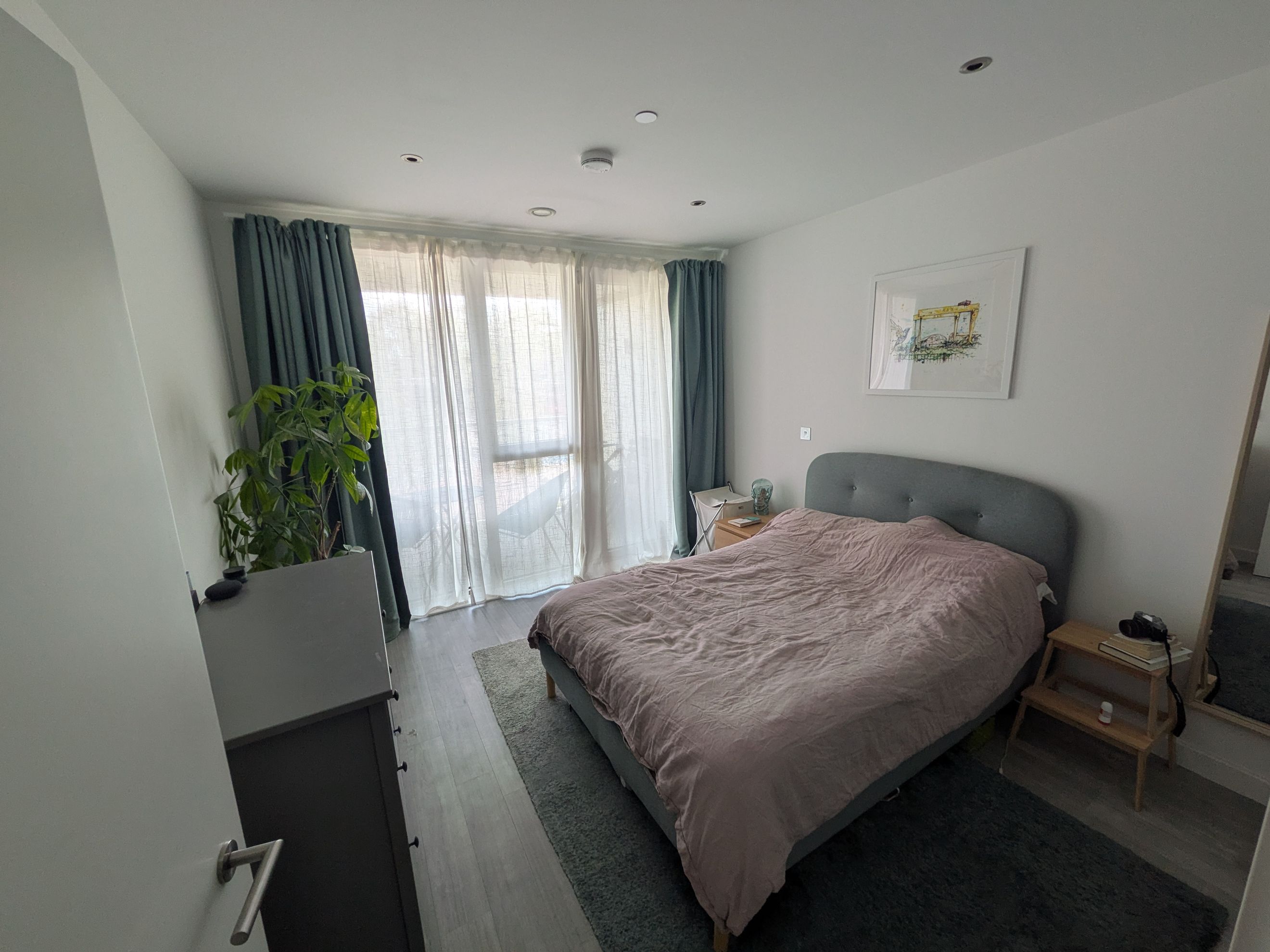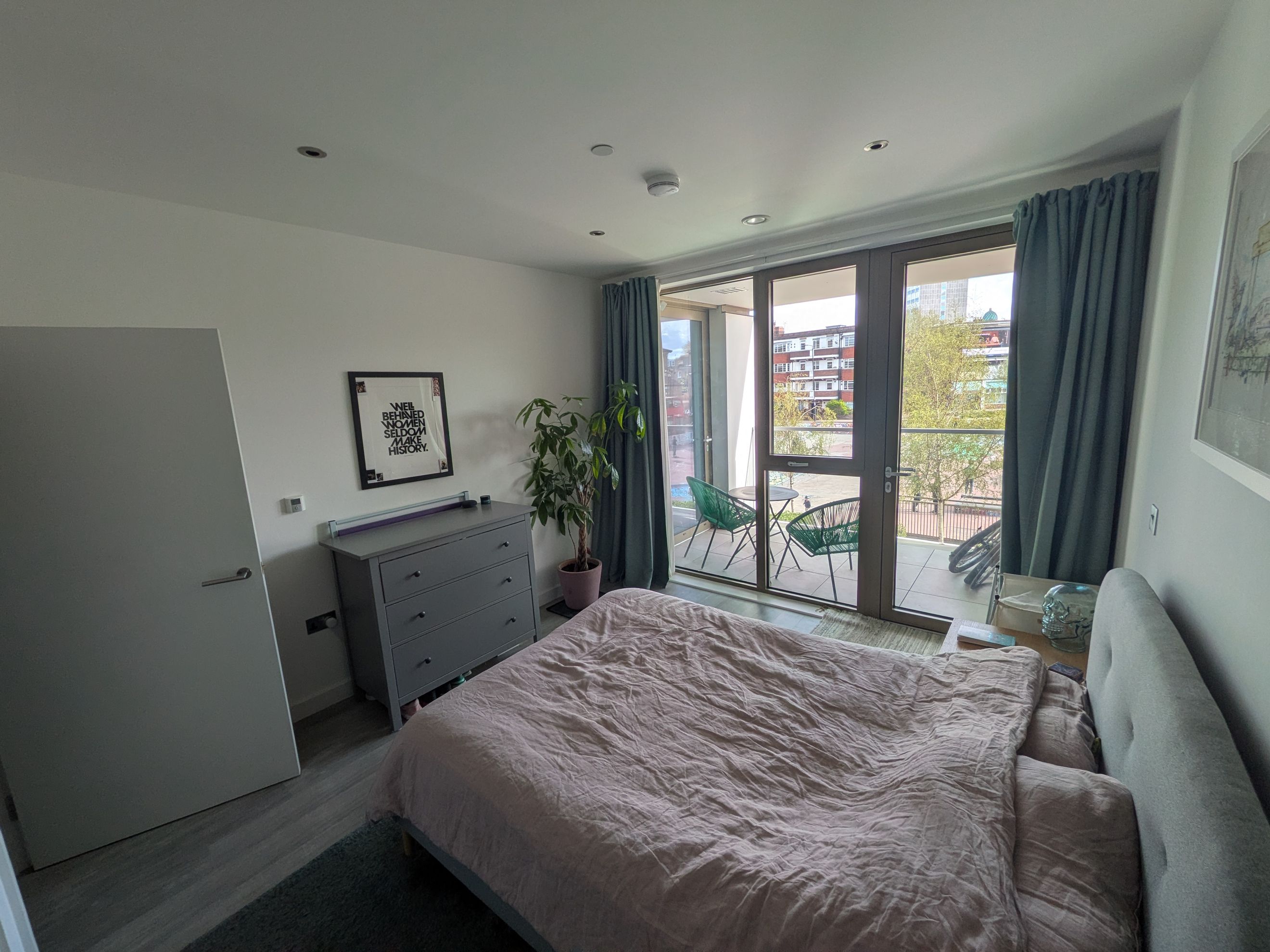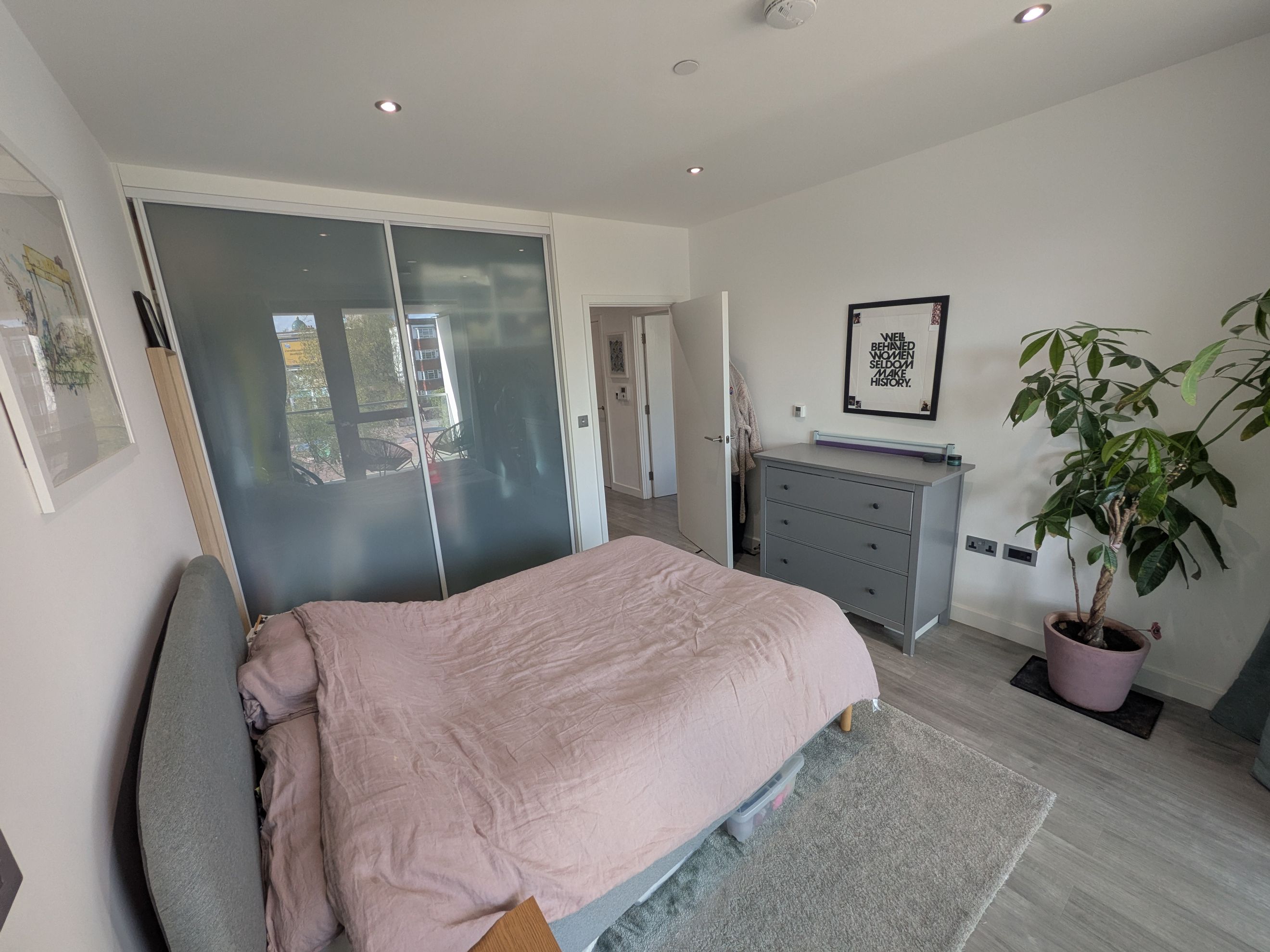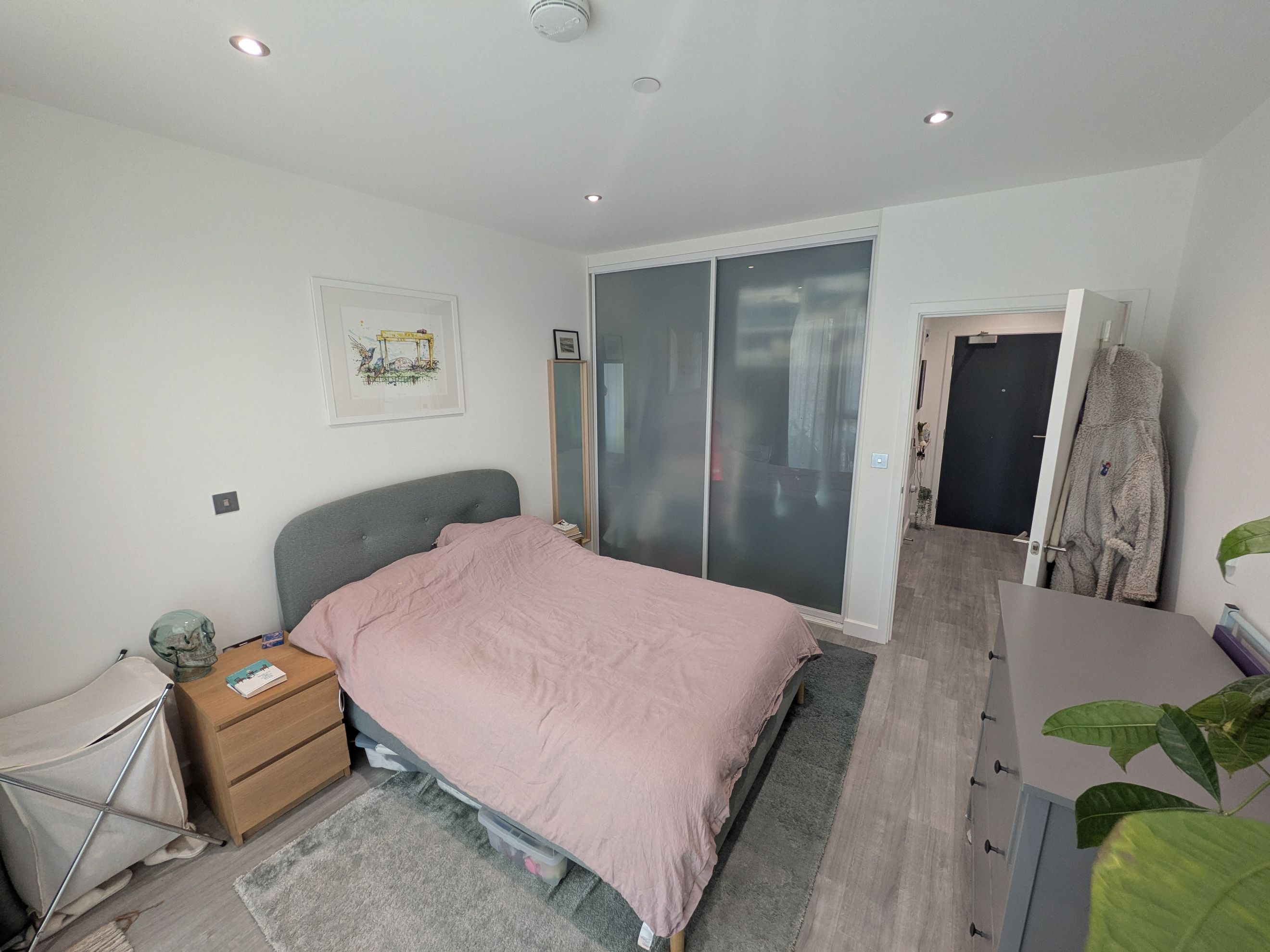 The double bedroom features fitted wardrobes and benefits from balcony access, complemented by a sleek, contemporary bathroom.