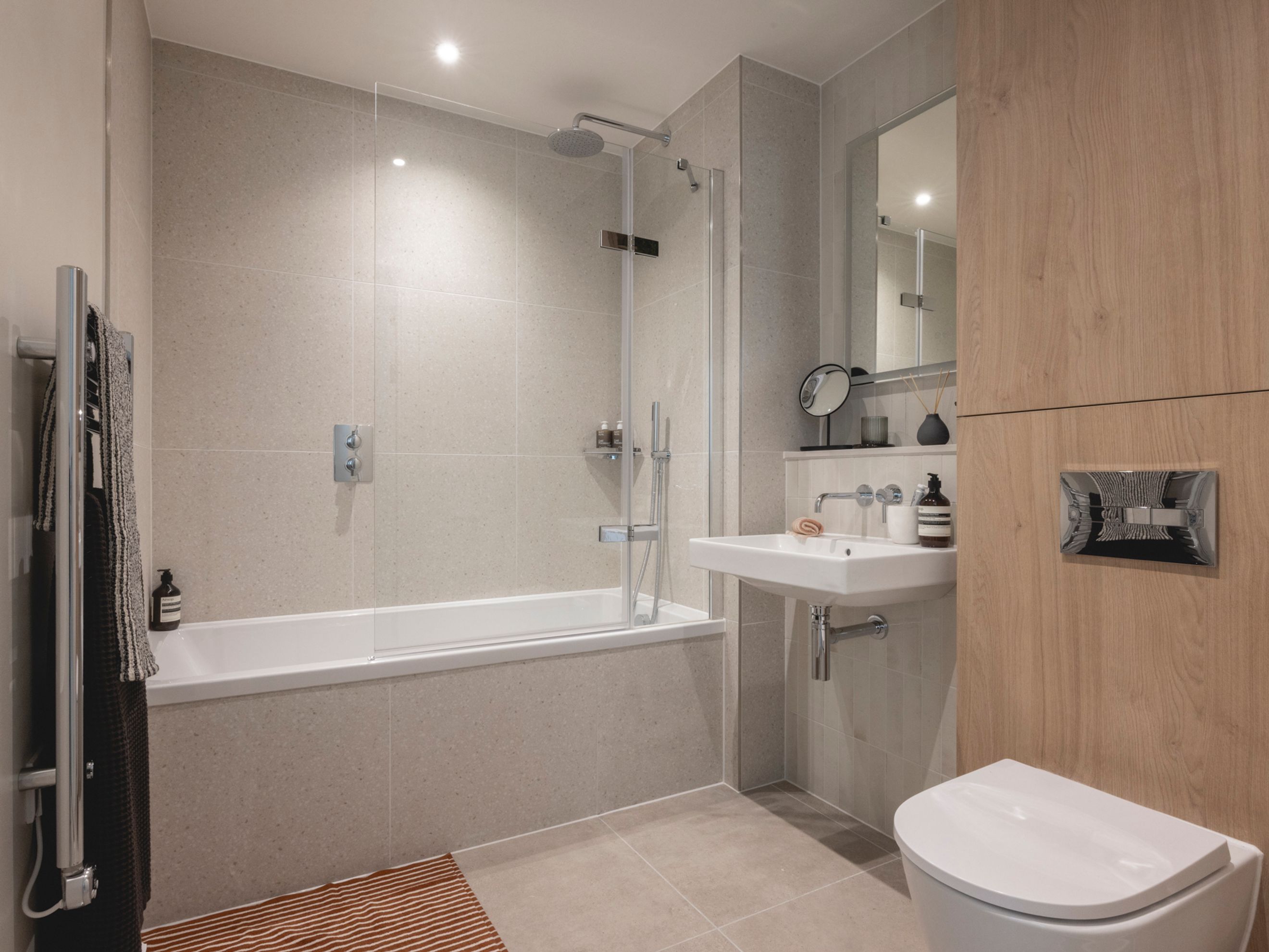 The contemporary kitchen is fitted with high-quality integrated appliances and sleek finishes, making everyday living effortless. The bedroom is well-proportioned and includes built-in wardrobes, providing excellent storage and comfort. The elegant bathroom delivers a spa-like feel with refined modern fittings and a luxurious rainfall shower.
