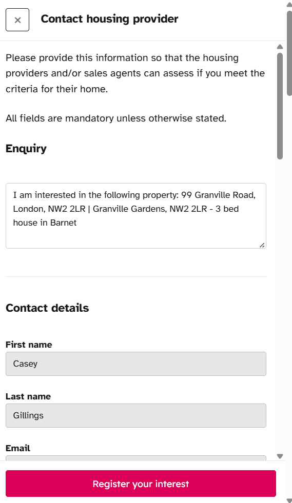 4. Click the ‘Register your interest’ button again at the bottom of the form to send your details straight to the housing provider.