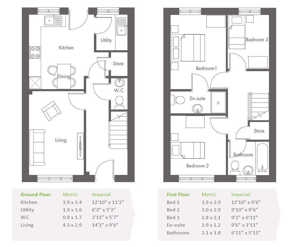The ground floor of The Ashdown also features a handy utility room, downstairs W.C, useful storage space and a door out to the rear turfed garden.