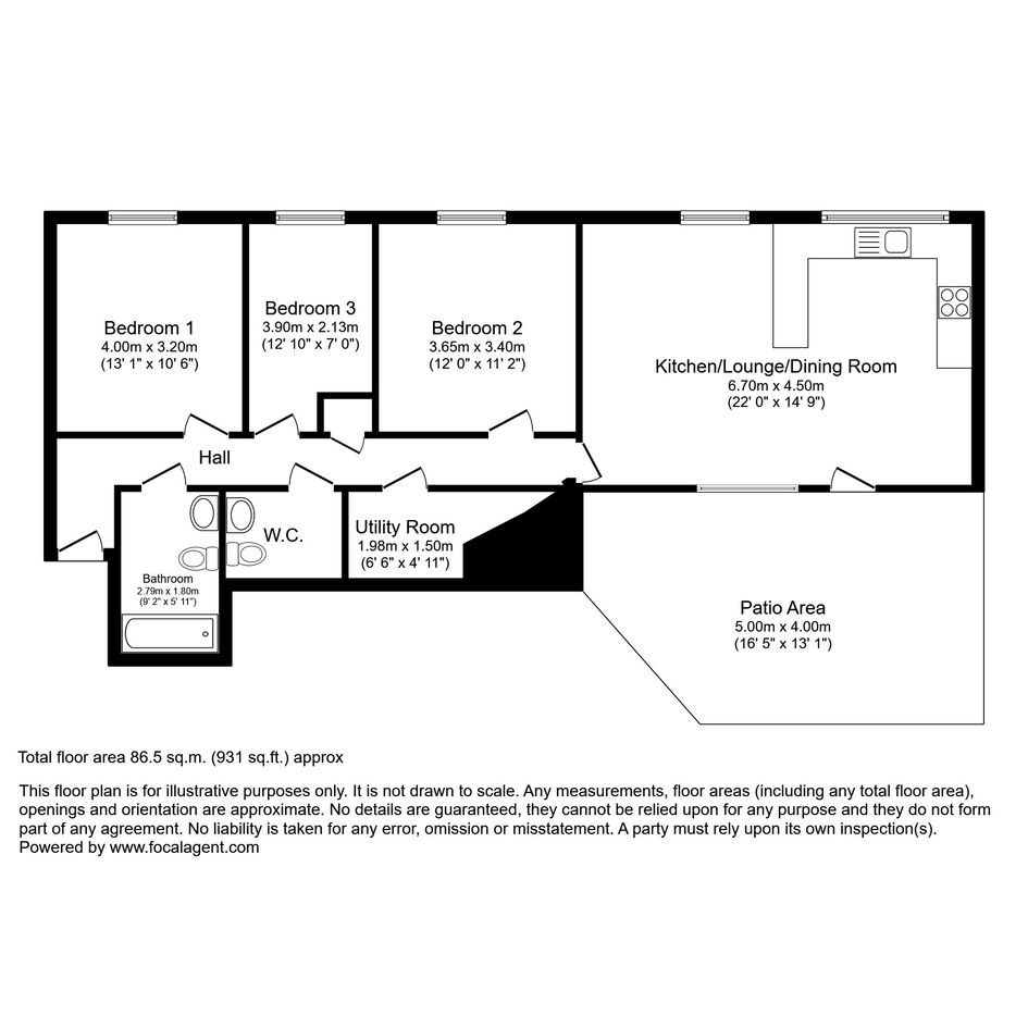 The property itself briefly comprises a Reception Hallway, three bedrooms, a spacious Kitchen/Lounge/Dining Room with access to a generous private patio, a Utility Room and a Bathroom with separate WC.