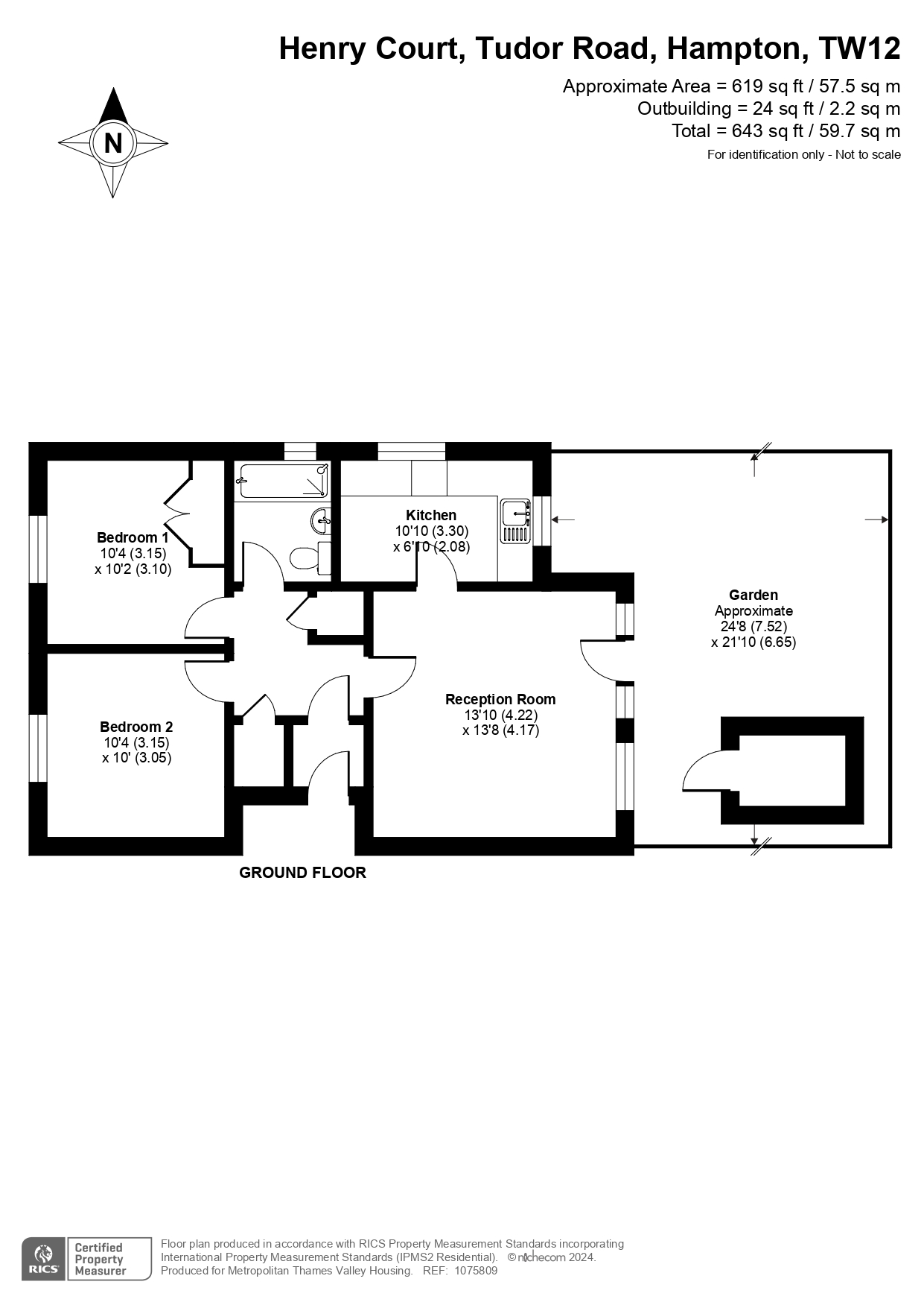 The property comprises an entrance hall with fitted storage, a living room, a separate kitchen, two bedrooms, and a bathroom.