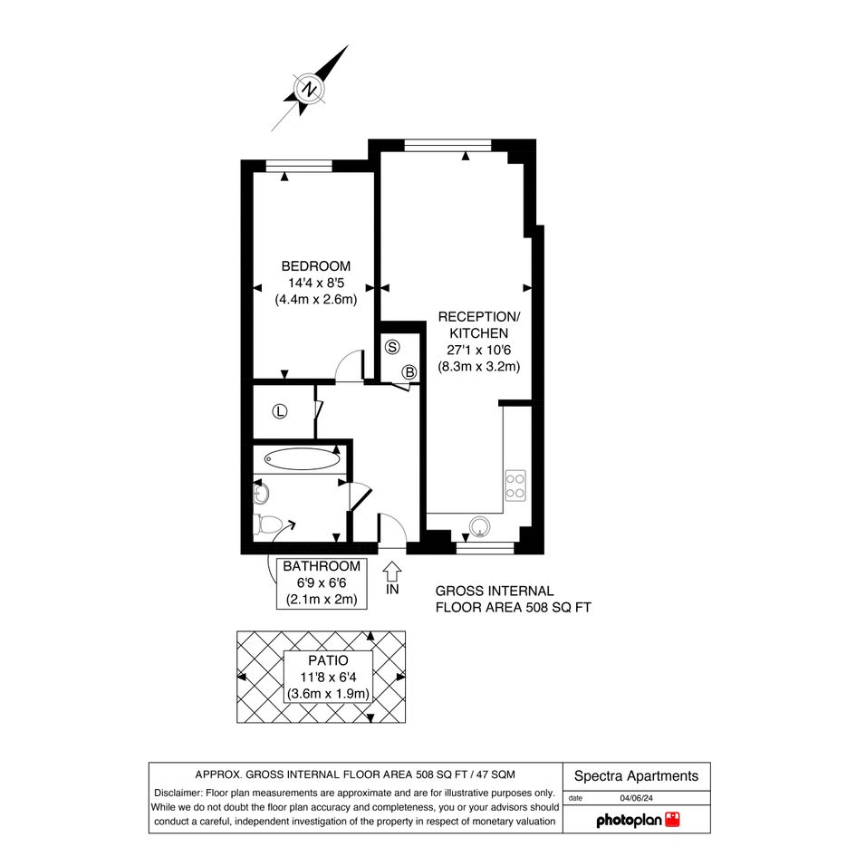 The apartment is arranged as entrance hallway with open-plan reception/living area, fully fitted kitchen with Electrolux appliances and dishwasher, part tiled bathroom with ceiling extractor and heated towel rail and a bedroom large enough to fit a king size bed. This well-presented apartment benefits double glazing throughout, independent electric central heating / hot water system, hall utility and storage cupboards, wood flooring, suspended ceilings incorporating recessed downlighters and a private, south facing, outdoor patio. There is also access to a communal garden and 24 hour concierge service.