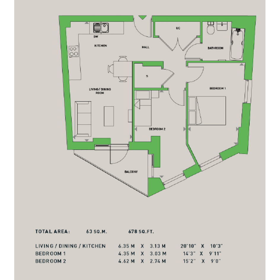 A two bedroom apartment that comprises open plan fitted kitchen/living area with access onto private balcony. The Property also benefits from ample storage space and includes carpeted bedrooms, vinyl flooring in the living area and a tiled bathroom. Other benefits include video entry system, lifts to each floor and access to three communal roof terraces.