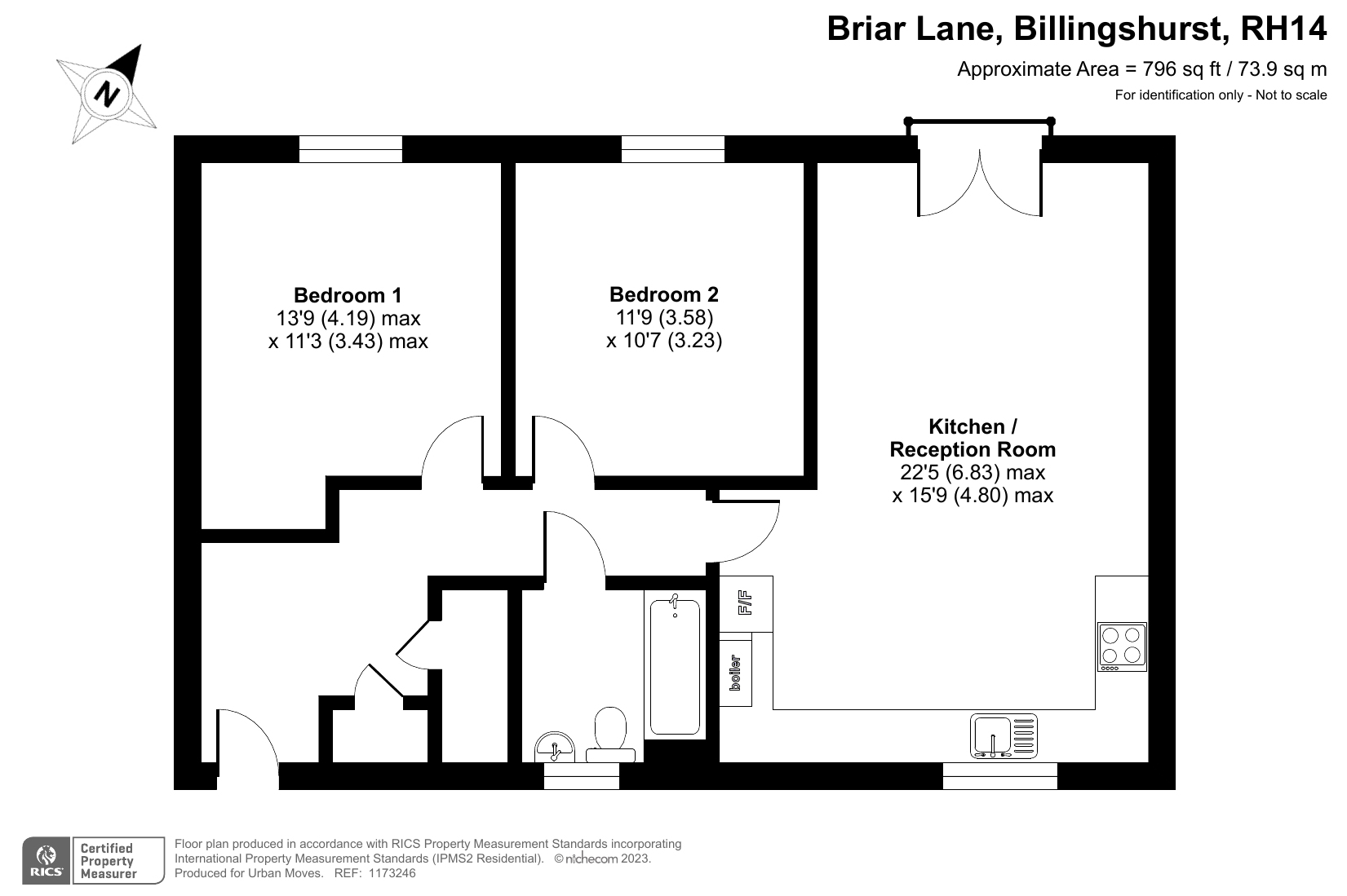 This smartly-presented, top-floor flat has a twenty-two-foot, dual-aspect reception room with Juliette balcony. The open-plan kitchen area features gloss white units and integrated appliances. The bedrooms are both good-sized doubles, there are fitted storage/utility cupboards in the hallway and a naturally-lit bathroom. Well insulated walls and roof, high performance glazing and a modern gas central heating system all contribute towards a very good energy-efficiency rating. Briar Lane is only a short walk from Billingshurst Station, which provides rail services between Bognor Regis and London Victoria. The flat comes with use of an allocated parking space.