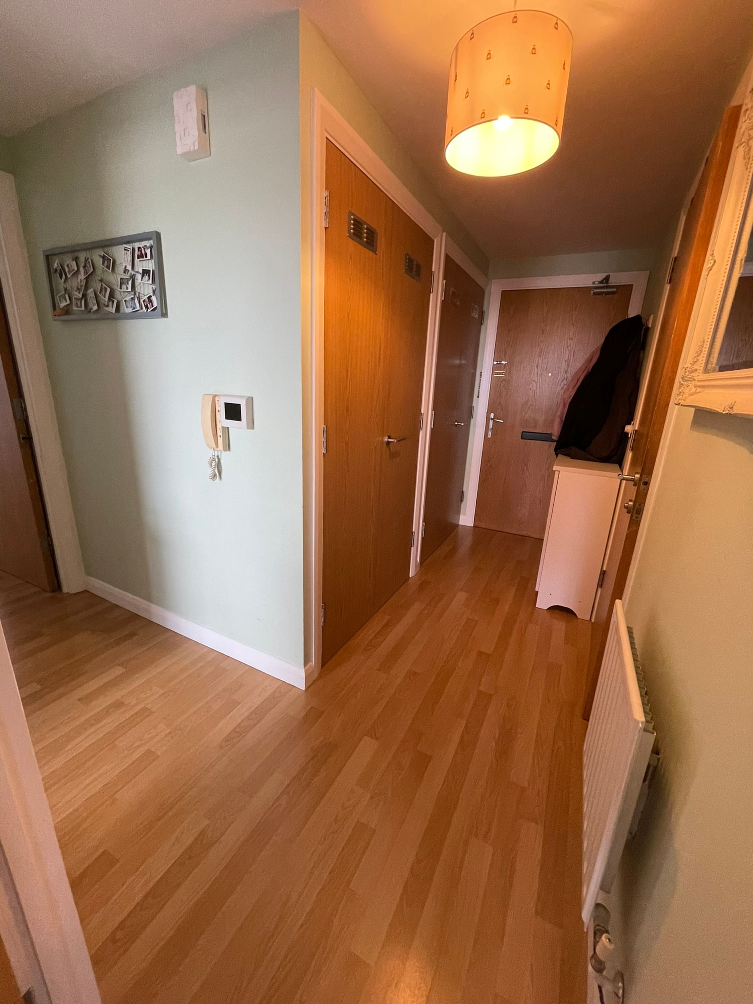 Entrance Hall - Large front door leading through to the bathroom, bedrooms and living room. Wood laminate flooring. Double storage cupboard housing water tank.