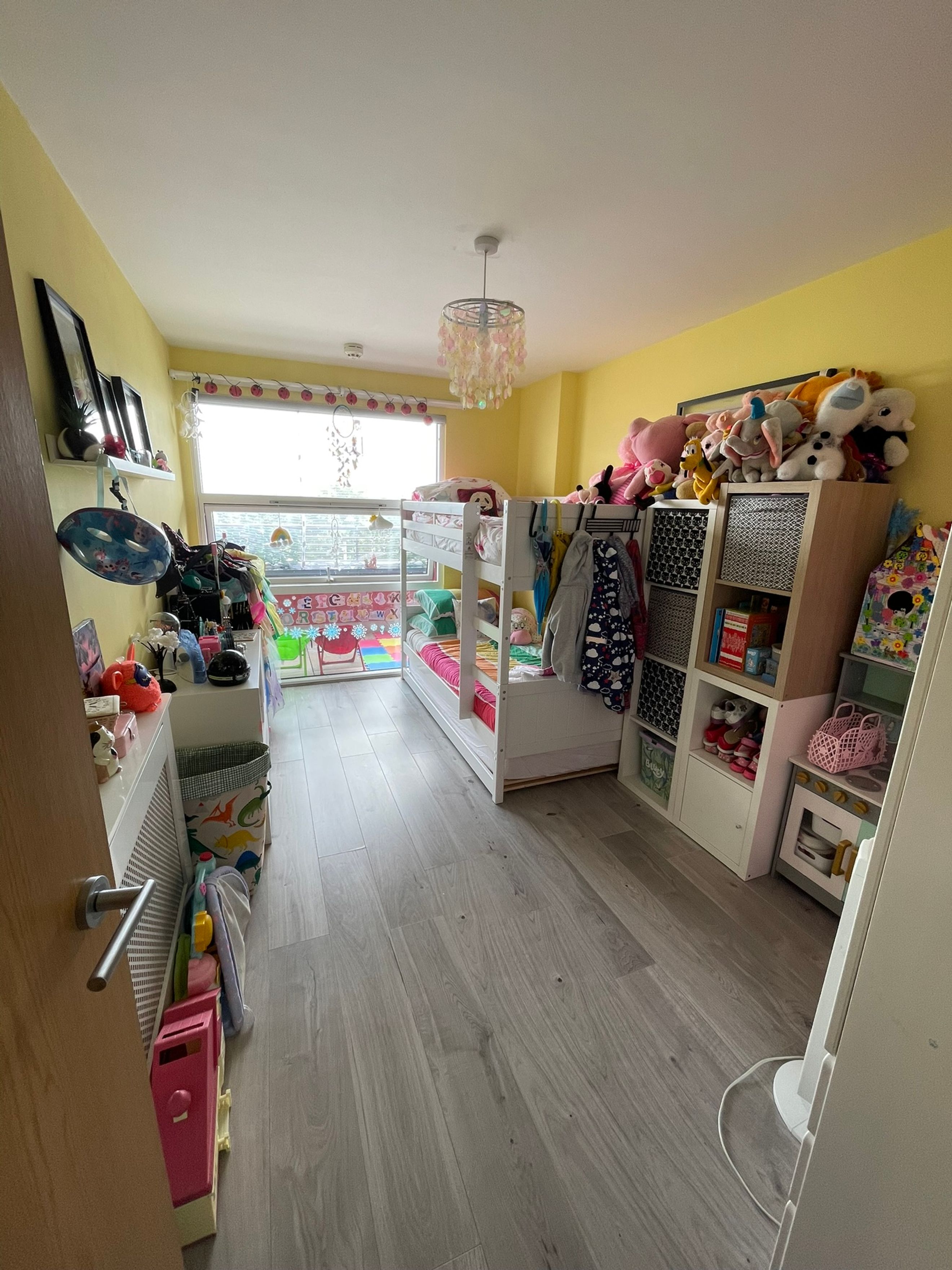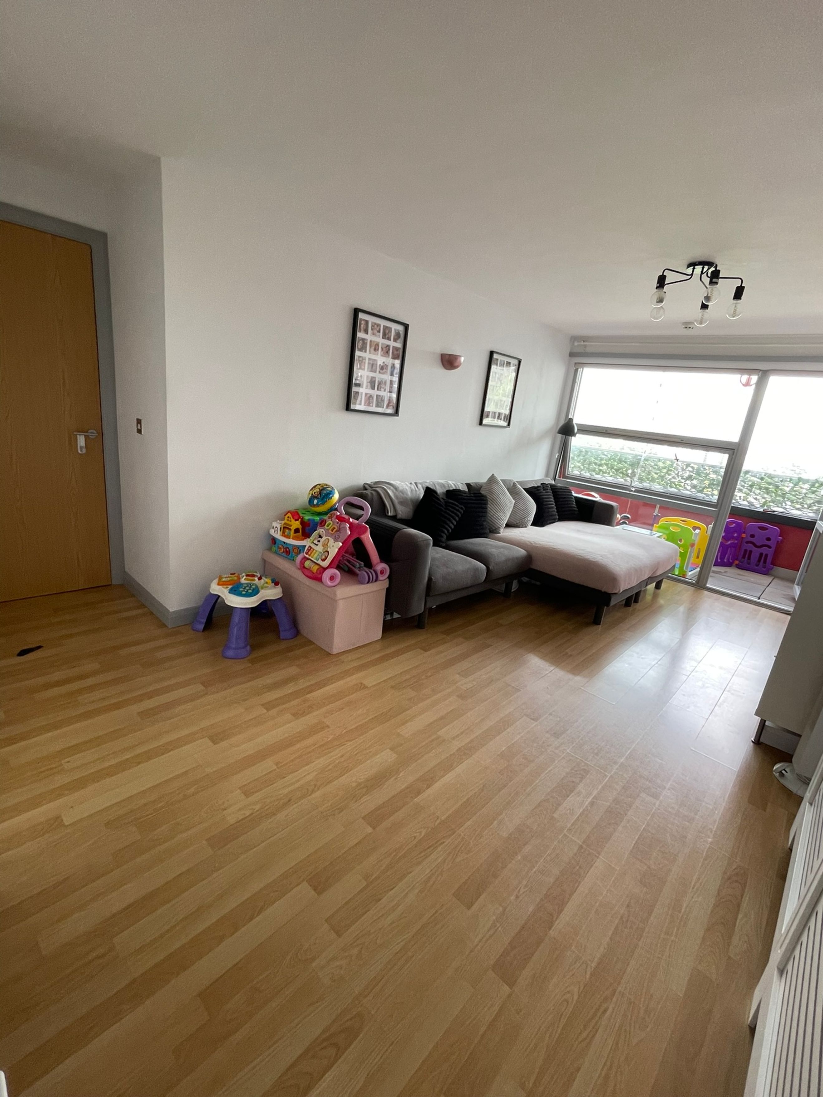 Bedroom 2 - Double glazed floor to ceiling window that fully opens in the middle. Radiator. Wood laminate flooring.