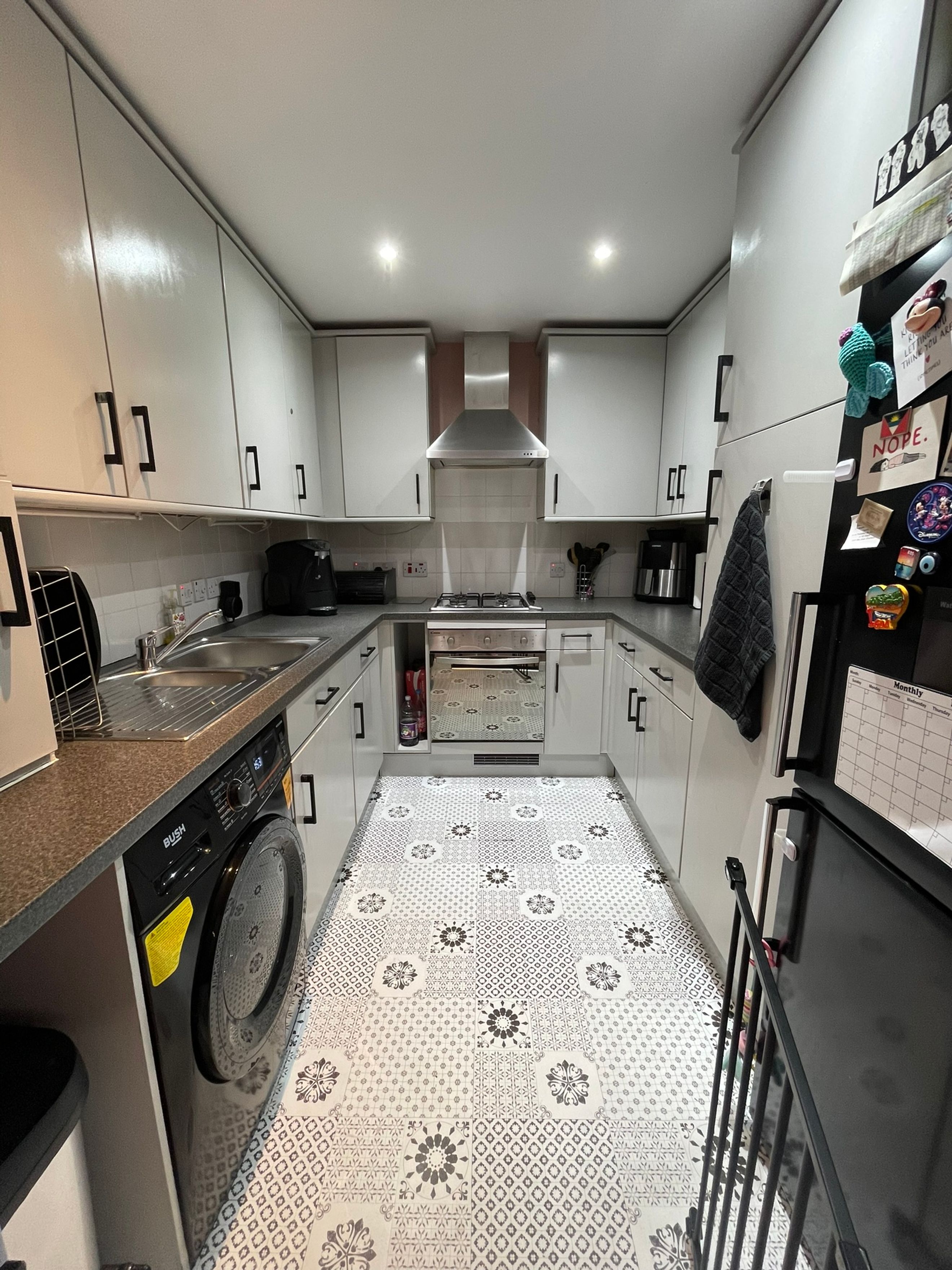 Kitchen -Stylish modern fitted kitchen with large stainless sink unit and a tall mixer tap. Tiled splash back and walls. Oven, gas hob & extractor. Plumbing for dishwasher, washing machine and fridge available.