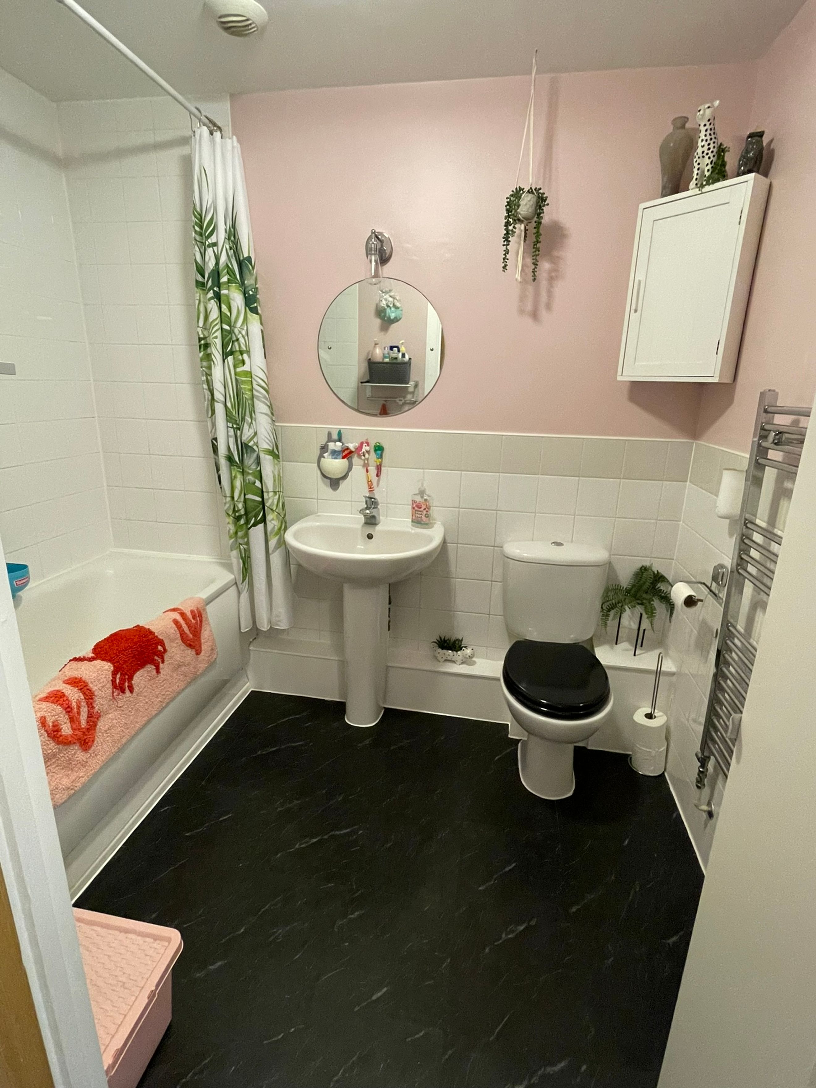 Bathroom - Three piece white suite comprising: panelled bath with mixer tap & mixer shower, pedestal wash hand basin & toilet. Radiator. Vinyl flooring. Part tiled walls.