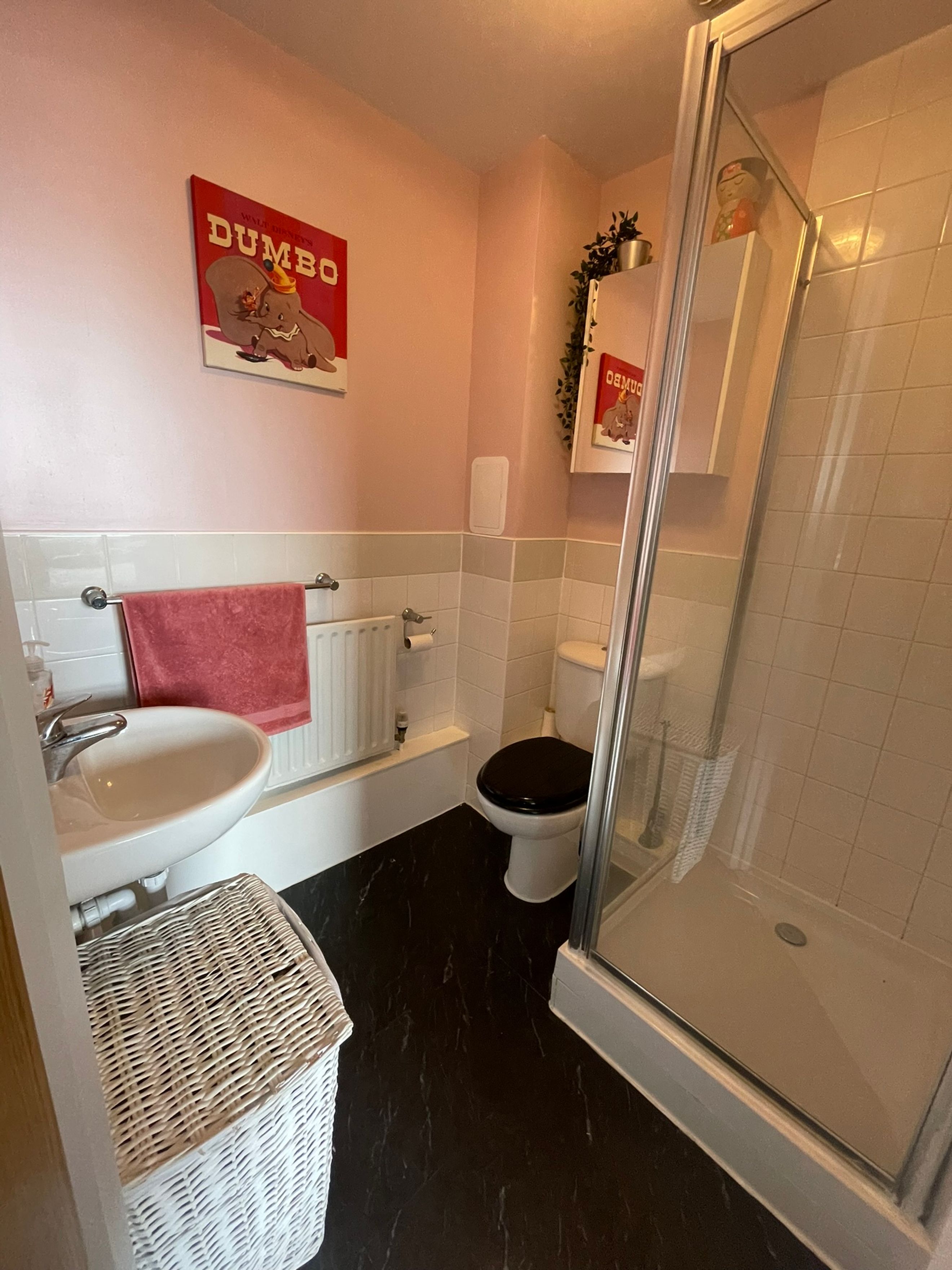 En-Suite - White bathroom set. Shower unit with mixer shower over, tiled walls and glass door, wash hand basin. Partially tiled walls. Electric mirror wiring available. Vinyl flooring. Extractor fan.