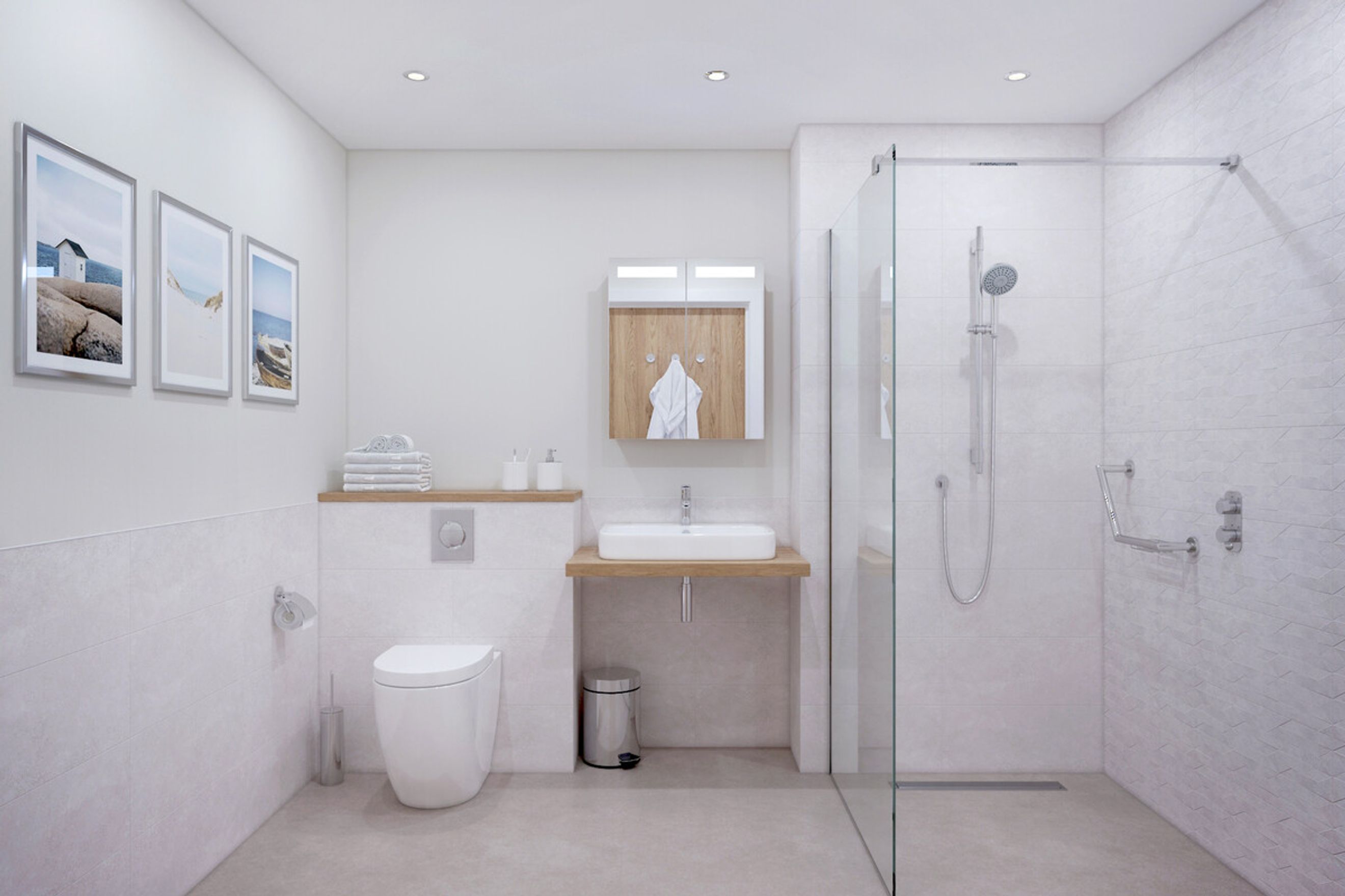 Walk-in shower, white sanitary ware, and anti-slip flooring.