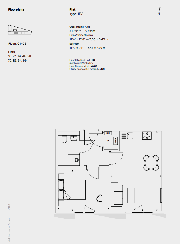 The method of construction is a modular built structure with a tiled facade. The warranty provider is Premier Guarantee, and this provides a two-year defect liability period on the individual home, and 10 years on the structure of the building (until March 2033). Addiscombe Grove is a car-free development (apart from with respect to two shared spaces for Blue Badge holders available on a first come first serve basis), and homeowners will not be granted a residents' permit. A Heat Interface Unit (HIU) connected to a centralised boiler delivers heating and hot water; each resident will be billed according to their own controlled usage and cannot change gas suppliers. For electricity, residents can change to a different supplier of their choosing, subject to availability. Wiring for Sky+/Sky Q, BT telephone and BT Openreach Fibre is available, and residents will receive Hyperoptic Wi-Fi installed with a 3-month free service. Buyers can change to a different supplier of their own choosing, subject to availability. Mobile coverage varies by provider, for an indication of specific speeds and supply or coverage in the area, refer to the Ofcom's mobile and broadband checker. These homes will come with a 125-year lease (from 2022) and a Residents’ Management Company (RMC) has been formed by the homeowners at Addiscombe Grove. It is the intention that the freehold will be transferred to the RMC upon the sale of the last home. The building is managed by a managing agent, and the service charge covers the cost of running the building.
