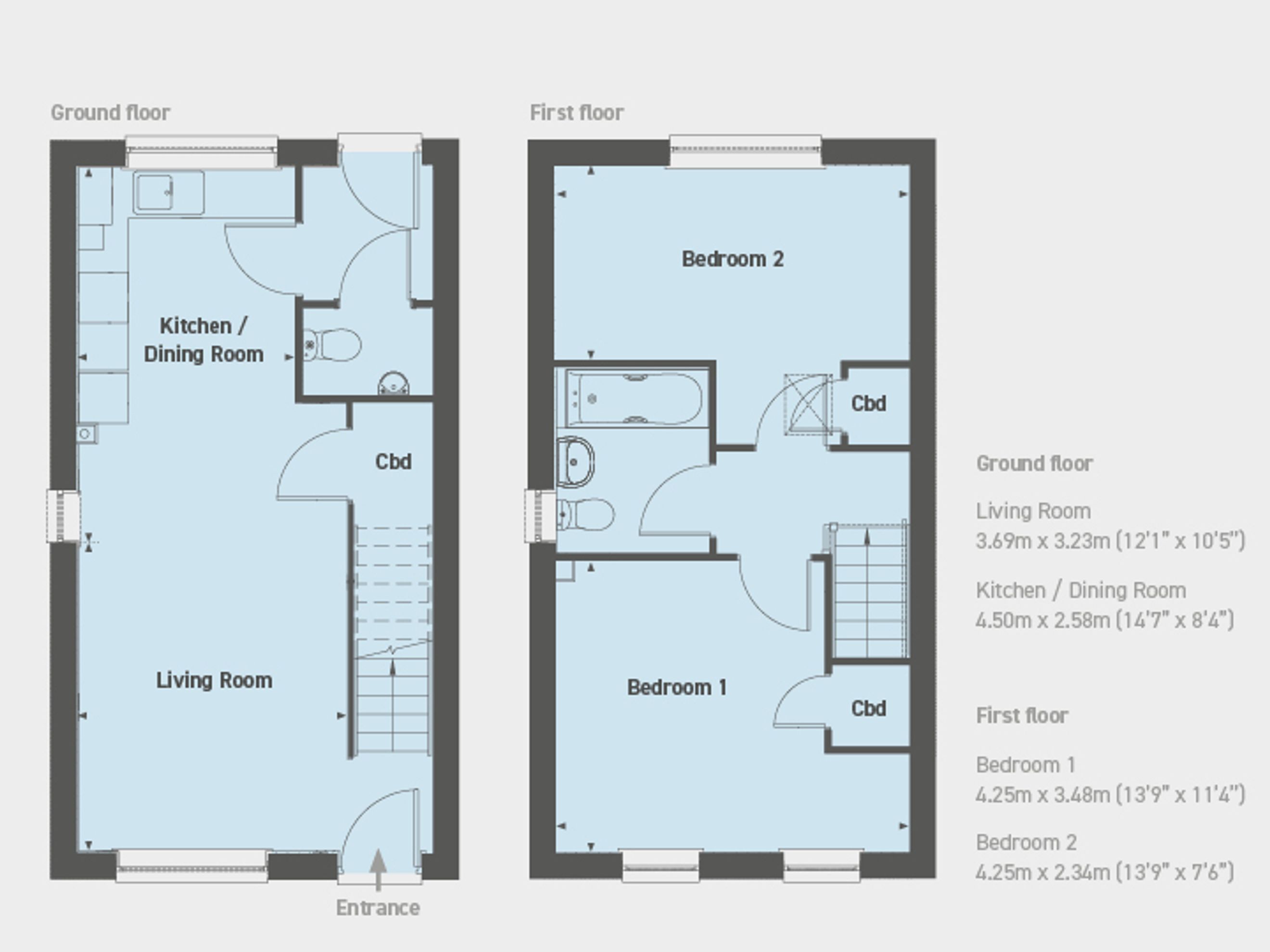 Built in a traditional style and finished in a combination of brick or render, the two bedroom houses feature an open-plan ground floor layout with the kitchen/dining room flowing into the living room. Also downstairs is a useful cloakroom with WC and handbasin. Upstairs are two double bedrooms and a contemporary style family bathroom.