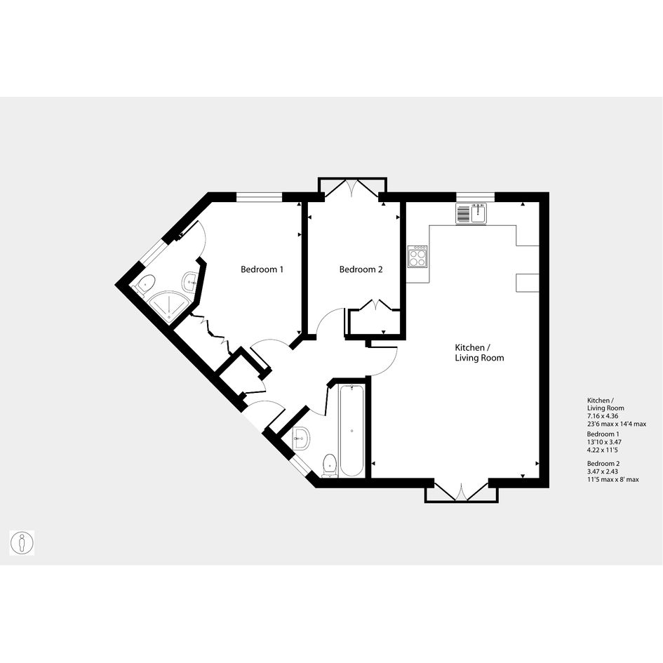 Featuring an open-plan living area. The kitchen is fitted with an oven and hob. There are two comfortable bedrooms, with an ensuite to the master and storage to both. The bathrooms have modern, white suites.