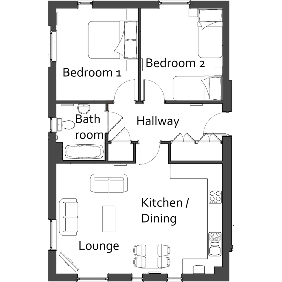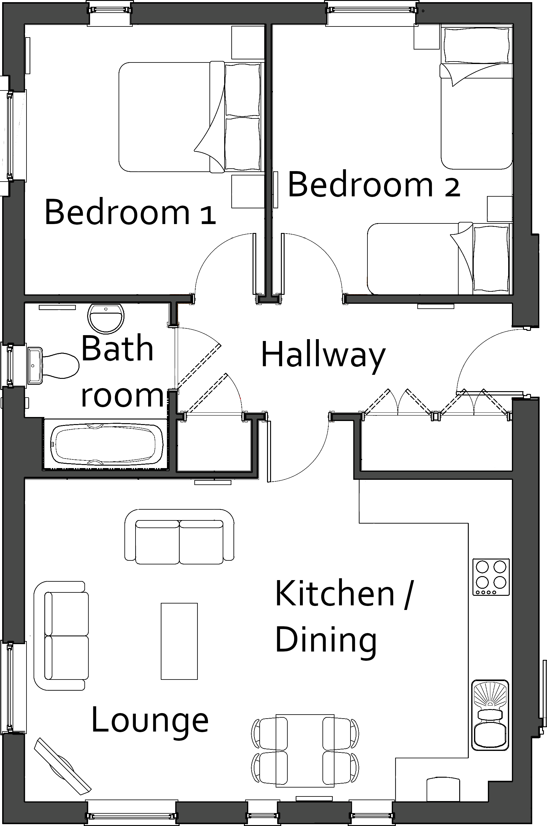 Inside, from the communal entrance hallway, you will find two useful storage cupboards on the hallway's left-hand side, with the family bathroom located at the end. On the left as you enter the property is the open-plan lounge and kitchen / dining room. This open plan space has four windows to illuminate the space with natural light. The kitchen units are finished in the Minoco range by Moores in warm grey, with a Tippo white worktop and distressed oak vinyl flooring. On the right of the hall are the two bedrooms, both doubles.