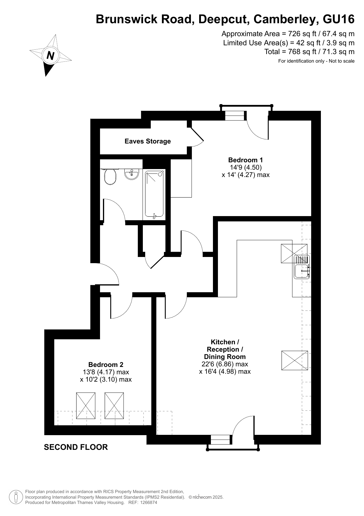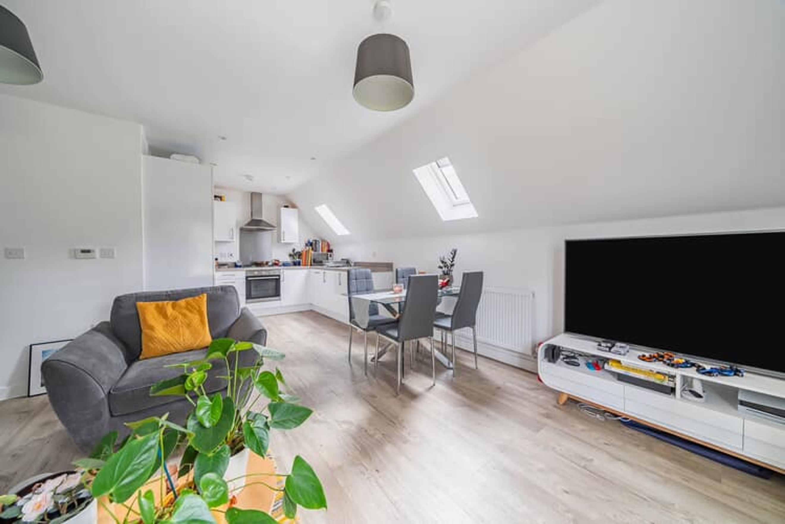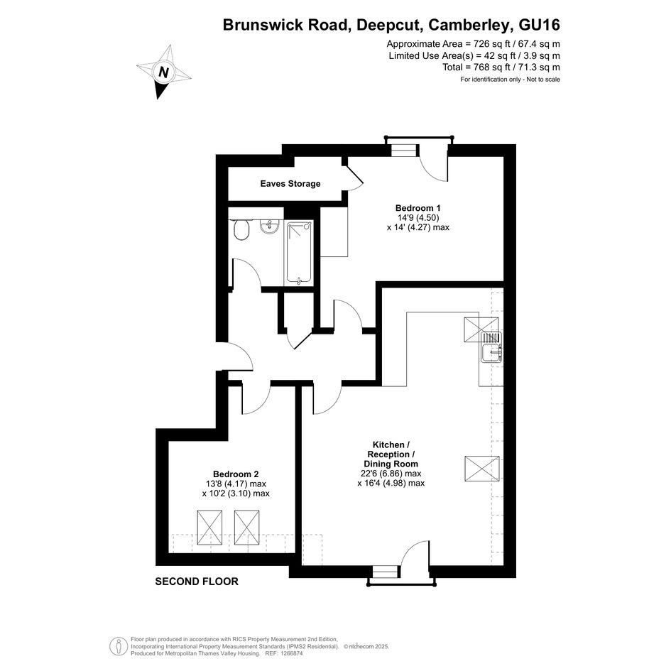 The property on the second floor comprises an entrance hall with fitted storage, a living room with an open-plan kitchen, two large bedrooms, and a bathroom.