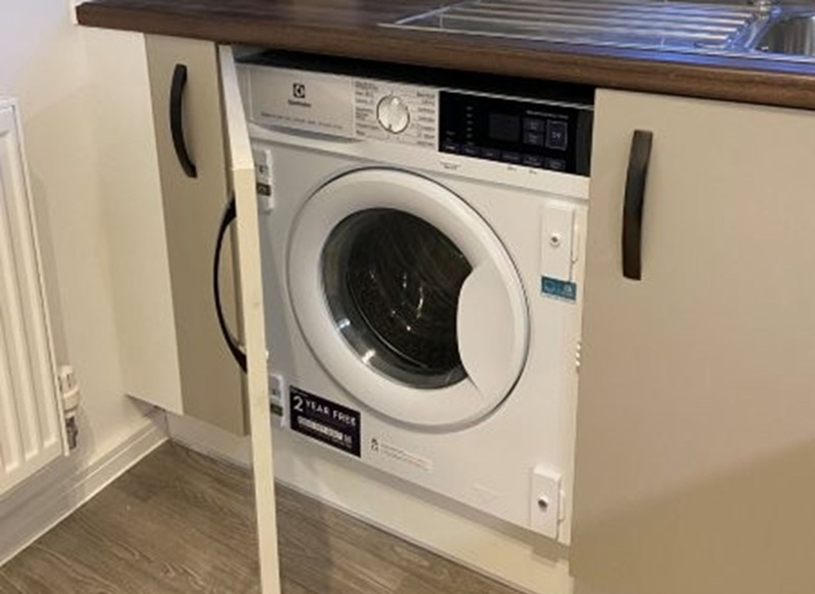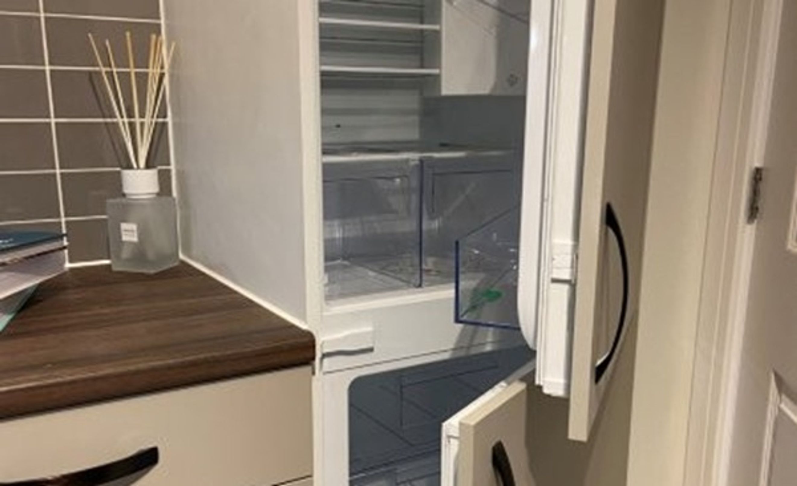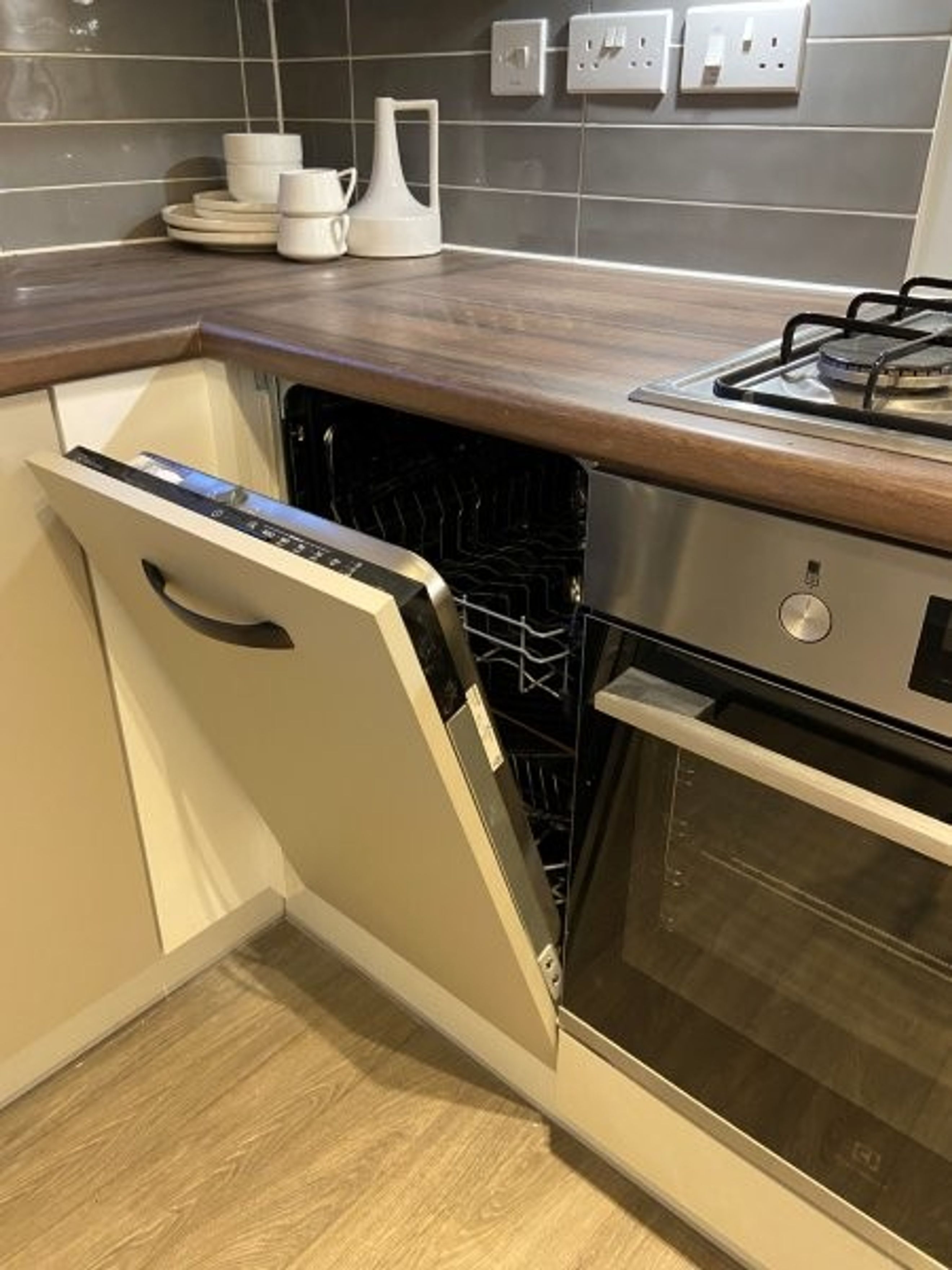 The kitchen has a selection of base and wall units in neutral colours with an integrated oven, hob and extractor hood, as well as an integrated fridge freezer,