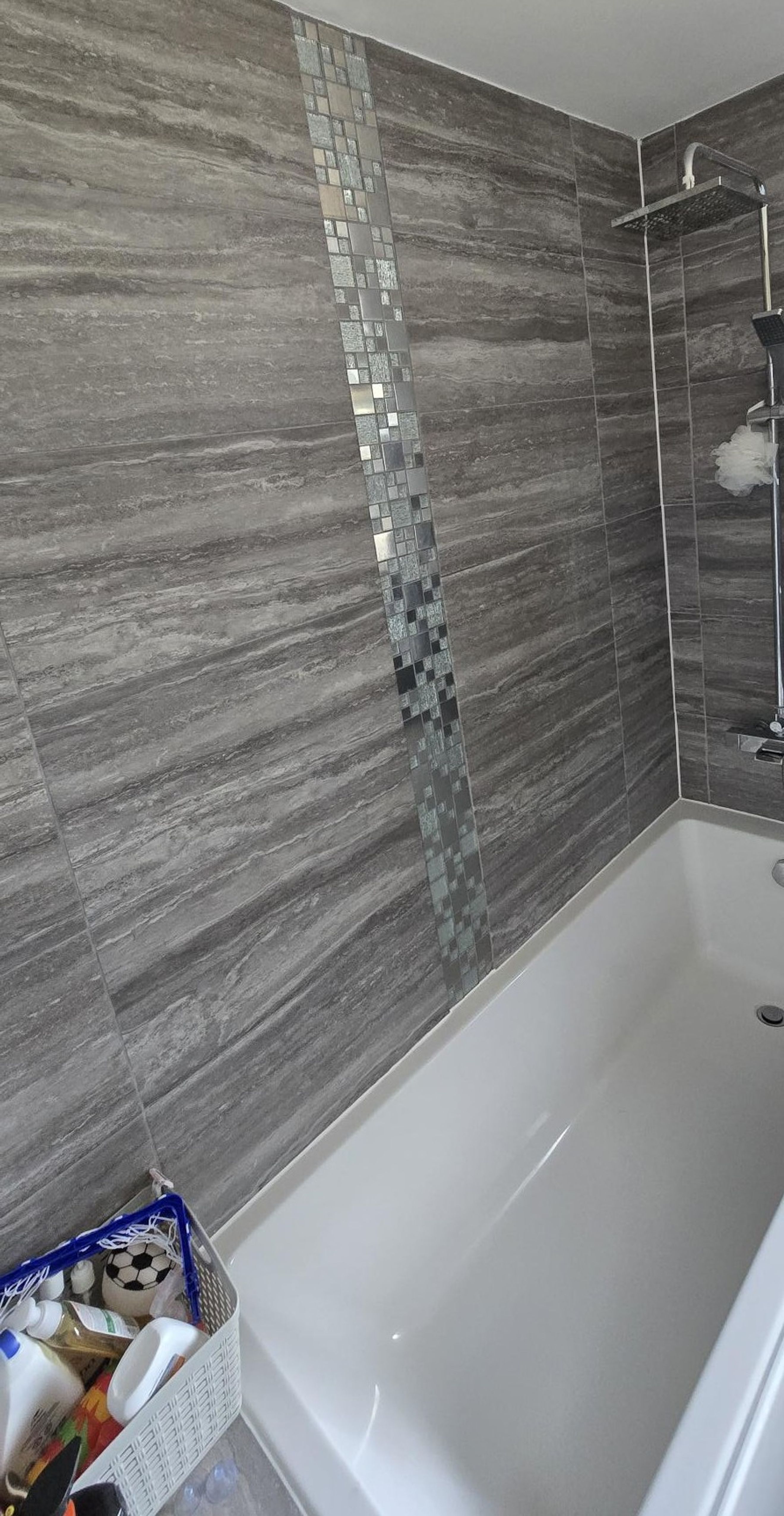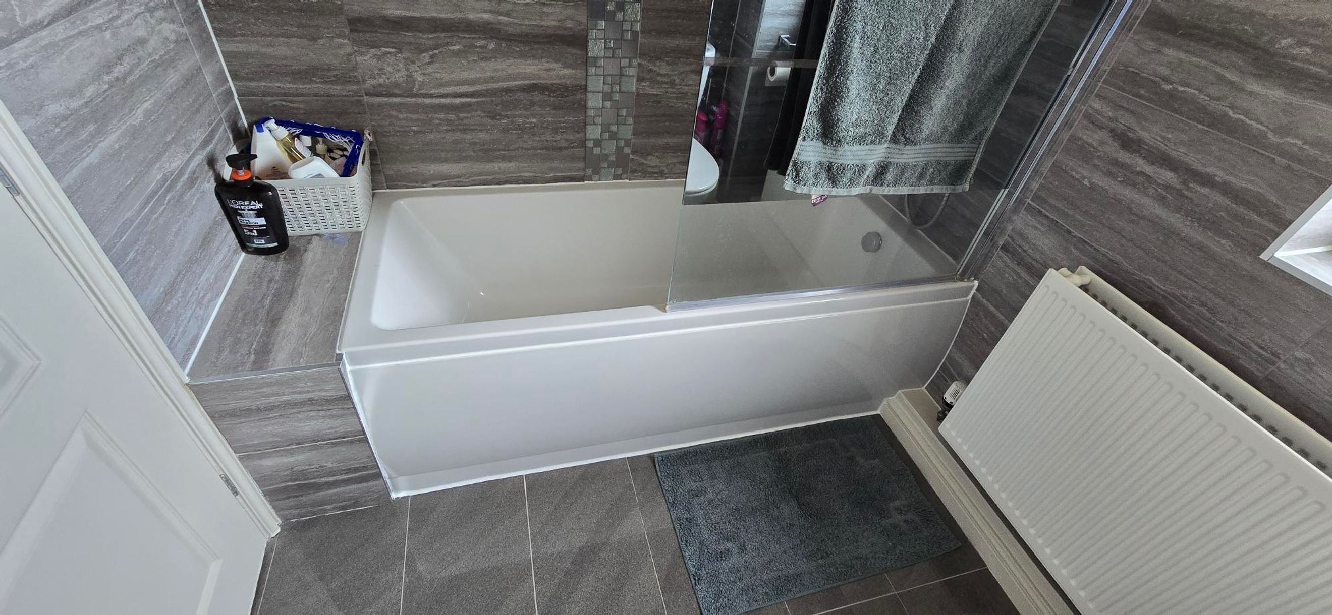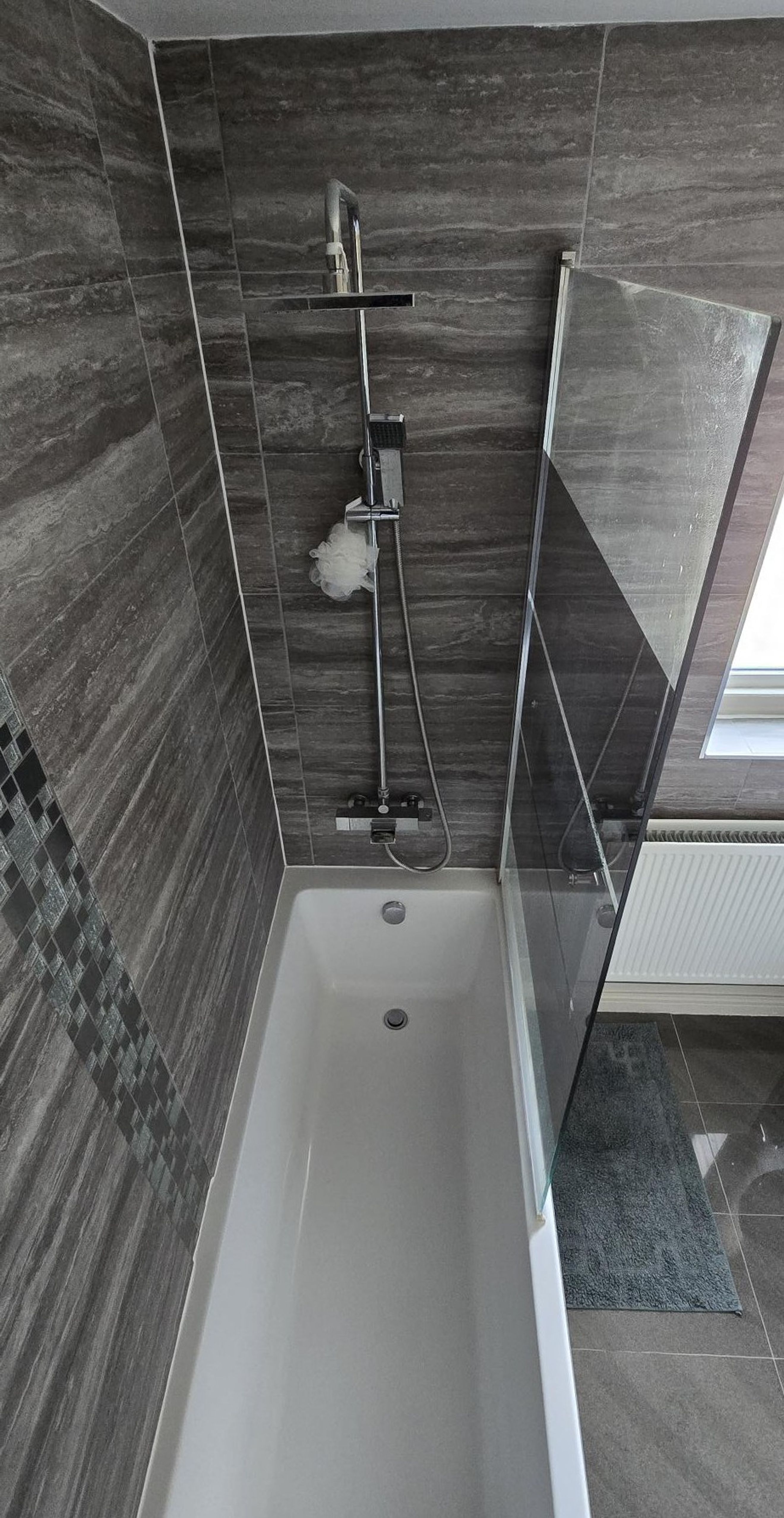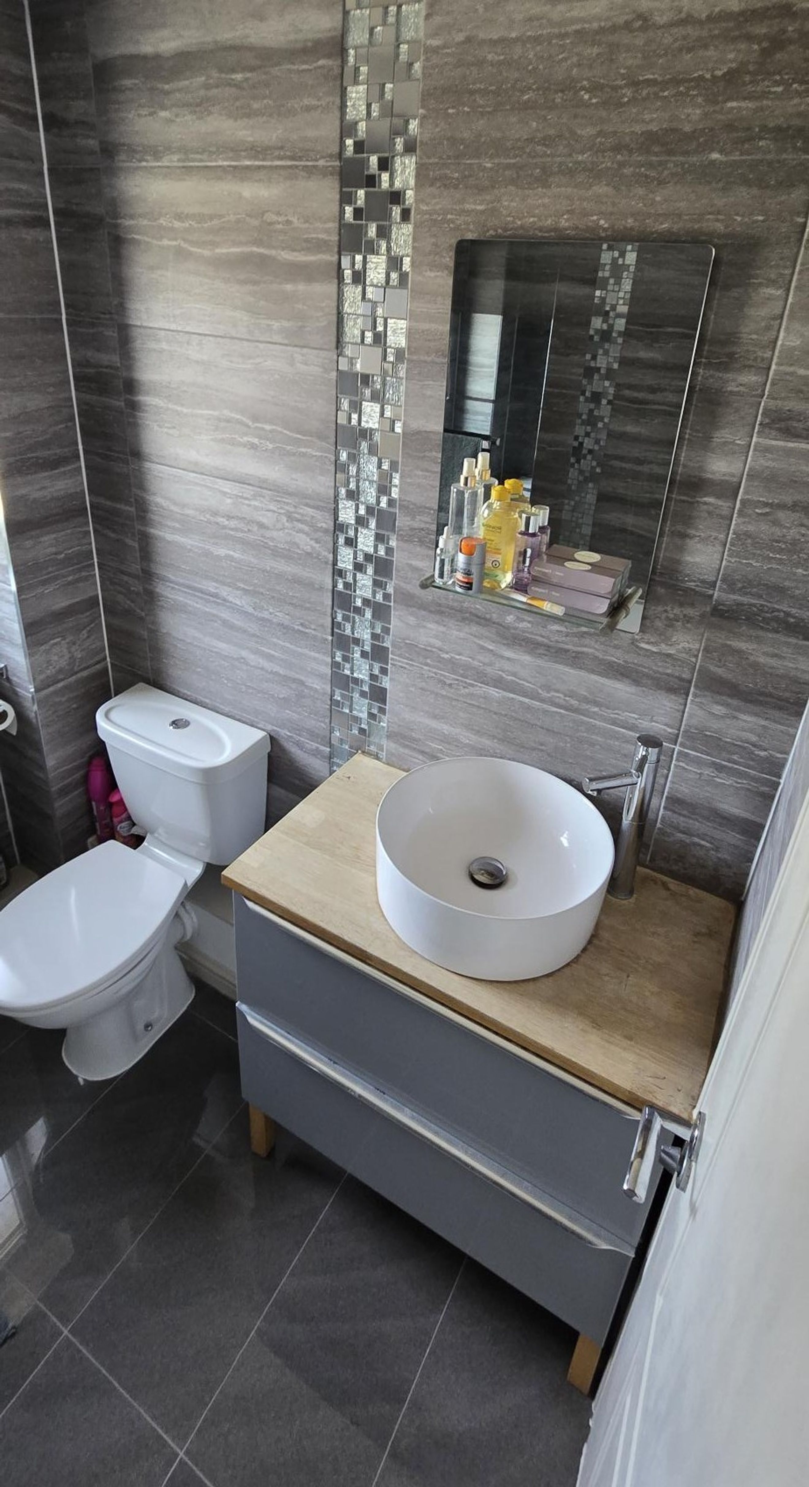The family bathroom is fitted with a modern three-piece suite, including a bath with an overhead shower, a wash basin, and a WC, all finished to a high standard.