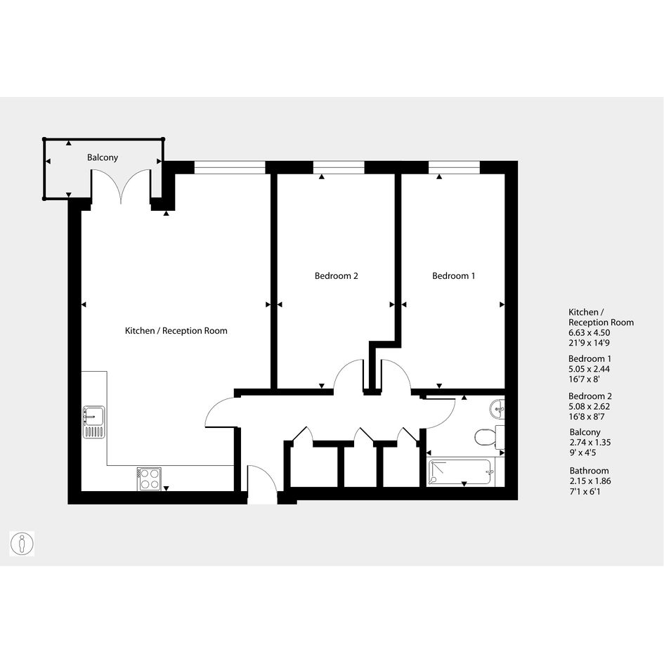Featuring an open-plan living area. The kitchen is fitted with an oven, hob and hood. There are two comfortable bedrooms. The bathroom has a white suite.