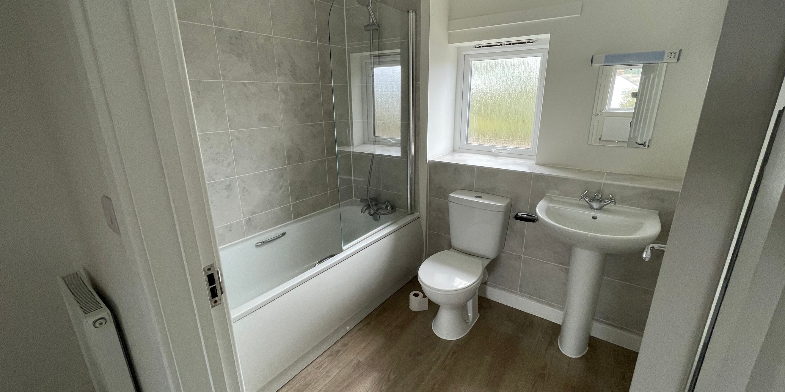 Upstairs there are two bedrooms, one double and one twin. The larger bedroom includes a built-in storage cupboard above the stairs. The family bathroom contains a WC, basin, bath and shower over the bath. There is also a storage cupboard on the landing.