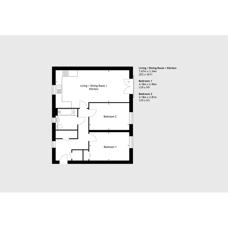 Featuring a modern, open-plan living area with a Juliette balcony. The kitchen is fitted with an oven, hob and hood. There are two comfortable bedrooms. The bathroom has a modern, white suite.