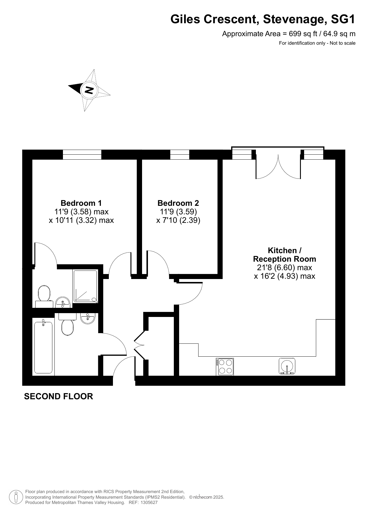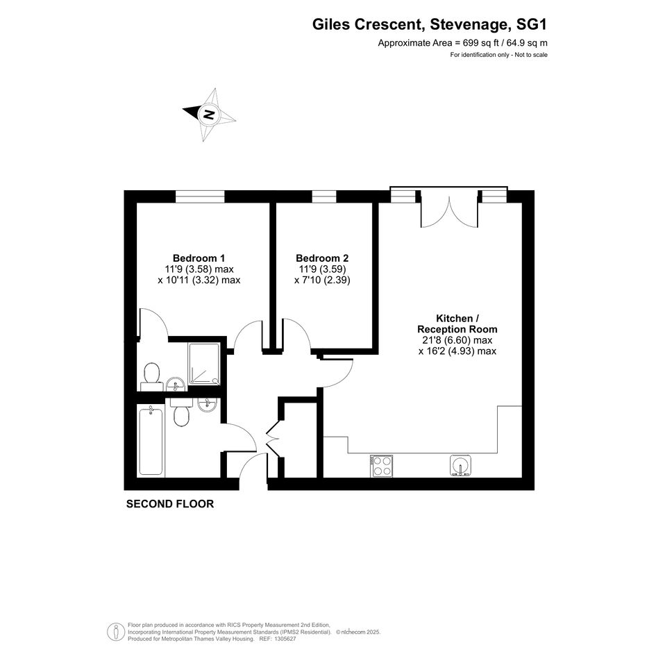 The apartment features an entrance hall, open plan living room and kitchen, two bedrooms, and two bathrooms.