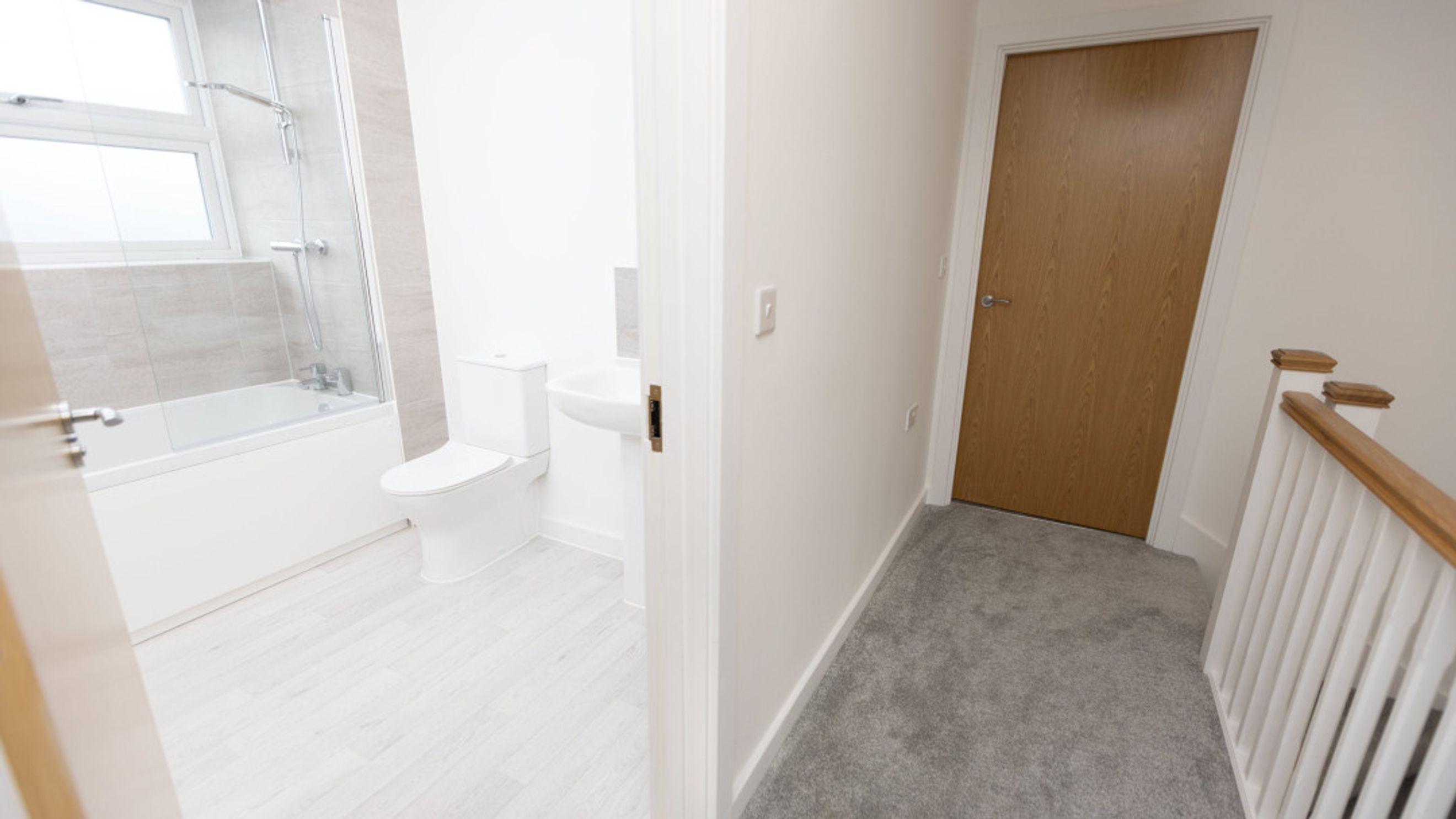 The second-floor landing provides access to a storage cupboard, the family bathroom, and two additional double-sized bedrooms.