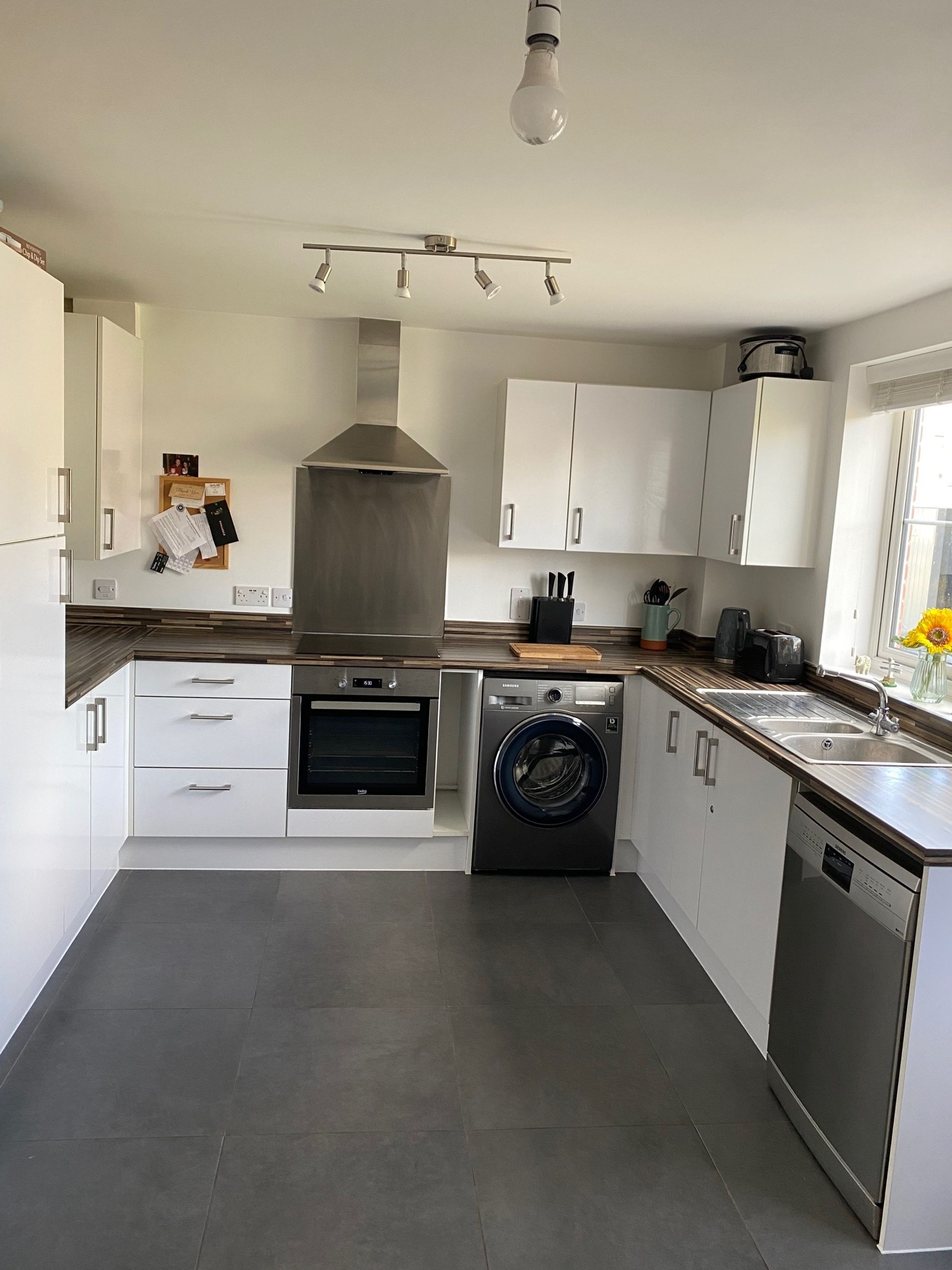 - Modern kitchen with fitted oven and hob. Space for washing machine, dishwasher and fridge freezer