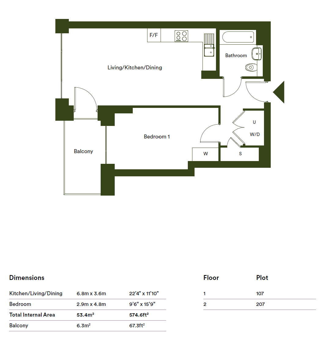 Ready to move into, 1 bedroom, 1st floor apartment offering 53.4 sq.m of internal floor area. Open plan living space leading to private balcony. Integrated appliances, underfloor heating and master bedroom with fitted wardrobe.