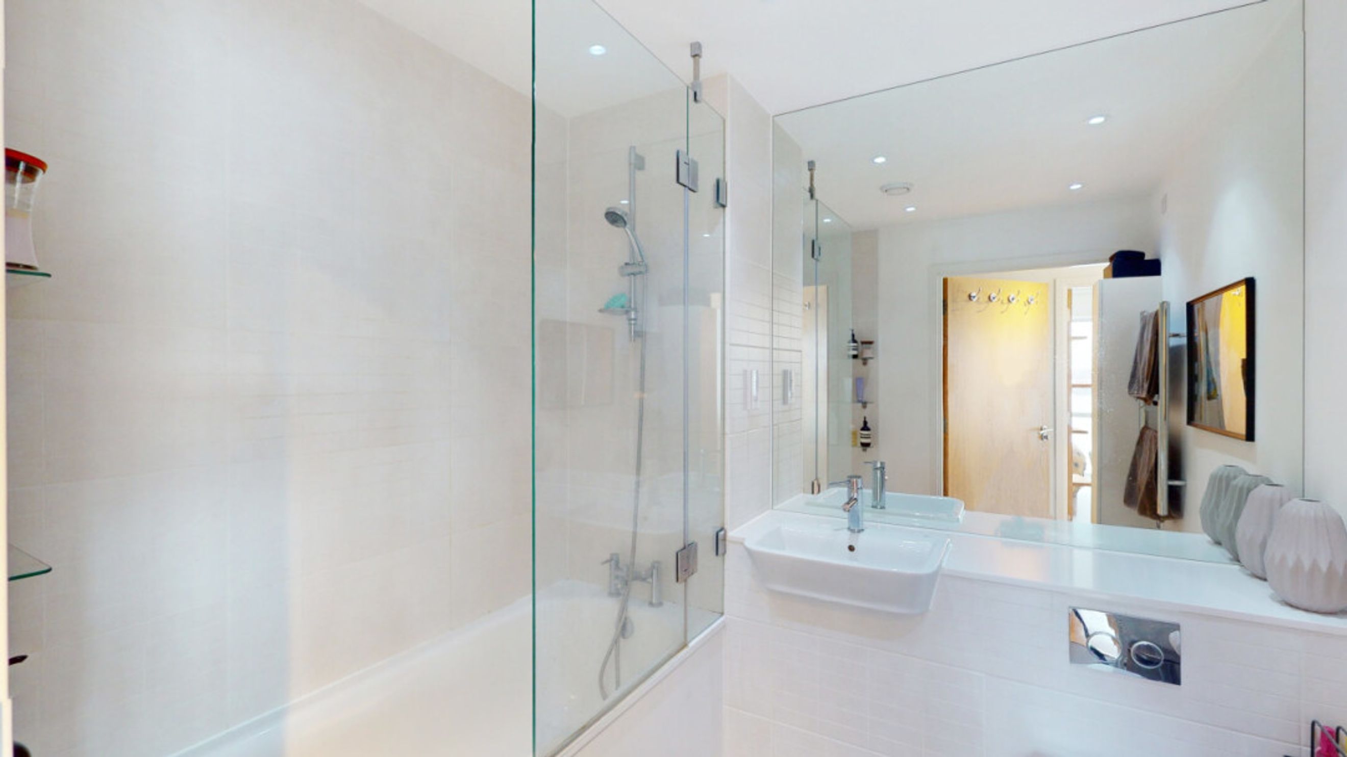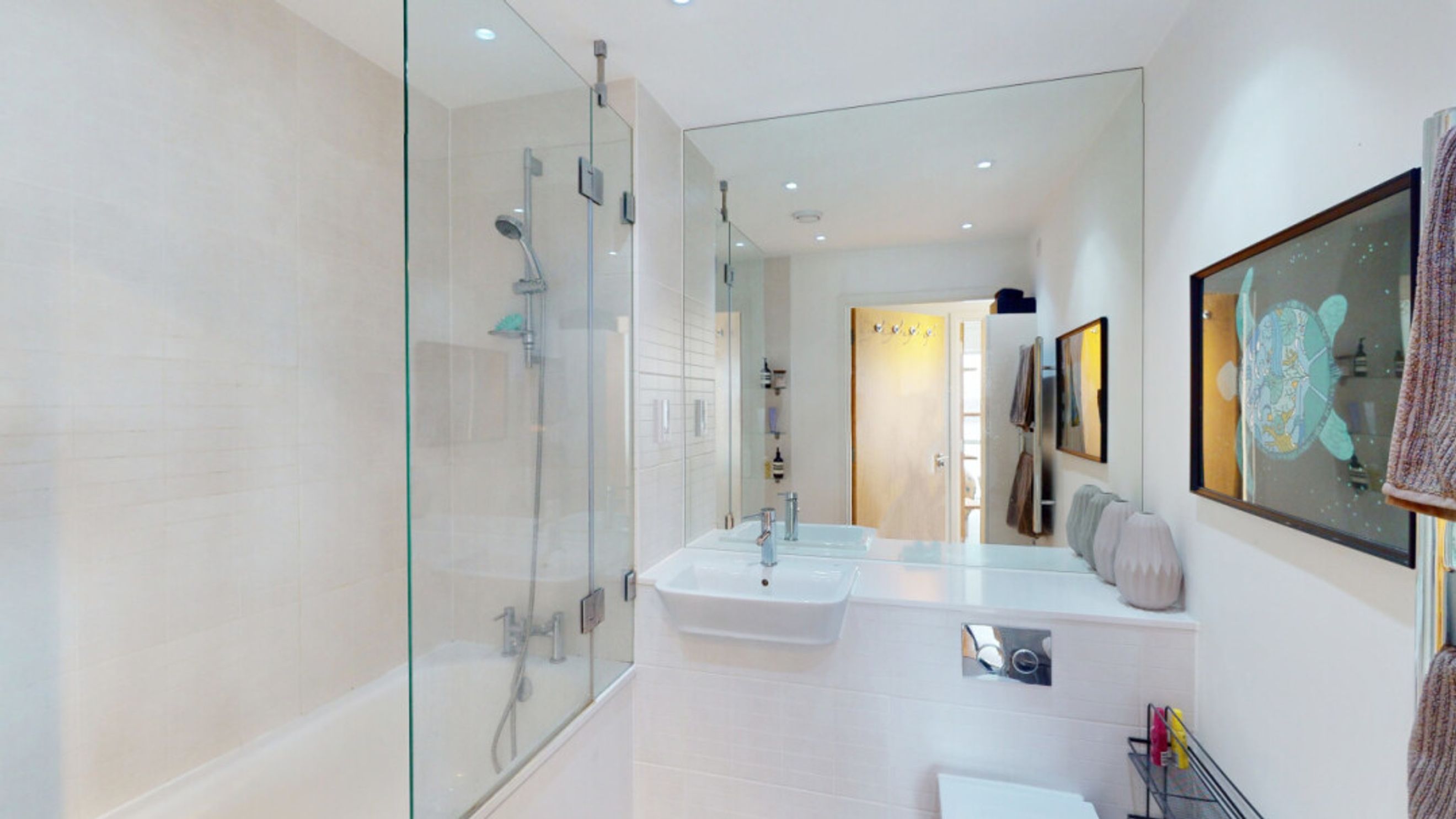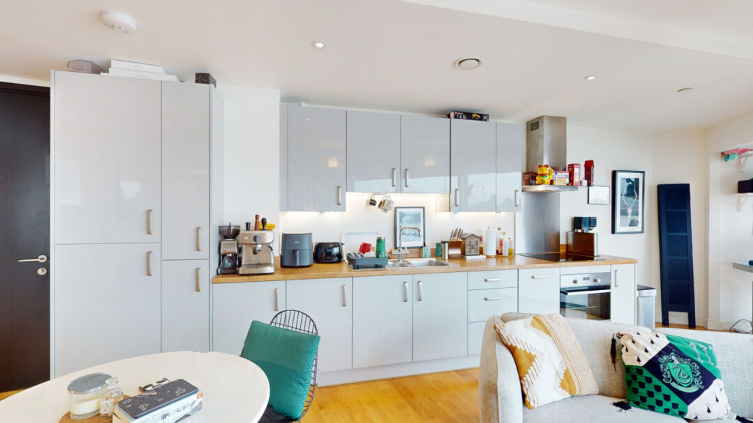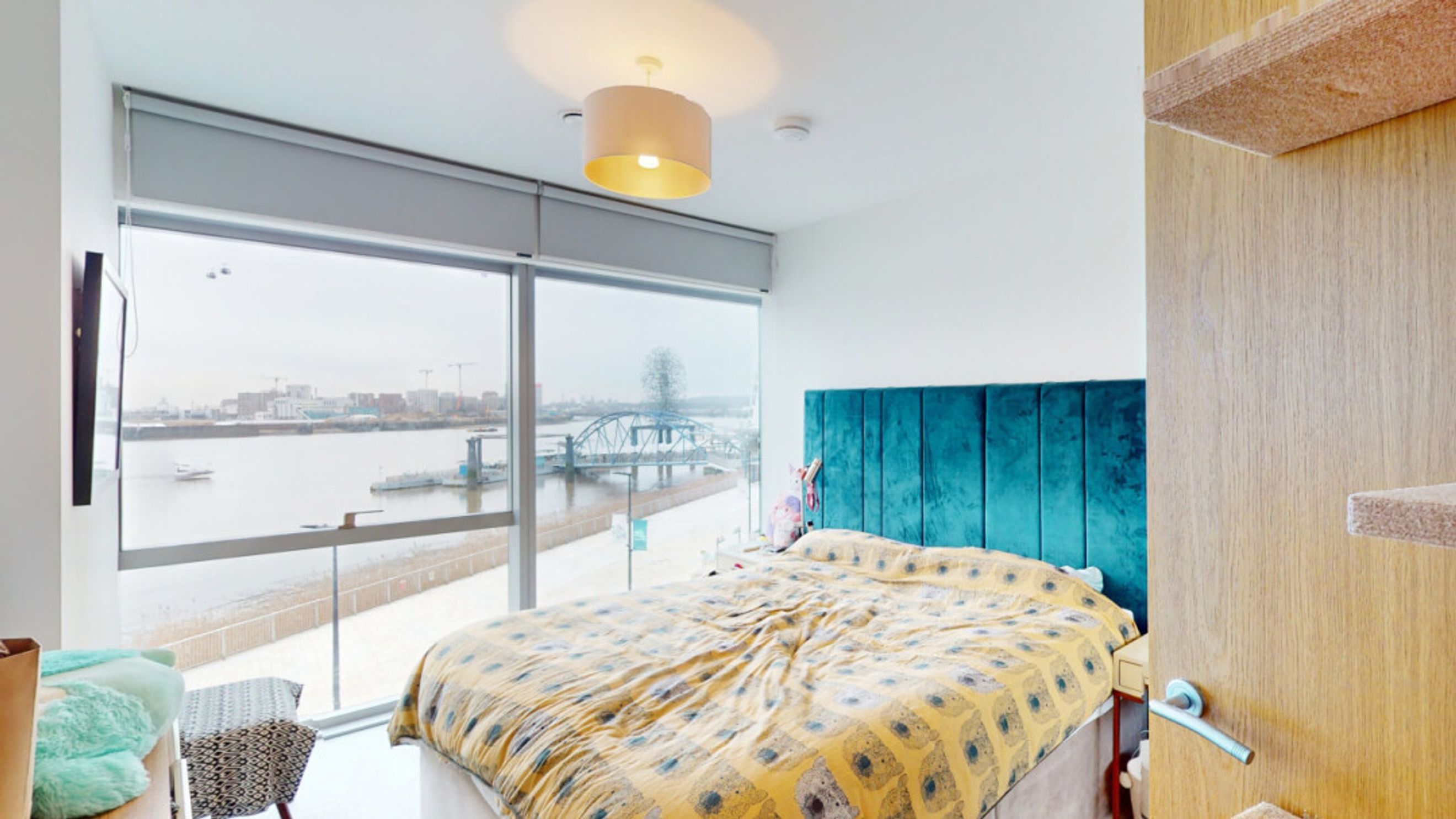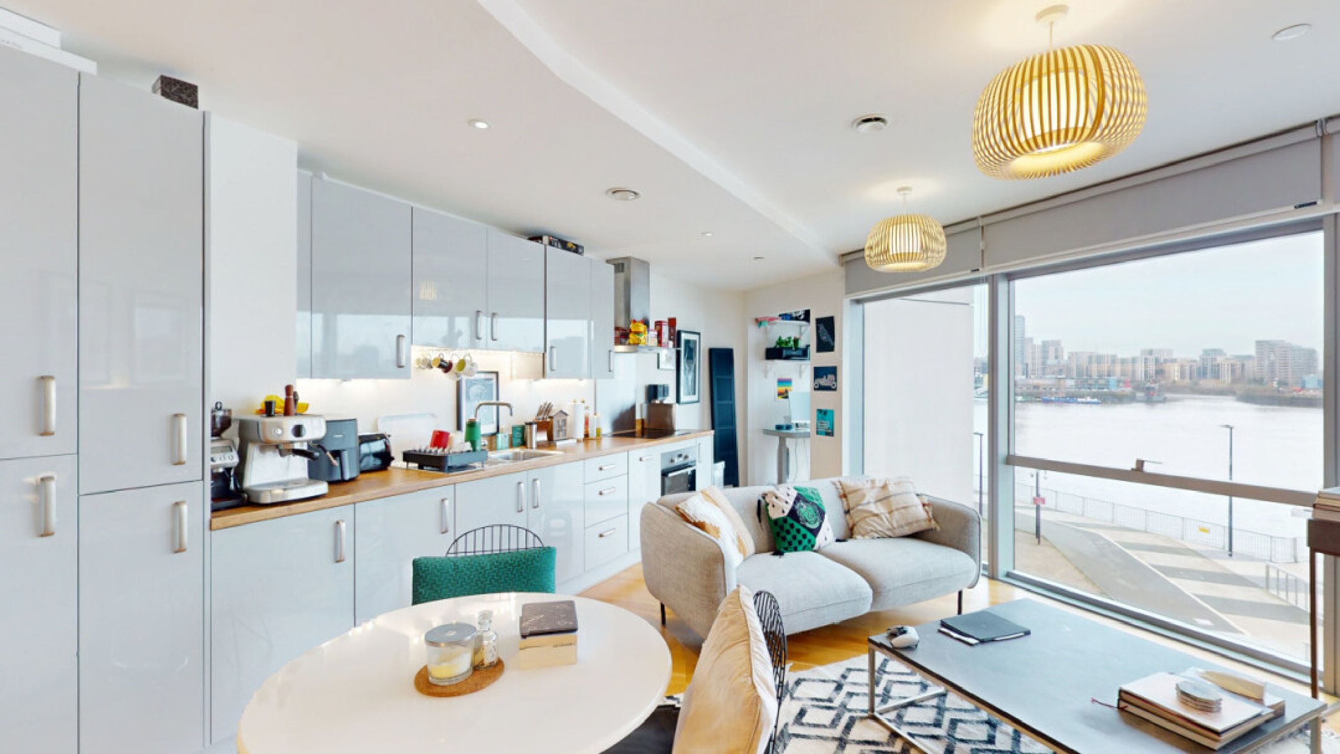 This bright and spacious two bedroom apartment consists of a stylish open-plan kitchen and living area, flooded with natural light from wide floor-length windows. The kitchen is fitted with grey hi-gloss wall and base units, with under-cupboard lighting, and a wooden effect worktop. The kitchen also benefits from integrated appliances, including a fridge freezer, oven, hob, extractor fan and dishwasher. Spacious main double bedroom benefitting from built-in wardrobe with sliding door mirrors. Bright and airy second double bedroom with floor-length windows overlooking the River Thames. The bathroom comes complete with a white three-piece suite with a shower over bath and a stone tile surround. Additional double storage cupboards in kitchen/living area.
