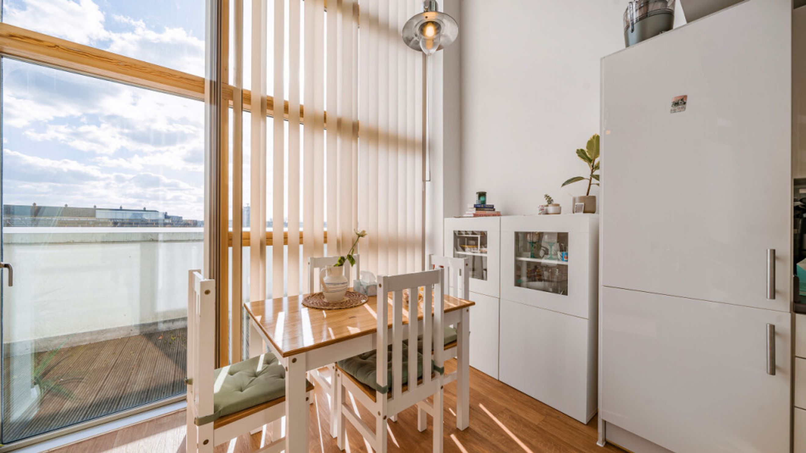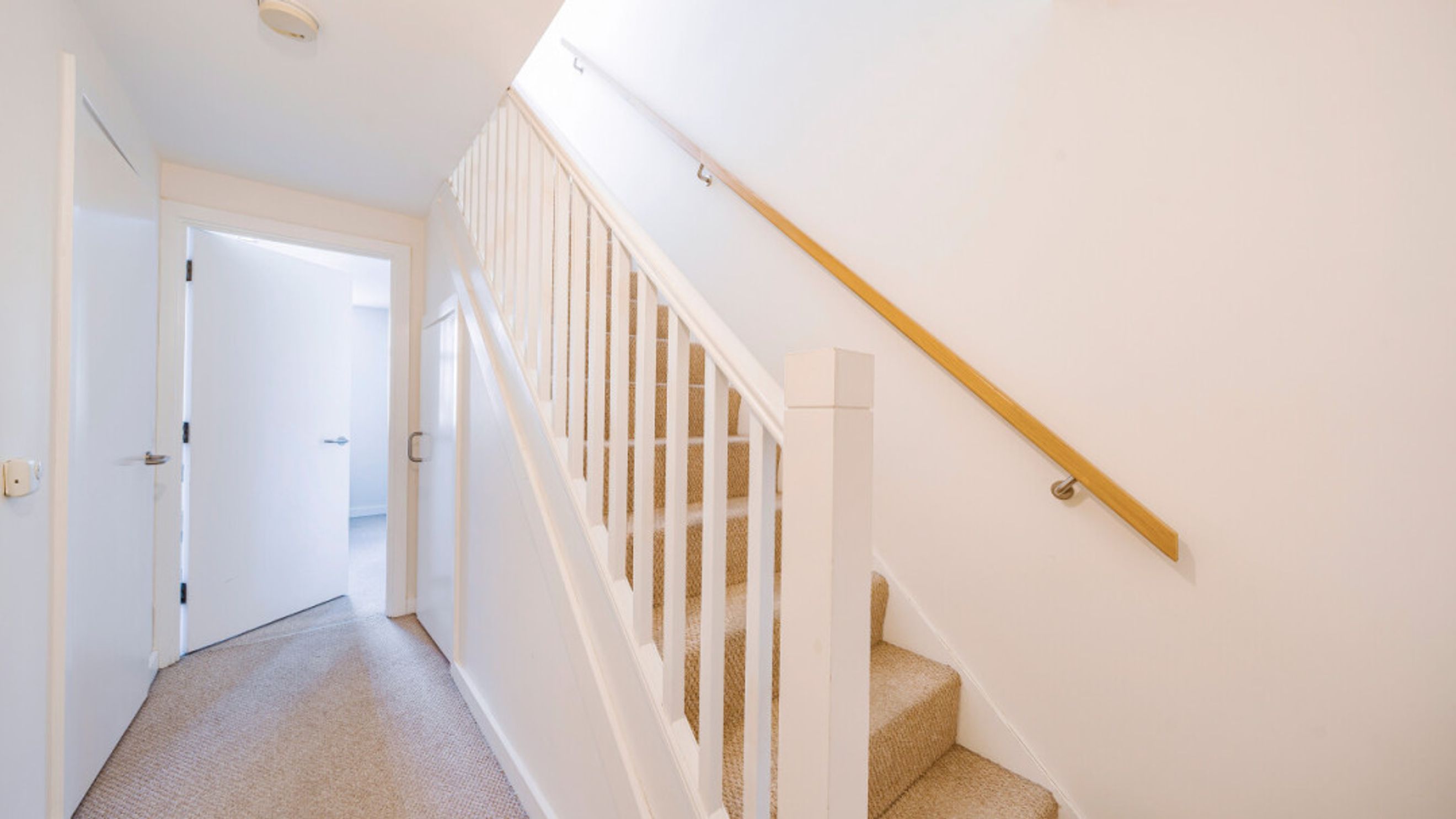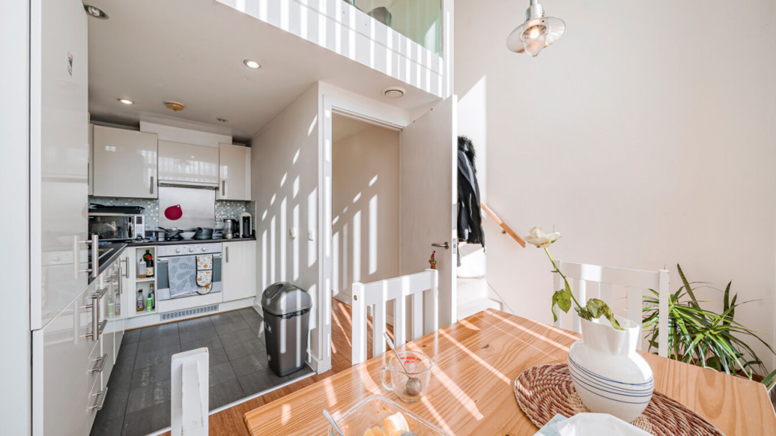Enter the apartment at bedroom level and find two well proportioned double bedrooms and family bathroom with a shower over the bath. Upstairs find a kitchen with a double height dining area, which leads to a private south facing balcony, and stairs to an upper mezzanine reception room. There is also a cloakroom on this level.