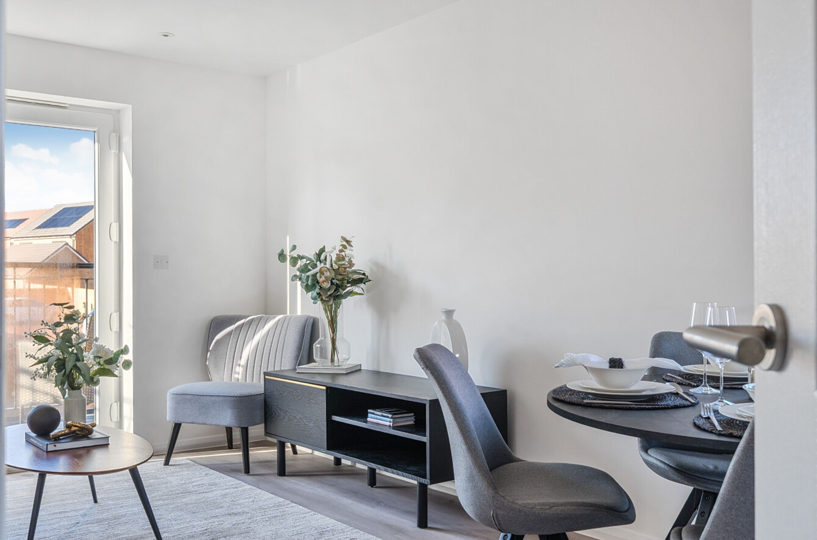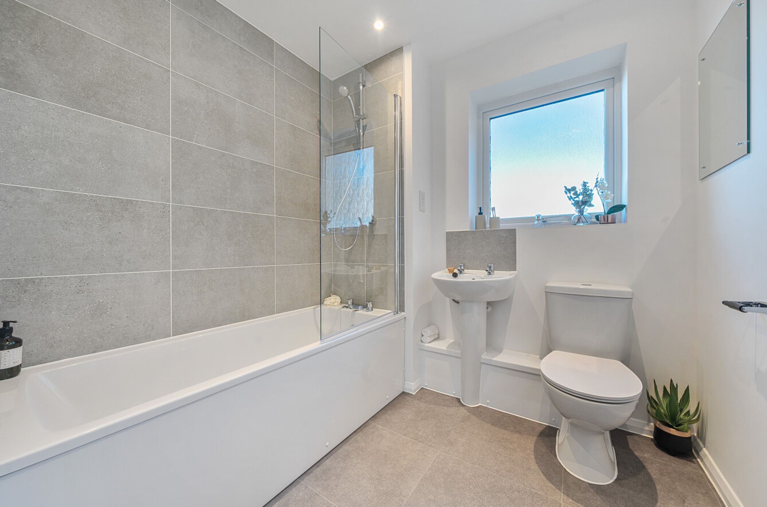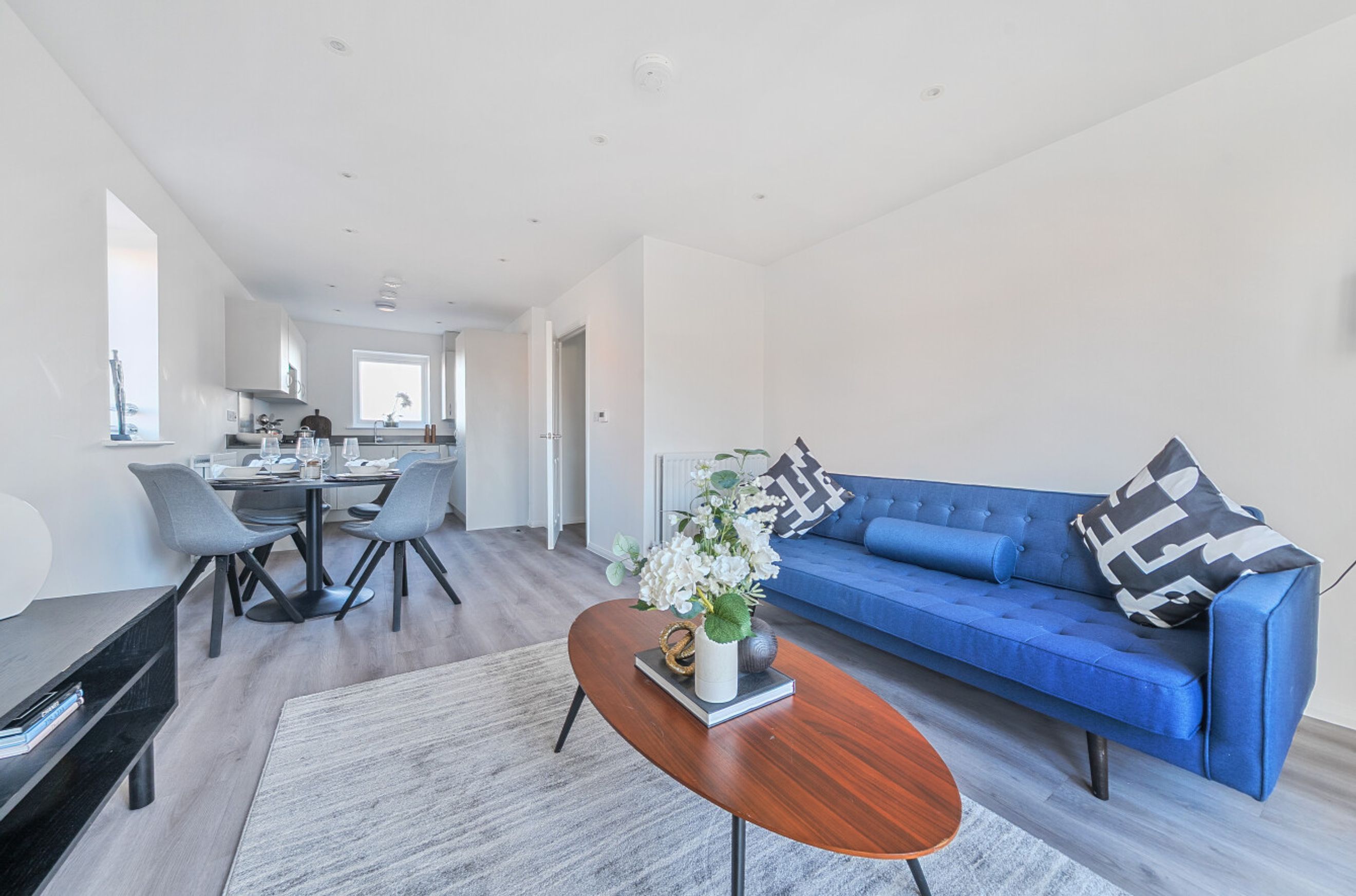 The living spaces are enhanced with contemporary oak grey vinyl flooring, LED lighting, and modern finishes throughout, while the bedrooms are fitted with plush carpeting for added comfort. The bathroom includes a thermostatic mixer tap, chrome heated towel rail, and a mirrored cabinet with a shaver socket.