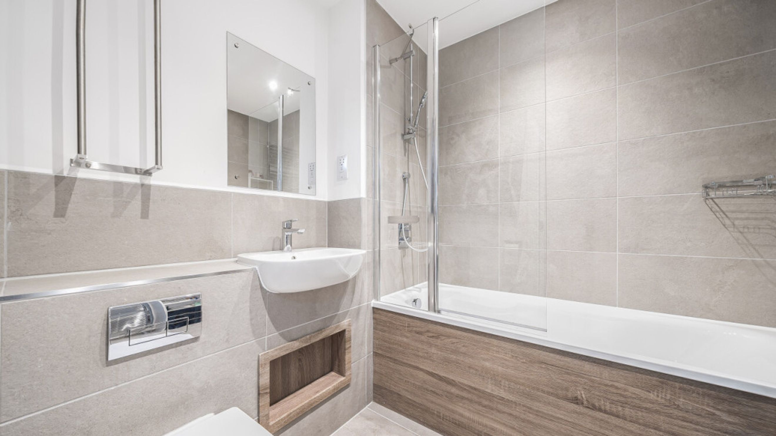 All rooms lead off a central hallway, with two large storage cupboards, in this apartment. There are two generous double bedrooms, the master having benefit of in-built storage and an en-suite shower room. A contemporary family bathroom serves the second bedroom. The main living area has a door opening onto a private patio. The modern kitchen incorporated fully integrated appliances.