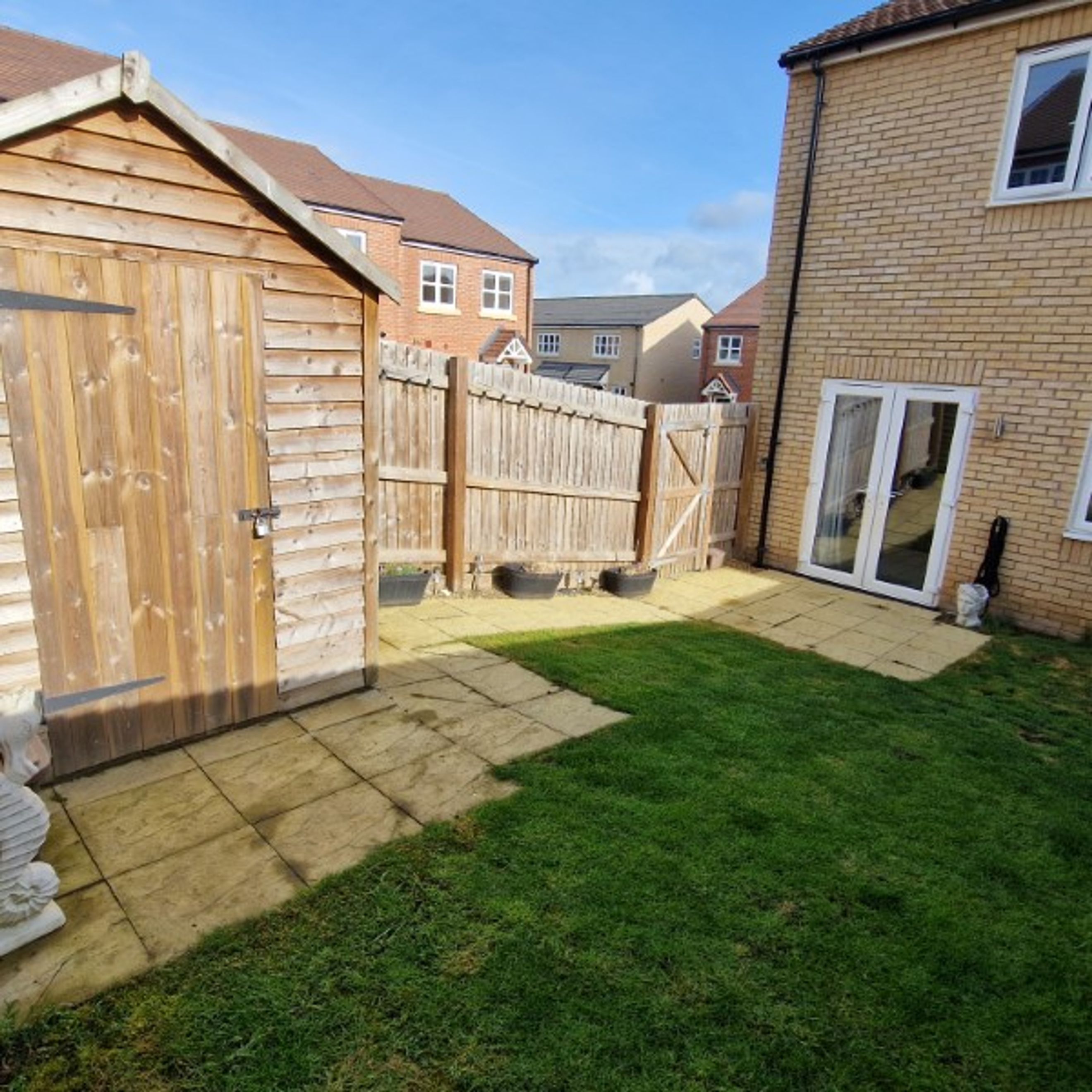 Enclosed private garden with shed.