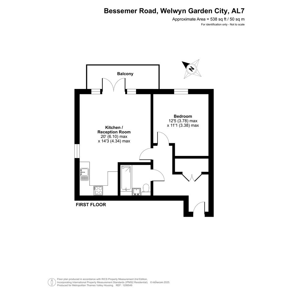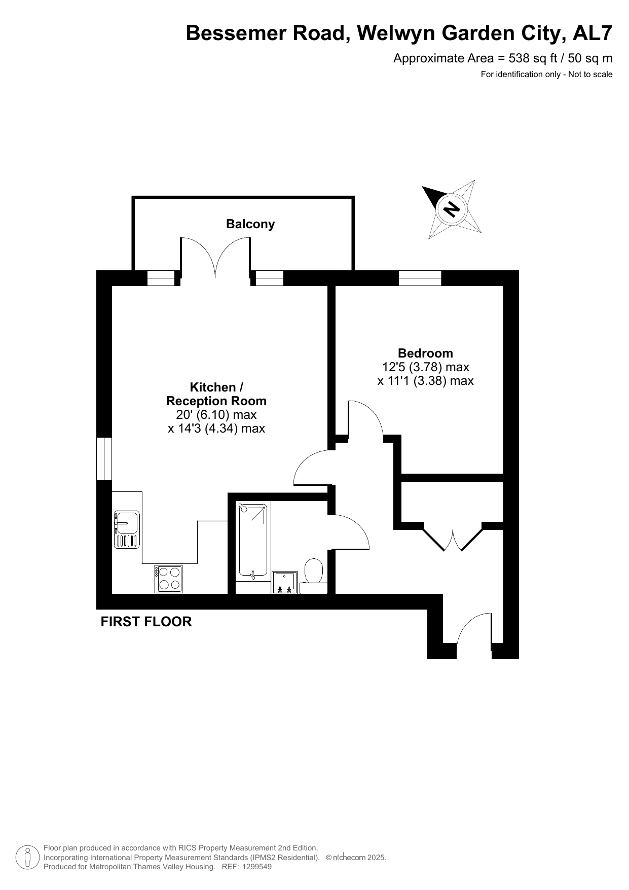 The property features an open plan living room and kitchen, one bedroom, and one bathroom.