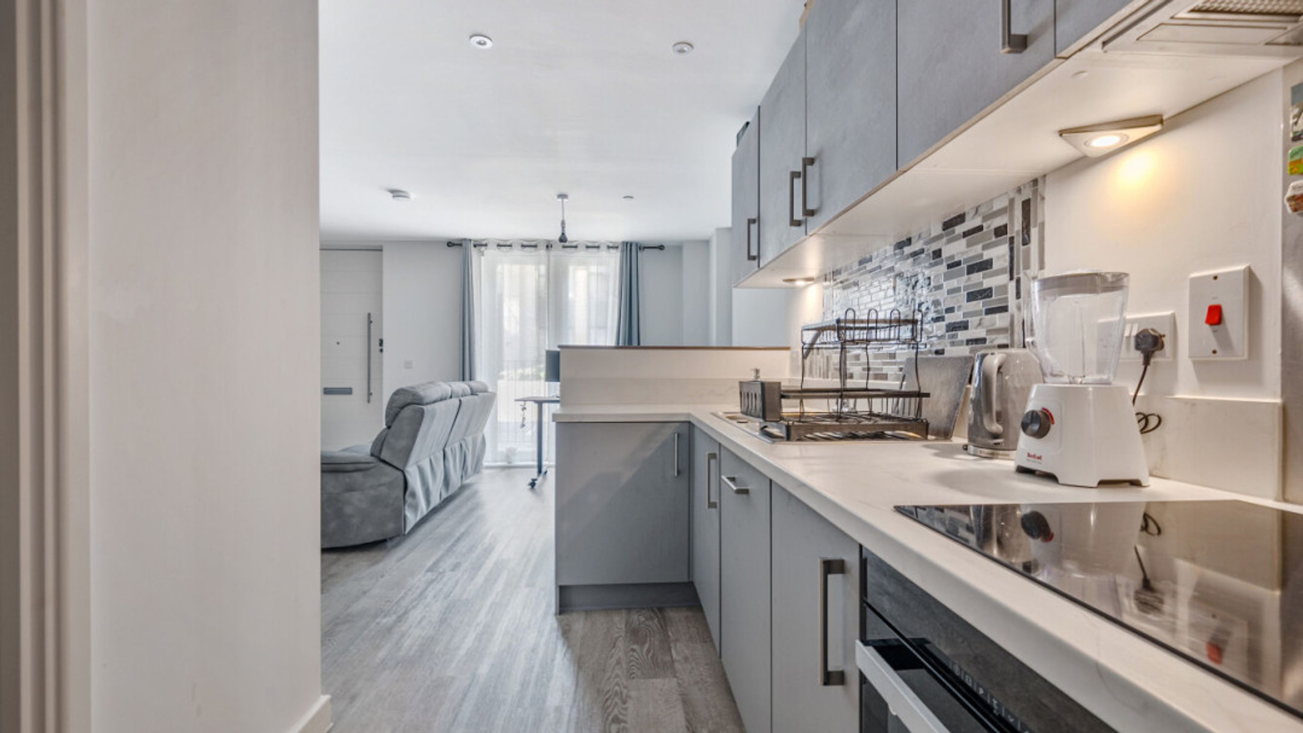 The property, with its own front door leading from a full width south west facing private patio area, boasts a high specification open plan living area on the ground floor, featuring a Symphony kitchen with integrated appliances including fridge freezer and dishwasher. A washer dryer is housed in a separate utility cupboard/cloakroom. On the first floor there are two double bedrooms and two luxury bathrooms, one en suite and which also opens onto a juliette balcony. The property benefits from an allocated parking space.