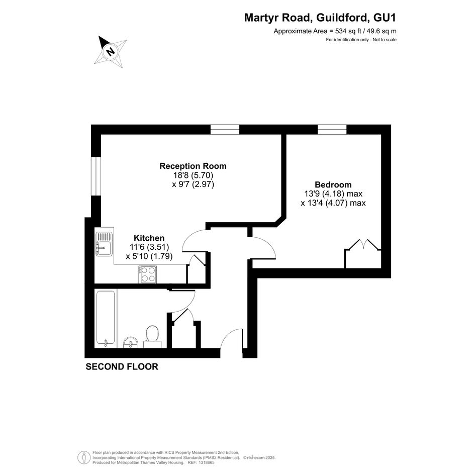 The property on the second floor comprises an entrance hall, a living room with a modern open-plan kitchen, one large bedroom, and a bathroom.