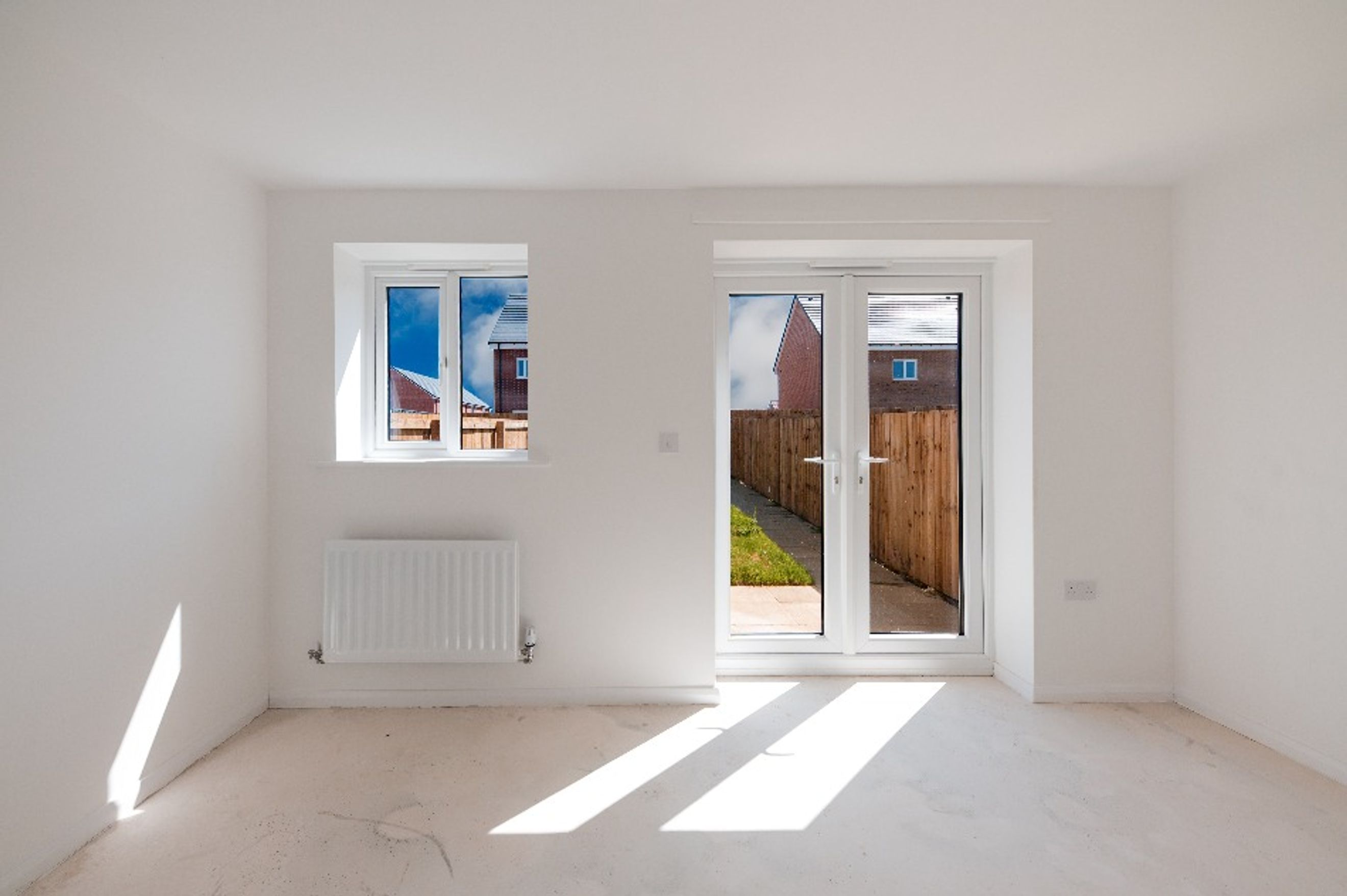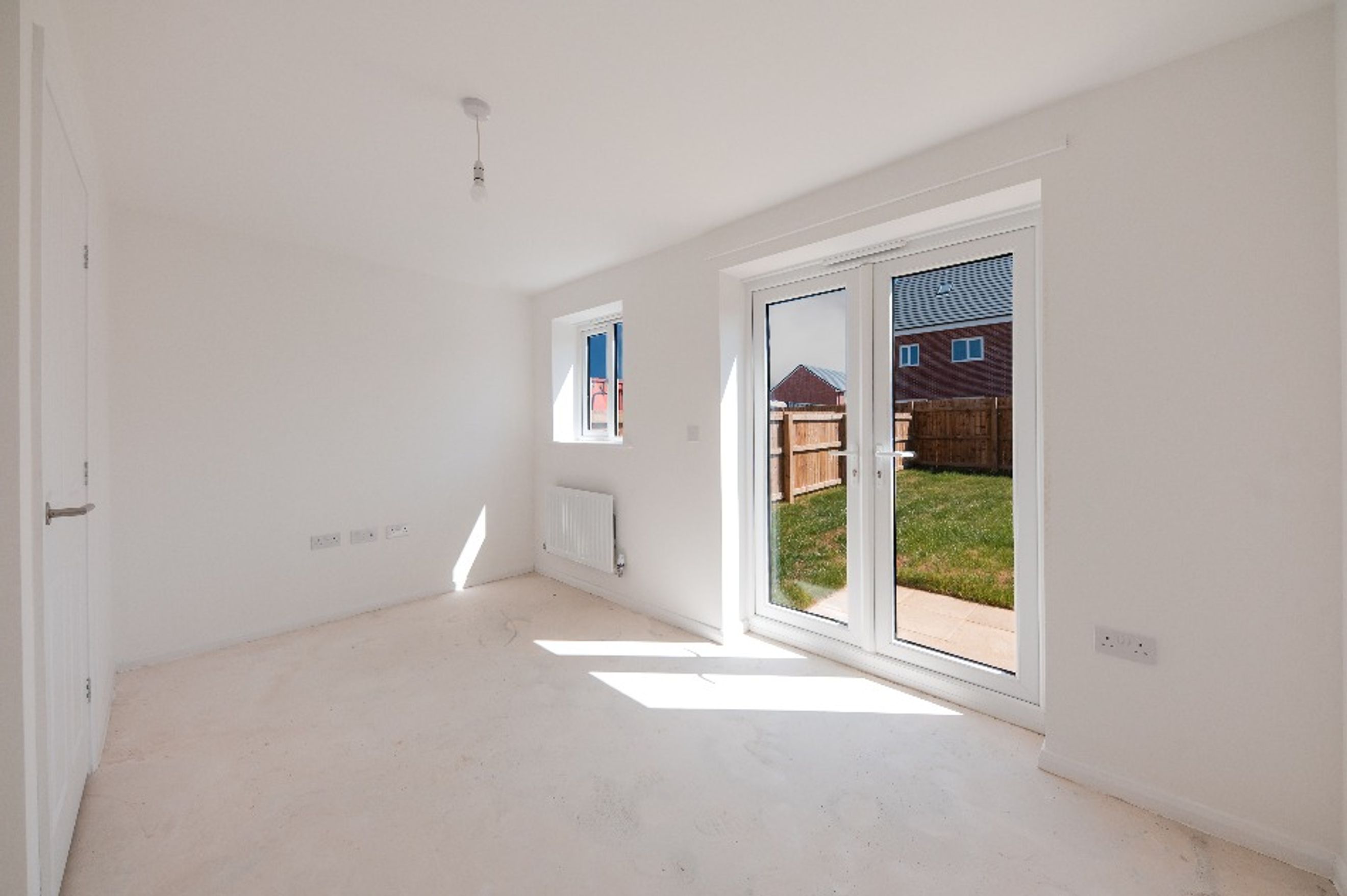- Living room with double patio doors opening to rear garden