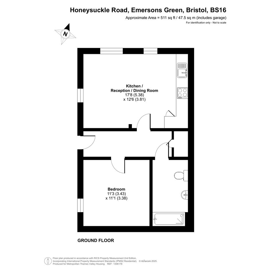 The property features an entrance hallway, an open plan kitchen and living room, one bathroom and a communal garden.