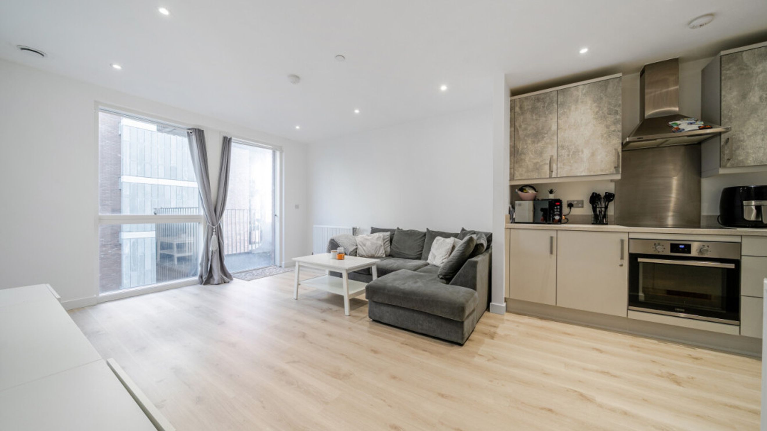 Enter this well presented west facing apartment via an entrance hall with two useful storage cupboards. To your right find a contemporary bathroom. The double bedroom has the benefit of a mirrored wardrobe. The large open plan reception area includes a modern kitchen with integrated appliances, and opens onto a private balcony overlooking a communal courtyard.